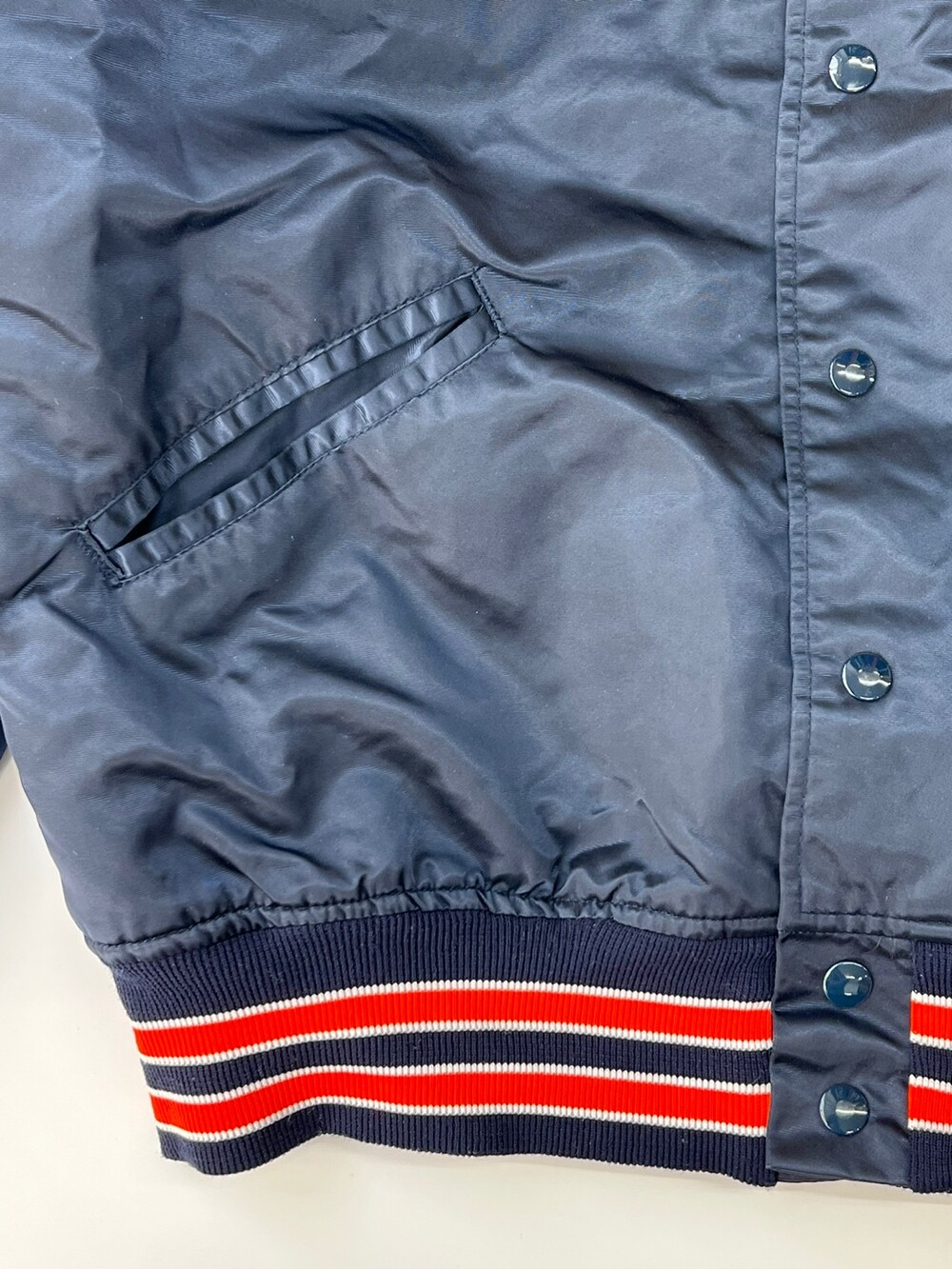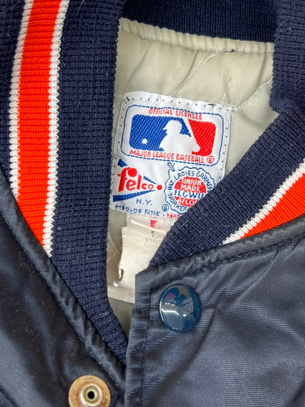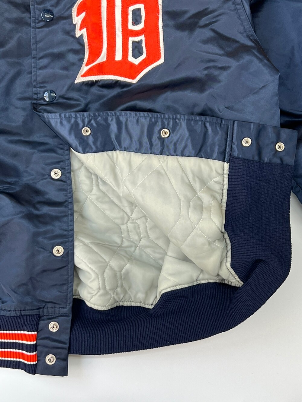 펠코(Felco)의 스타디움 자켓은 동일 연식의 스타터(Starter) 제품에 비해 소매나 밑단 립 너비가 여유로워 정사이즈로 입어도 좋지만, 오버사이징 했을 때 소매나 밑단 실루엣이 자연스럽게 떨어져 스타터의 팀 자켓에 비해 사이즈 범용성이 좋은 제품입니다. 메이저리그 참가하는 아메리칸 리그 중부지구 소속 디트로이트 타이거스(Detroit Tigers)를 상징하는 컬러인 네이비 베이스 위에 오렌지 컬러 로고와 스트라이프가 포인트가 되는, 애슬래틱한 무드의 배색이 돋보이는 제품입니다.