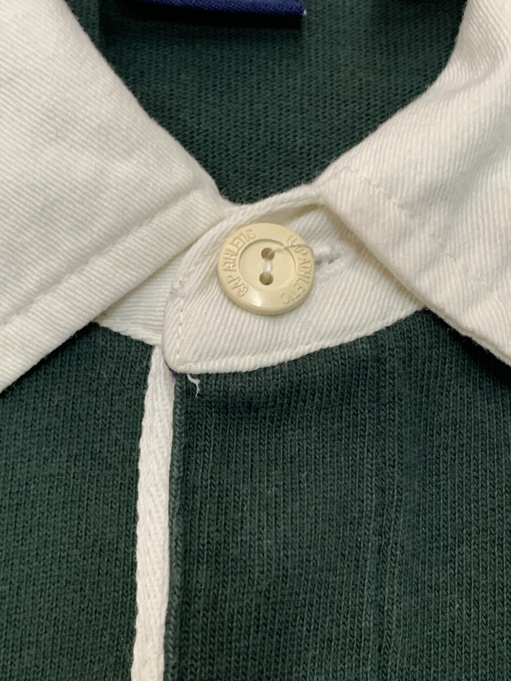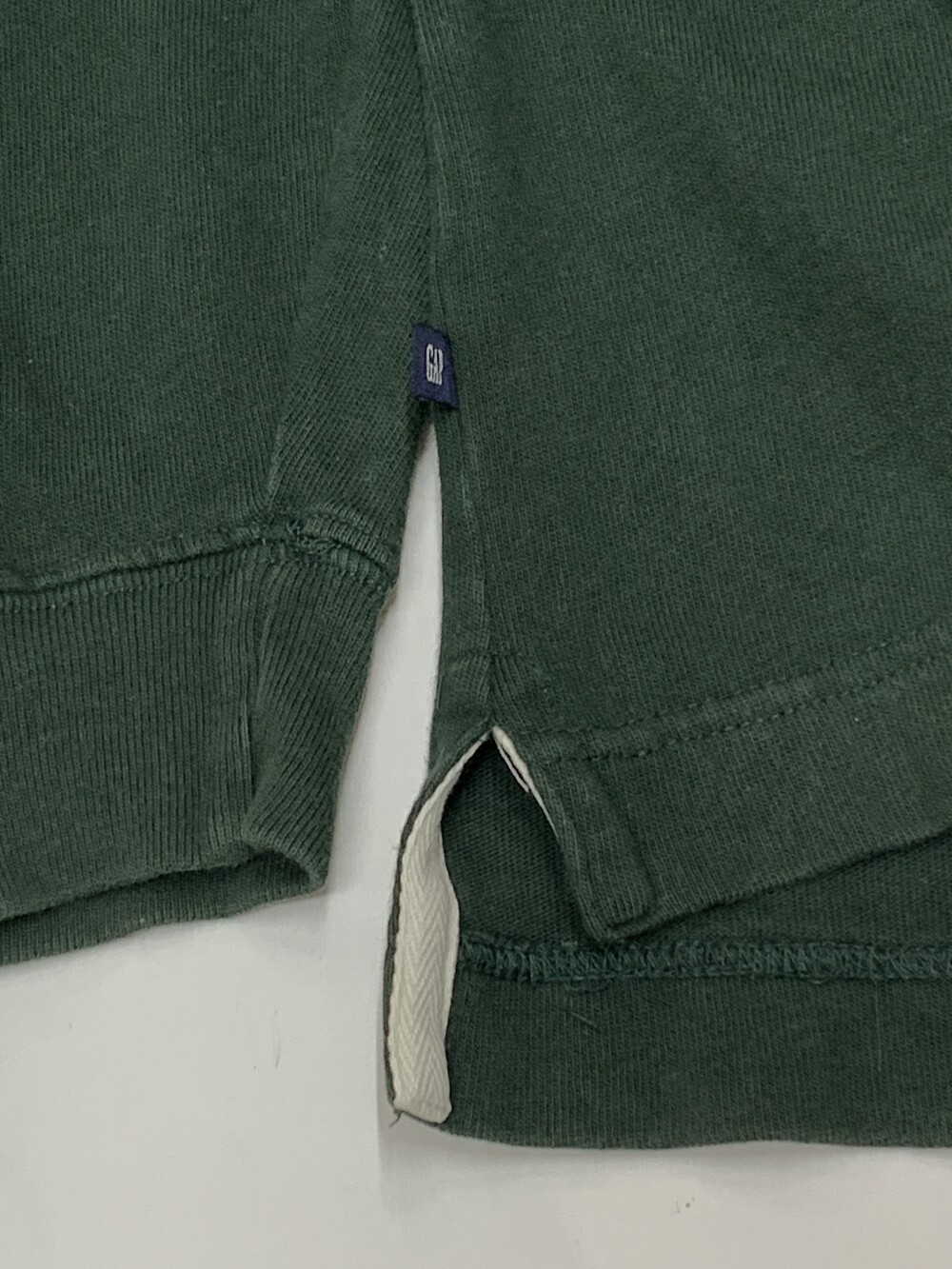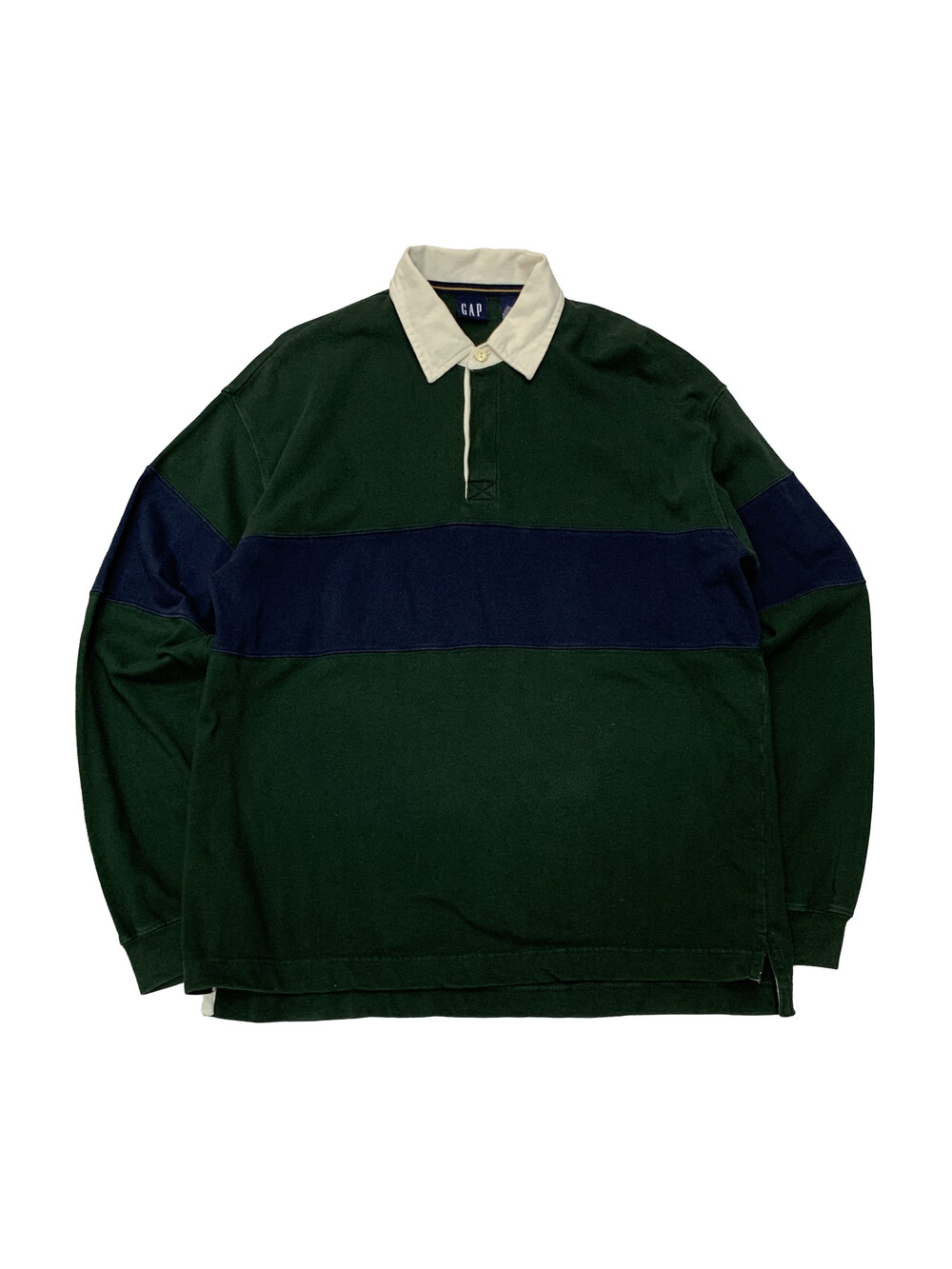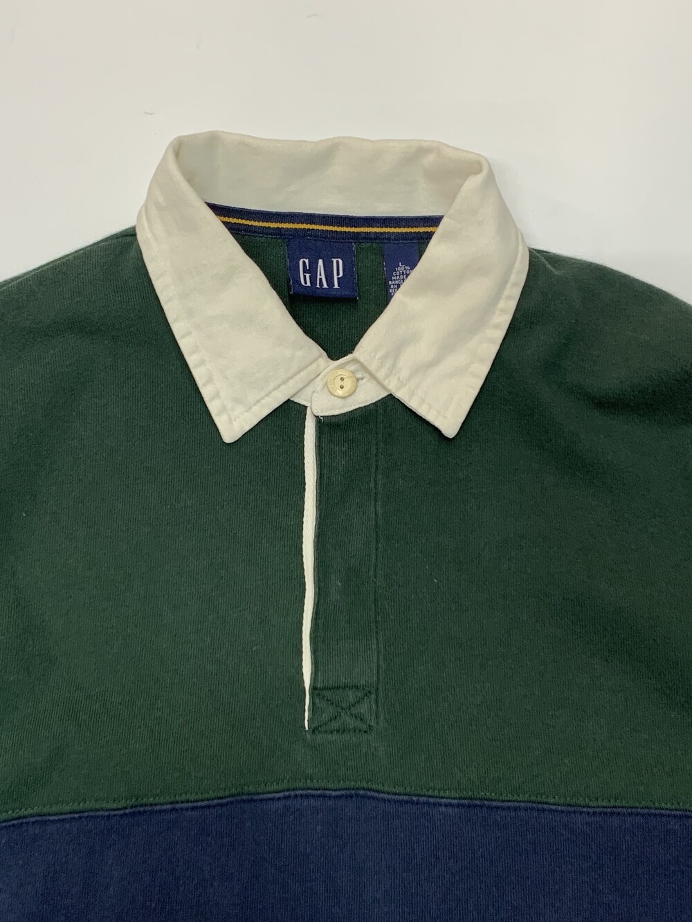 비교적 얇고 유연한 트윌 원단, 고무단추 형태를 그대로 본따 만든 플라스틱 버튼, 타이트하지 않은 소매 립 등 등 클래식한 럭비셔츠의 구성요소를 보다 캐주얼하게 즐길 수 있을만한 2000년대 생산 올드 갭의 럭비 셔츠. 차분한 배색으로 다양한 컬러의 하의와 매치하기 좋을만한 제품입니다.
