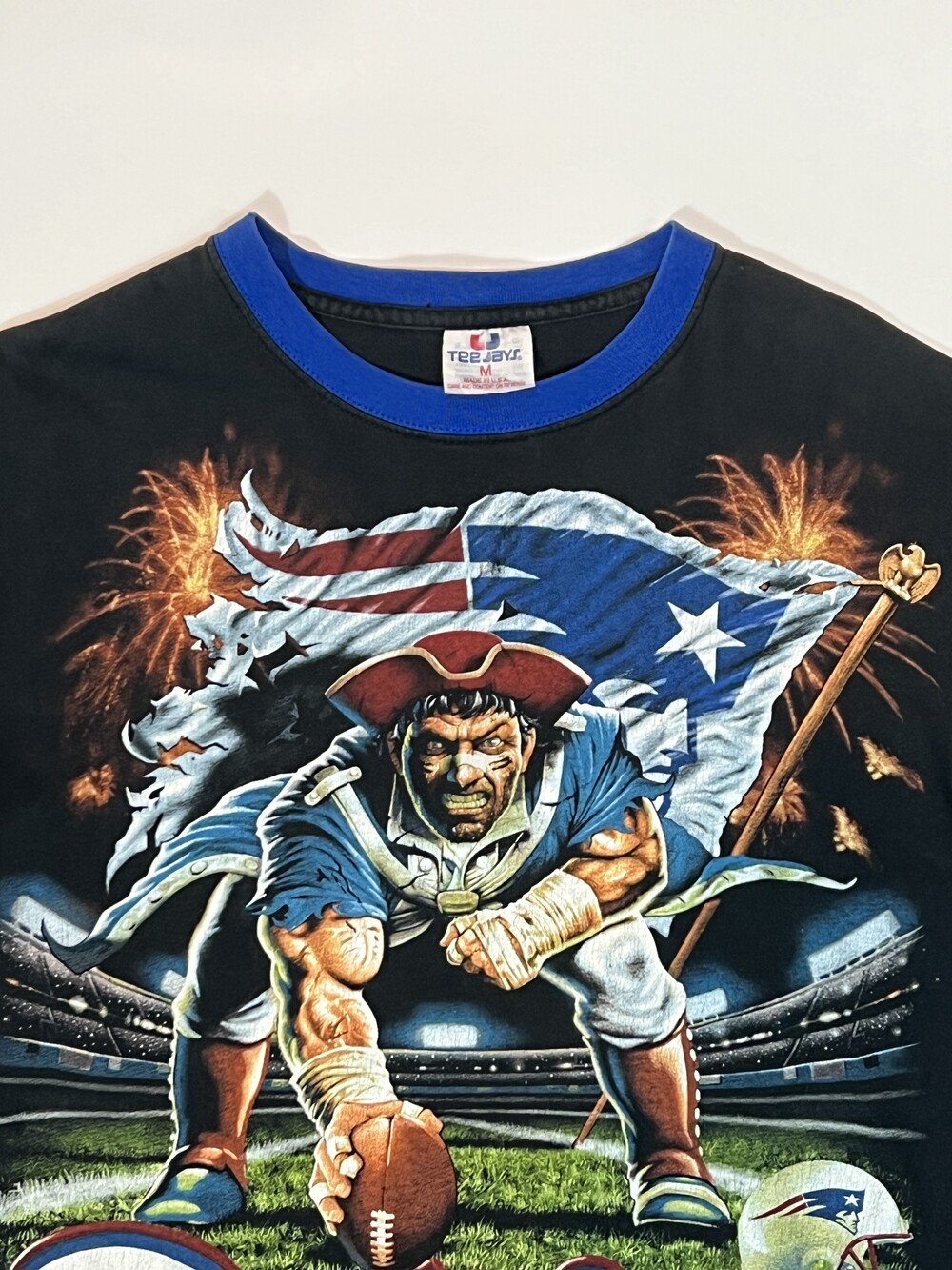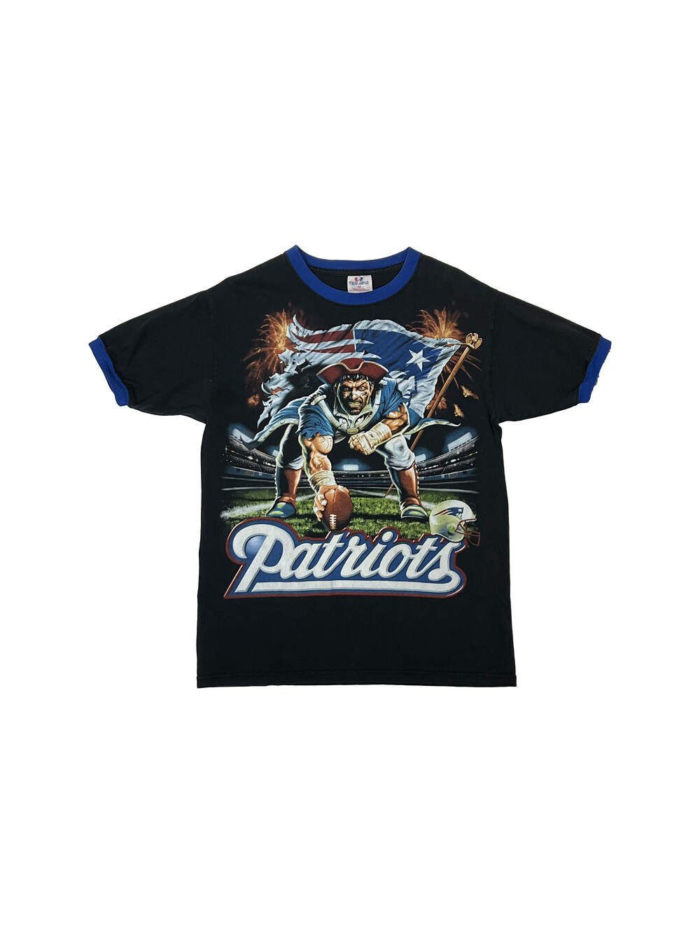 미국 프로미식축구 리그 NFL 소속 뉴잉글랜드 패트리어츠 프린팅이 올려진 링거 티셔츠. 보스턴을 대표하는 팀으로 애국자라는 뜻의 패트리어츠다운 성조기 배색의 군복을 입은 군인 프린팅이 돋보이는 제품입니다.