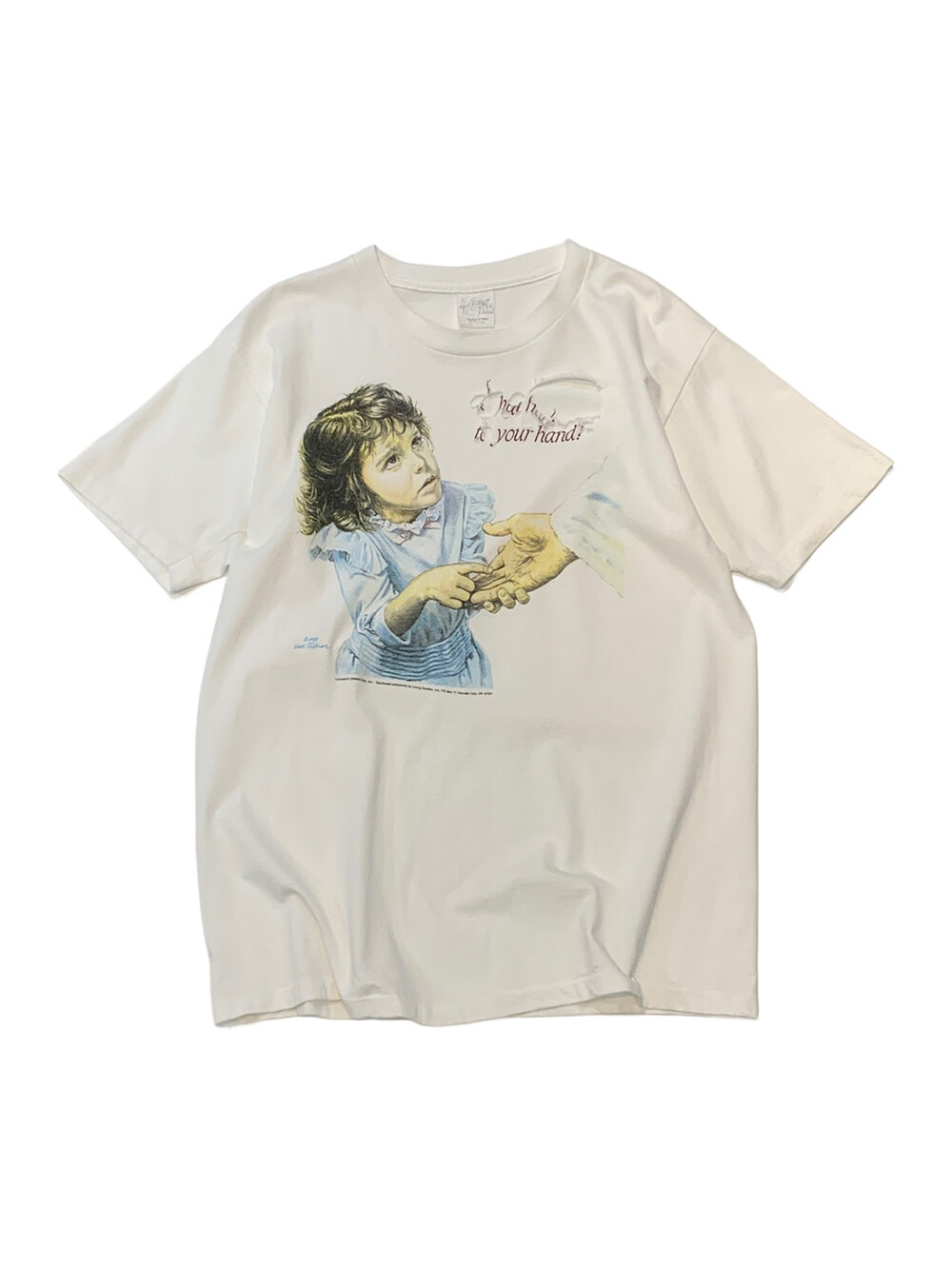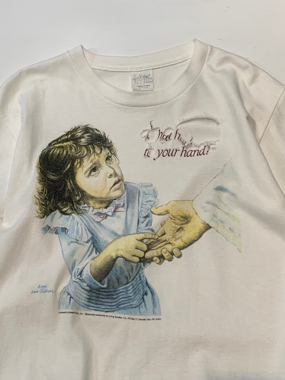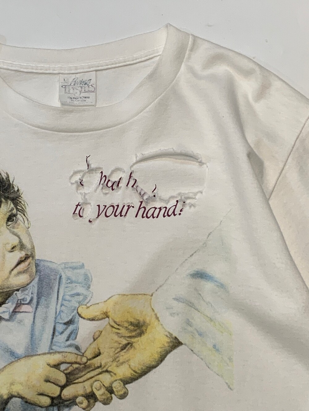 못 박혀 자국이 남은 예수님의 손을 가리켜 What Happened to your hand? 라고 묻는 소녀의 프린팅이 올려진 티셔츠입니다. 1995년 The Hackers 라는 영화에서 배우 매튜 릴라드(matthew lillard)가 연기한 캐릭터가 소매와 밑단을 잘라 입고 나온 장면을 확인할 수 있습니다. 바디가 삭아 전면부에 크게 데미지가 발생한 제품이나, 착용 시 크게 민망하지는 않을만한 부위인지라 별도의 수선없이 판매합니다. 이너에 롱슬리브를 레이어드하거나 그런지한 분위기를 살려 맨살이 드러나도록 단품으로 착용하거나 셔츠 이너로 착용해도 좋을만한 제품입니다.