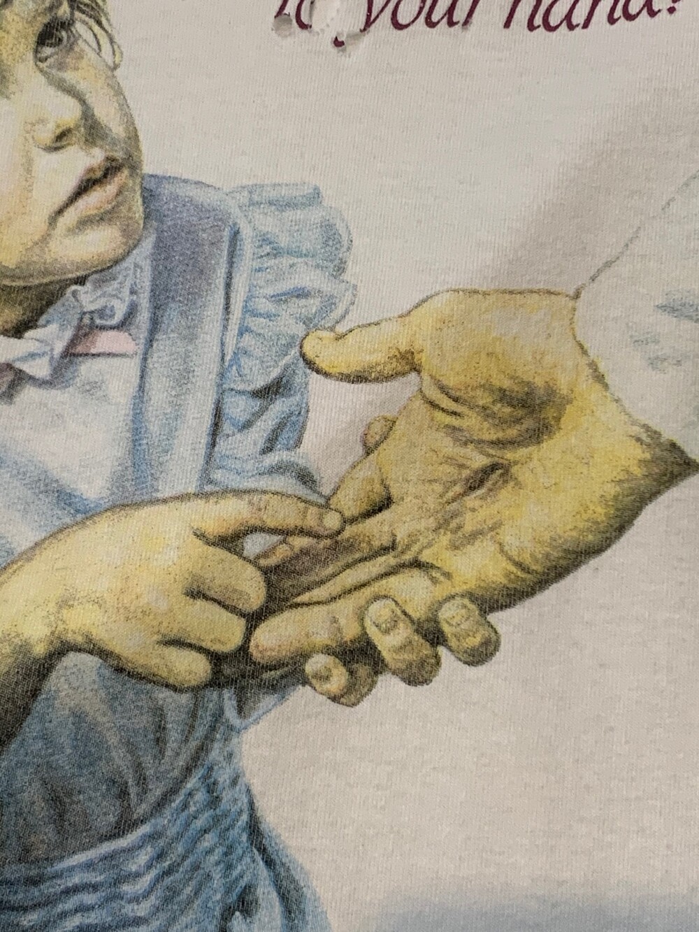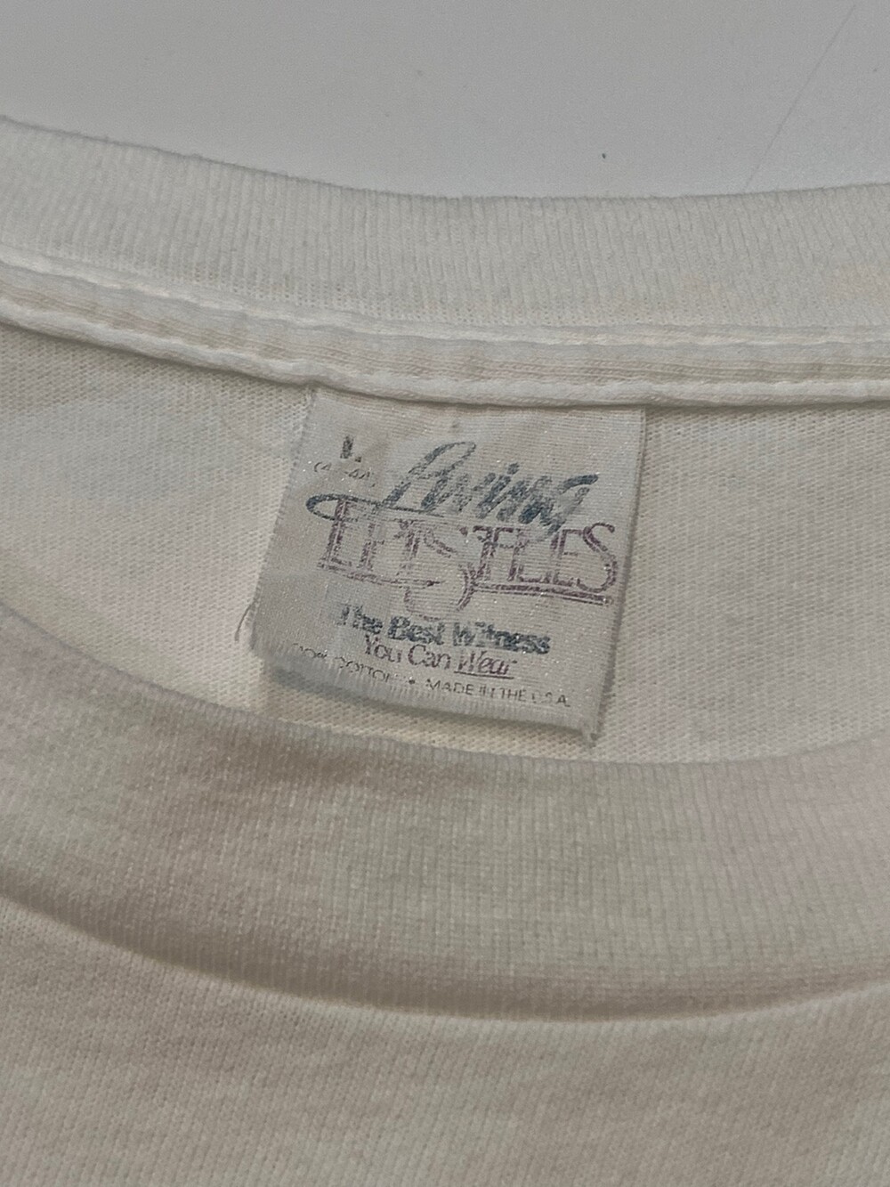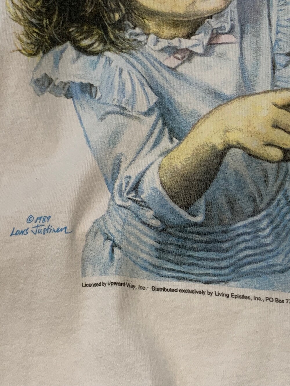 못 박혀 자국이 남은 예수님의 손을 가리켜 What Happened to your hand? 라고 묻는 소녀의 프린팅이 올려진 티셔츠입니다. 1995년 The Hackers 라는 영화에서 배우 매튜 릴라드(matthew lillard)가 연기한 캐릭터가 소매와 밑단을 잘라 입고 나온 장면을 확인할 수 있습니다. 바디가 삭아 전면부에 크게 데미지가 발생한 제품이나, 착용 시 크게 민망하지는 않을만한 부위인지라 별도의 수선없이 판매합니다. 이너에 롱슬리브를 레이어드하거나 그런지한 분위기를 살려 맨살이 드러나도록 단품으로 착용하거나 셔츠 이너로 착용해도 좋을만한 제품입니다.