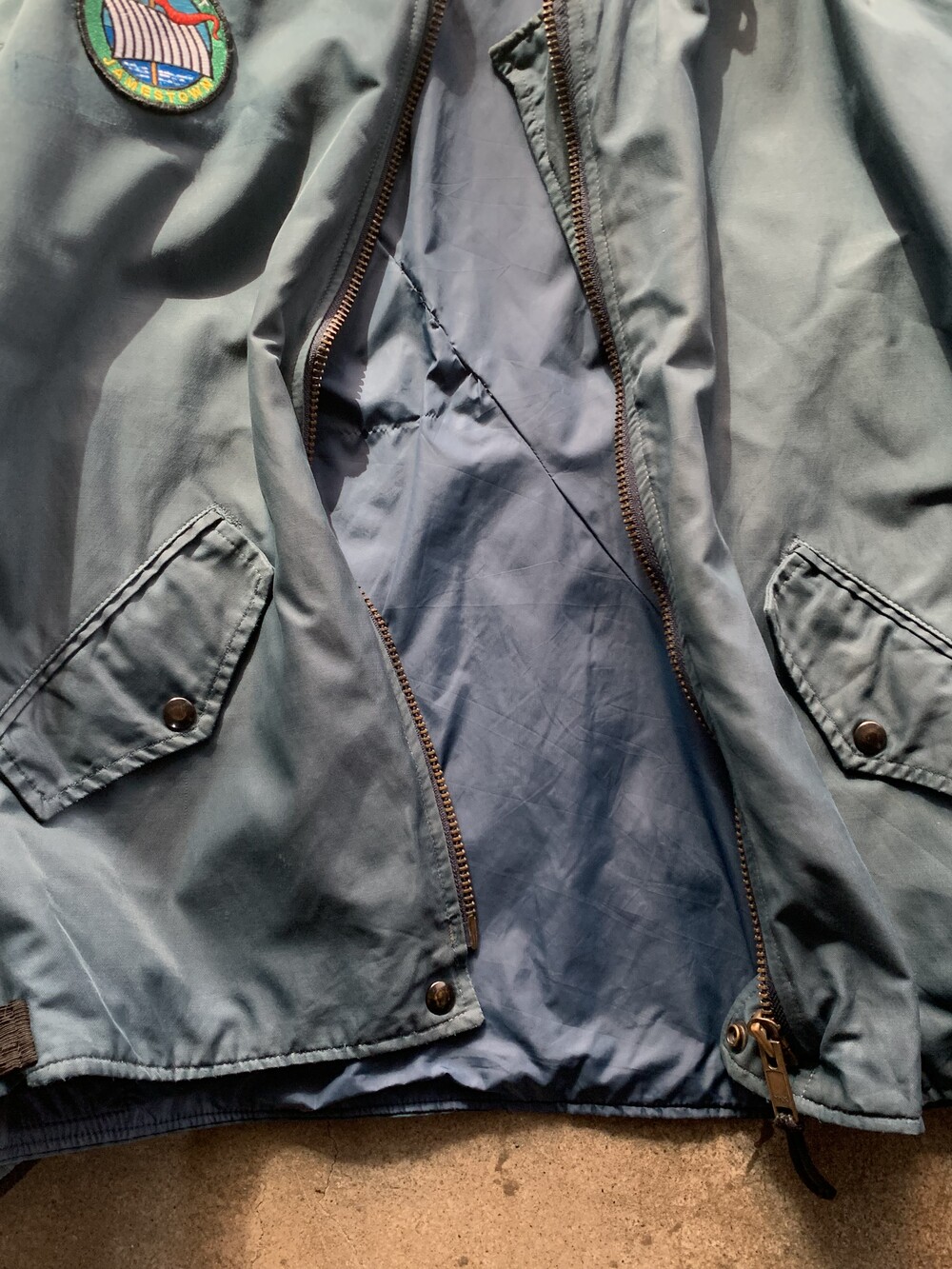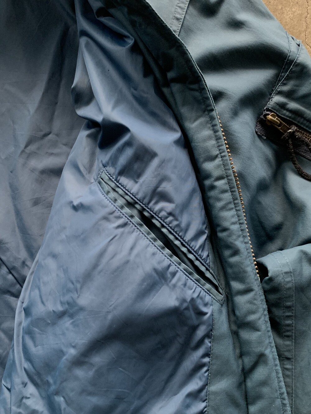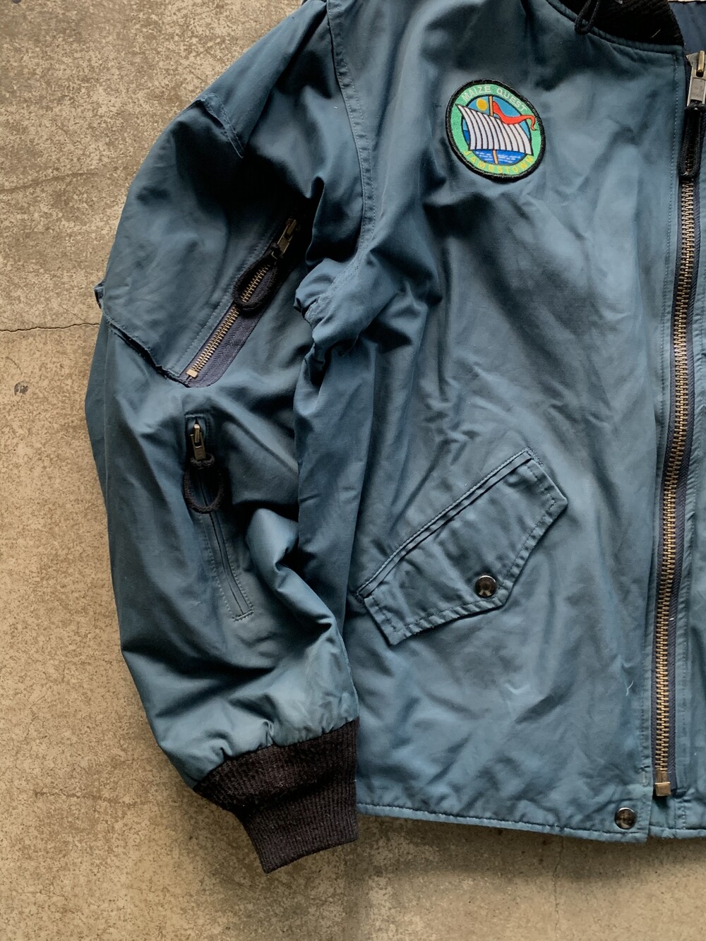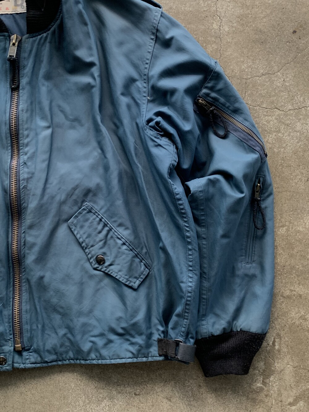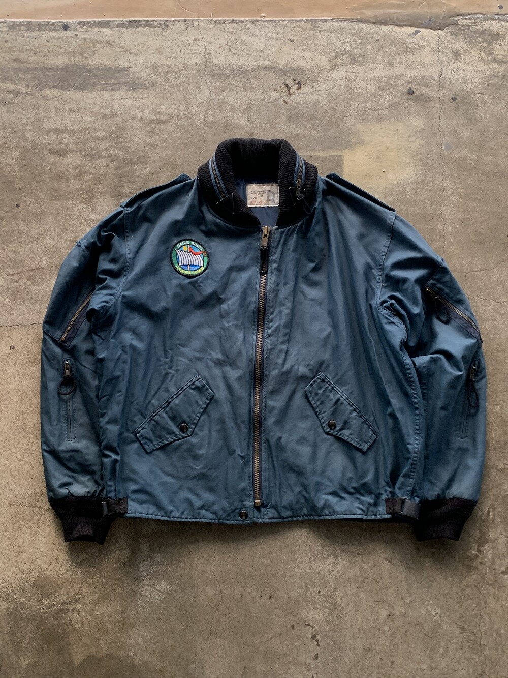 🚩Detail 1990년부터 2000년대까지 왕립 캐나다 공군 소속 파일럿과 승무원들에게 보급된 플라이트 자켓입니다. 가벼우면서도 내구성을 갖춘 나일론/코튼 혼방 원단과 오묘한 블루 컬러가 돋보입니다. 조종석에 앉은 파일럿이 착용 간 활동이 용이하게끔 크롭한 기장감과 밑단 립 대신 측면 스트랩으로 조절 가능한 어드저스터, 양쪽 소매애 배치된 수납용 포켓의 존재를 알리는 지퍼 배치가 군복 특유의 억세고 터프한 이미지보다는 컨템포러리한 미감을 보이는 제품입니다.