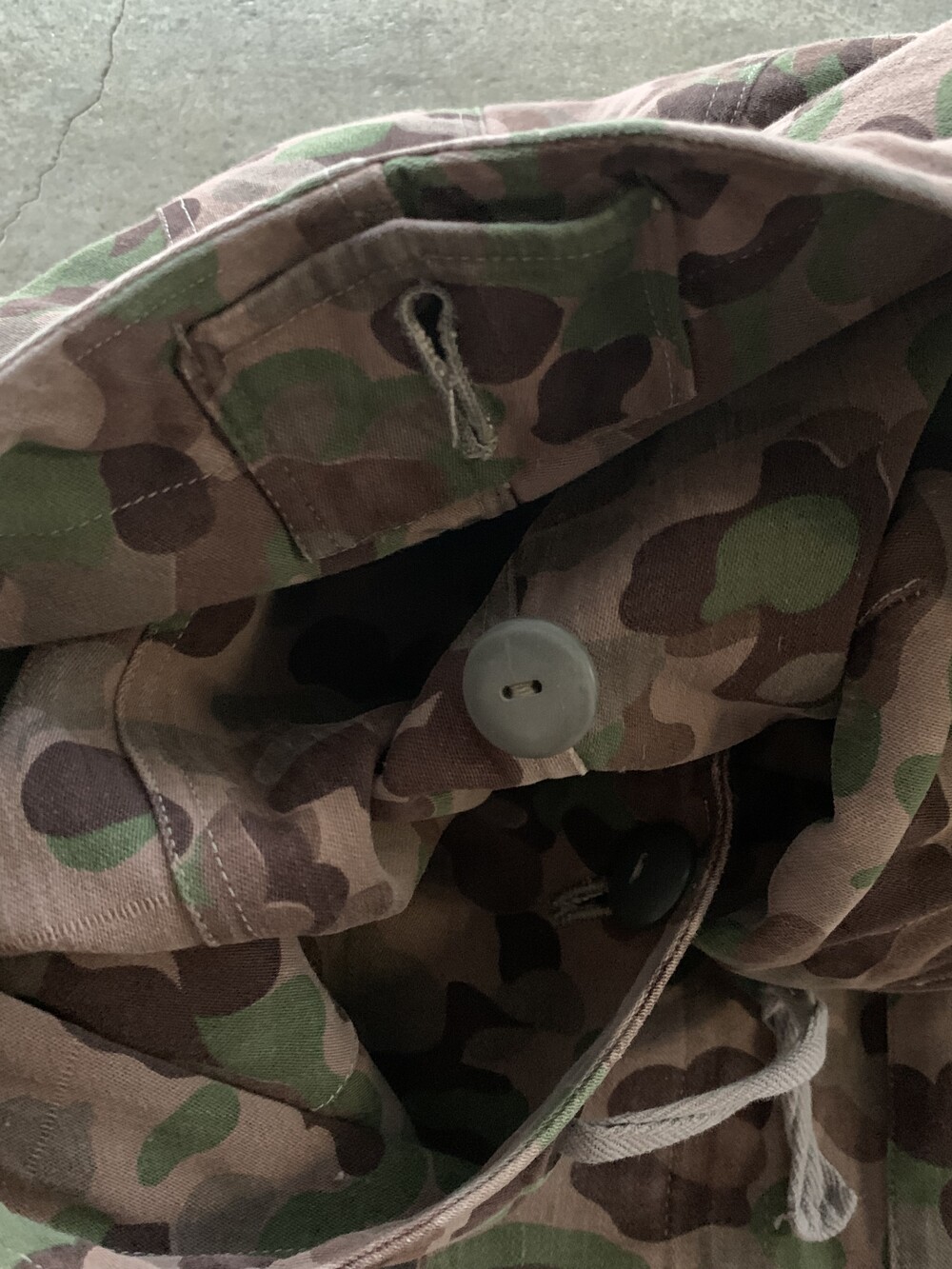 🚩Detail 1950년대부터 1970년대 사이에 오스트리아 군에 지급된 피시테일 파카입니다. KAZ 57 이라 불리우는 특징적인 피 도트(Pea Dot) 카모플라주 패턴은 세계 2차대전 당시 독일군이 사용했던 위장 패턴 Erbsenmuster의 도트 패턴에서 영향을 받아 고안된 것으로, 유럽의 삼림 지대 환경에서 효과적인 위장을 위해 그린, 브라운, 올리브, 베이지 등의 다양한 색상의 점이 불규칙적으로 찍힌 형태가 돋보입니다. 크게 1950년대에 한정적으러 생산된 전기형과 1950년대 후반부터 생산된 후기형이 있는데, 해당 제품은 전면 아웃포켓 부분에 플리츠가 생략된 후기형으로 전면 히든버튼 디테일과 어울리는 미니멀한 미감이 특징적입니다. 쉘 자켓 본연의 역할에 충실하게끔 방풍 및 통풍을 위한 디테일이 배치되어 있으며 다양한 이너 혹은 미들레이어와 매치하여 보온성을 보완할 수 있게끔 군용파카다운 여유로운 사이즈를 보입니다. 사용감이 어느정도 있는 제품으로, 100-105호 사이로 착용하는 분들에게 권장드립니다.