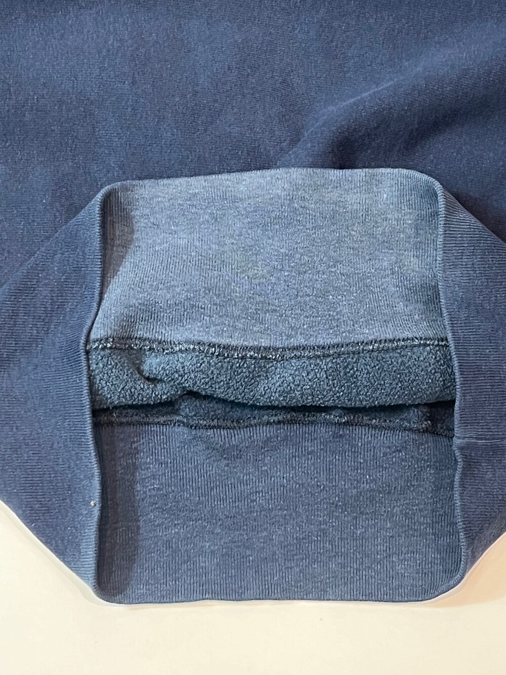 몸판 원단 결이 가로방향을 향하도록 원단 재단방향을 90도로 돌려 재단하는 호리즌탈 위브 타입 중에서도 가장 대표적인 메이커인 챔피온의 리버스위브 스웻셔츠입니다. 전면에 별도의 프린팅이나 자수 로고가 없는 블랭크 모델입니다.