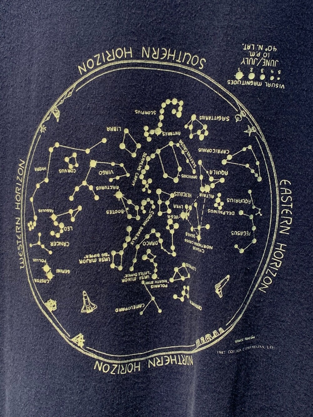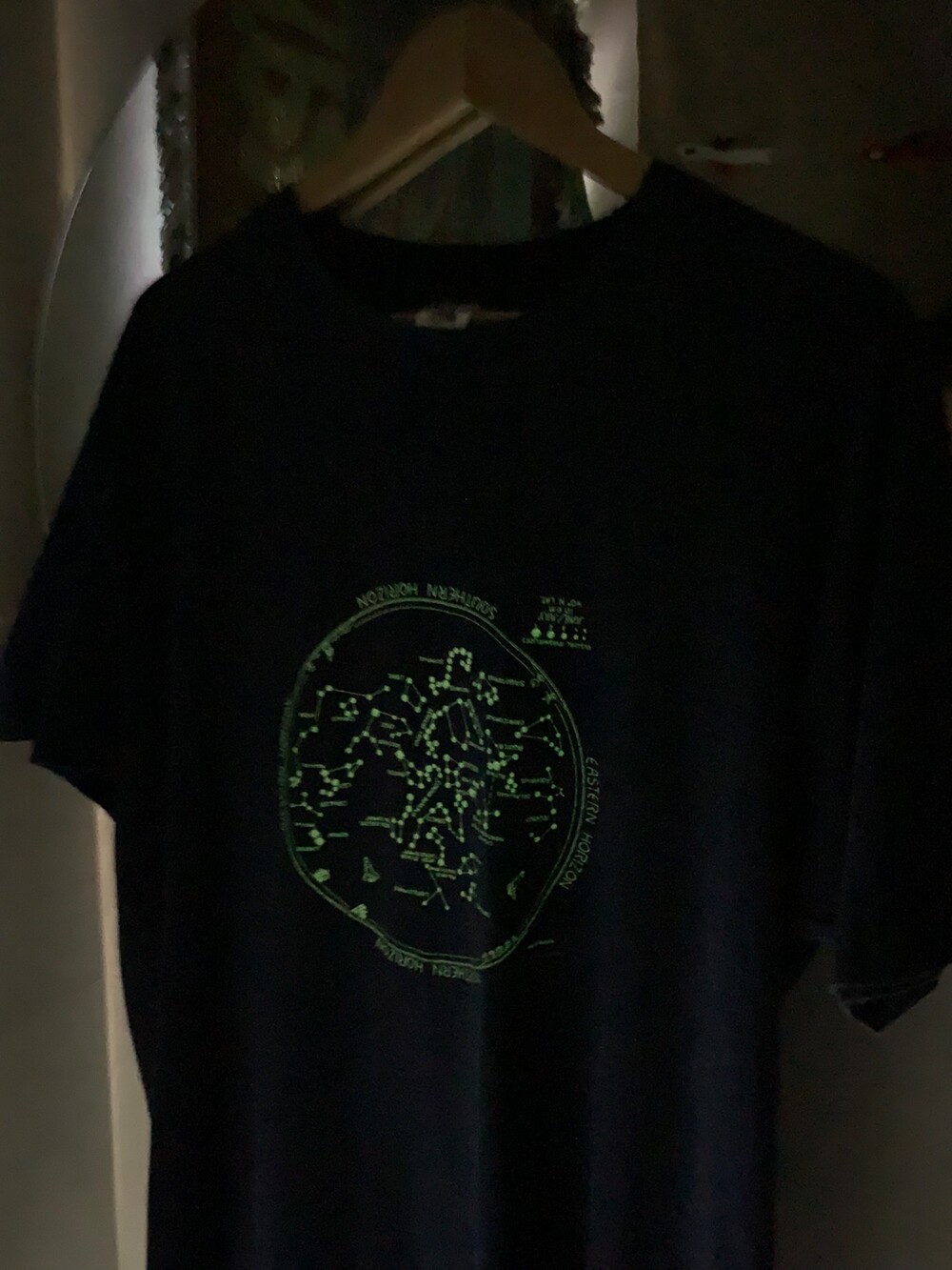 일반적으로는 뒷면 프린팅이 없는 개체가 대부분인데 비해, 전면에는 지구에서 보는 별자리 프린팅이 올려져 있으며 후면에는 THE FORCE IS WITH ME. 라는 슬로건 프린팅이 올려진 티셔츠. 전면 별자리 프린팅은 어두운 곳에서 밝게 빛나는 야광 사양 프린팅입니다.