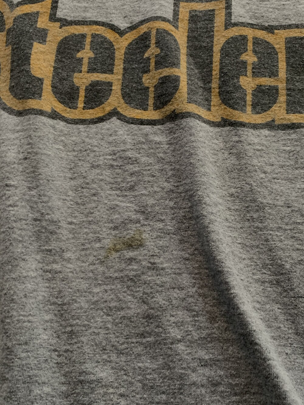 1990년대에서 2000년대 초반 사이에 생산된 것으로 추정되는, 몸판 옆 부분에 봉제선이 없는 튜블러 타입의 티셔츠. NFL 소속 피츠버그 스틸러스 (Pittsburgh Steelers) 스펠아웃과 스우시 로고가 워터프린트 방식으로 올려져 프린팅 질감이 느껴지지 않으며 착용을 거듭하면서 희끗해지는 프린팅의 경년변화을 기대할 수 있을만한 제품입니다.