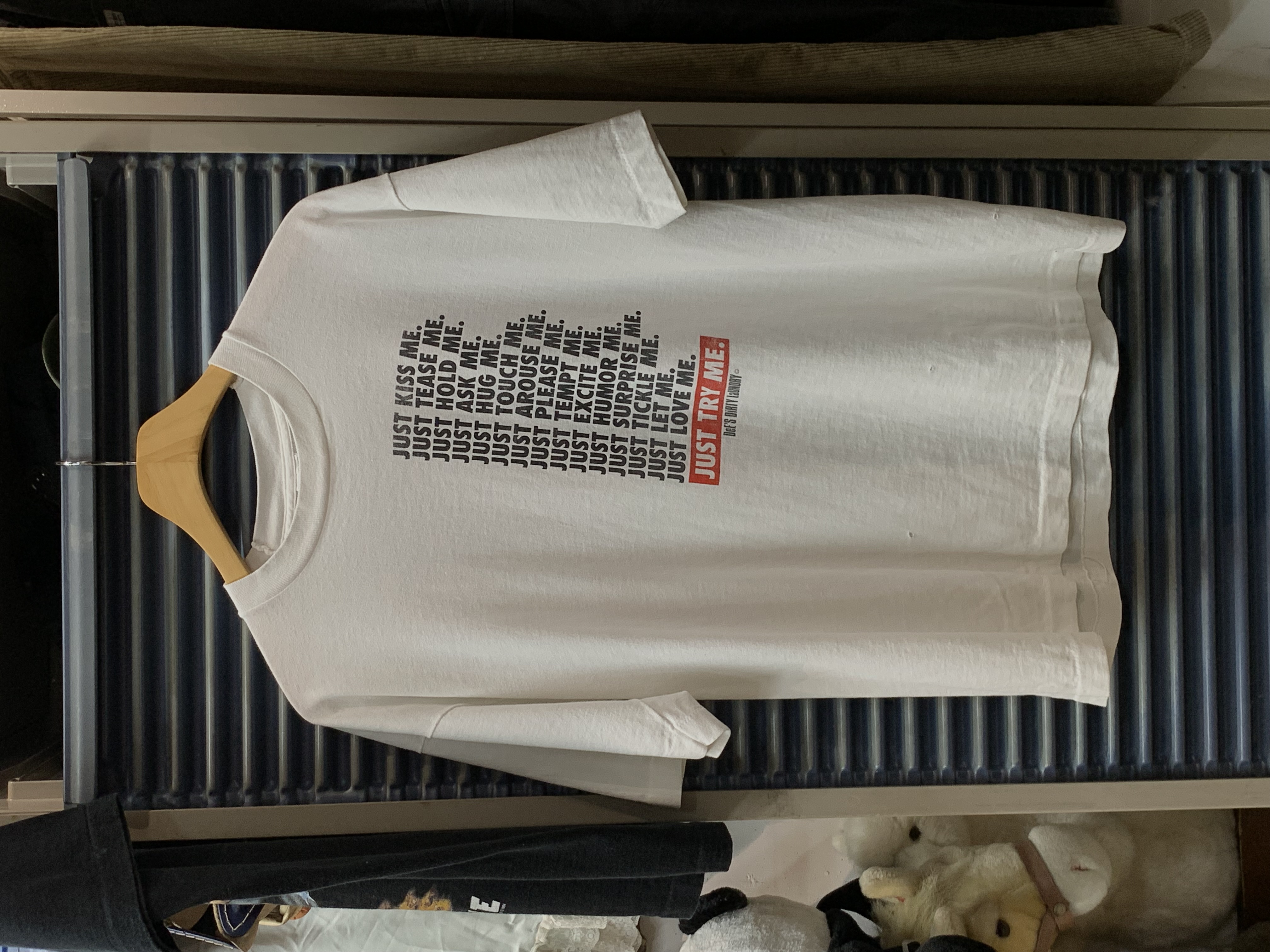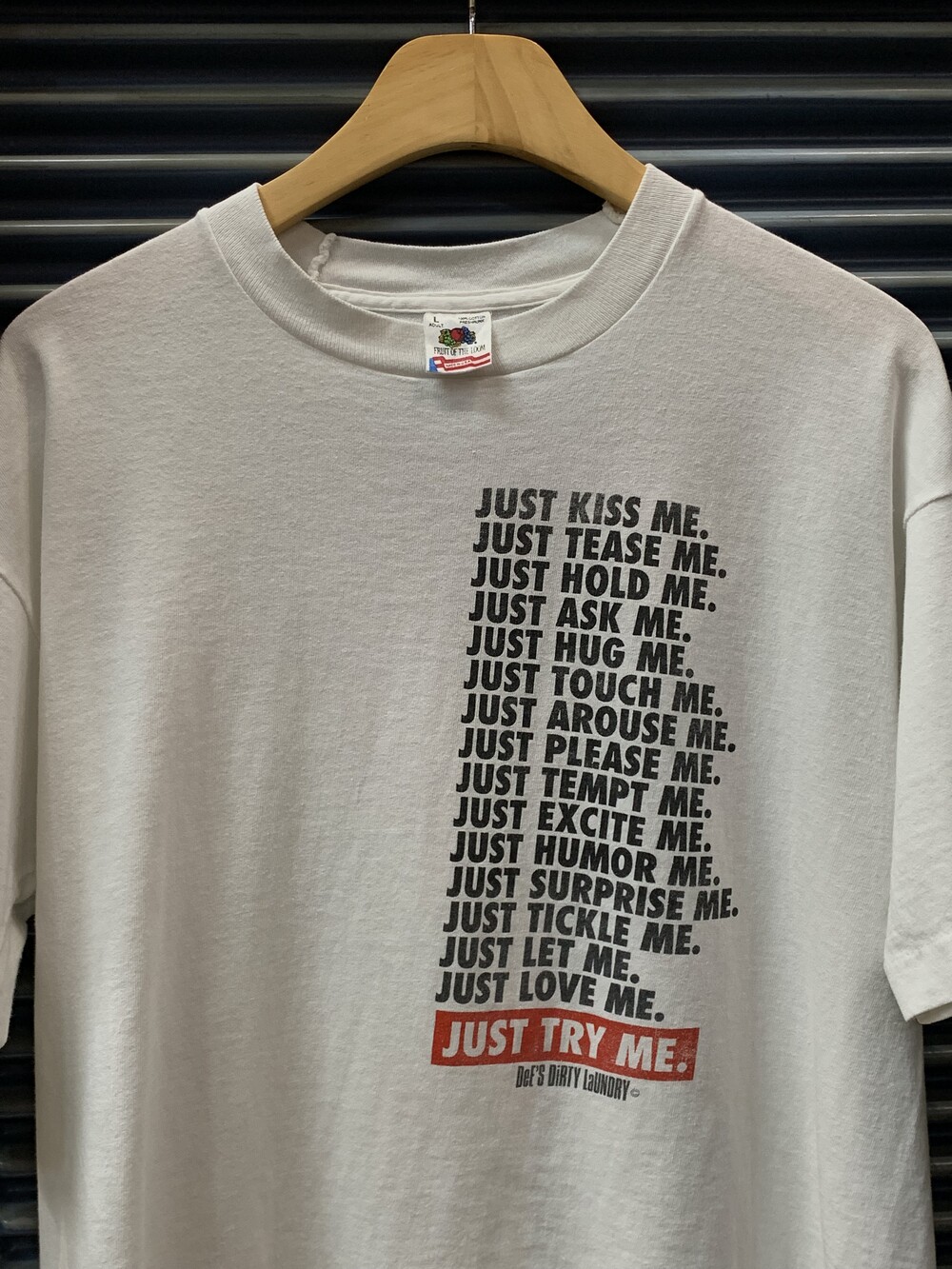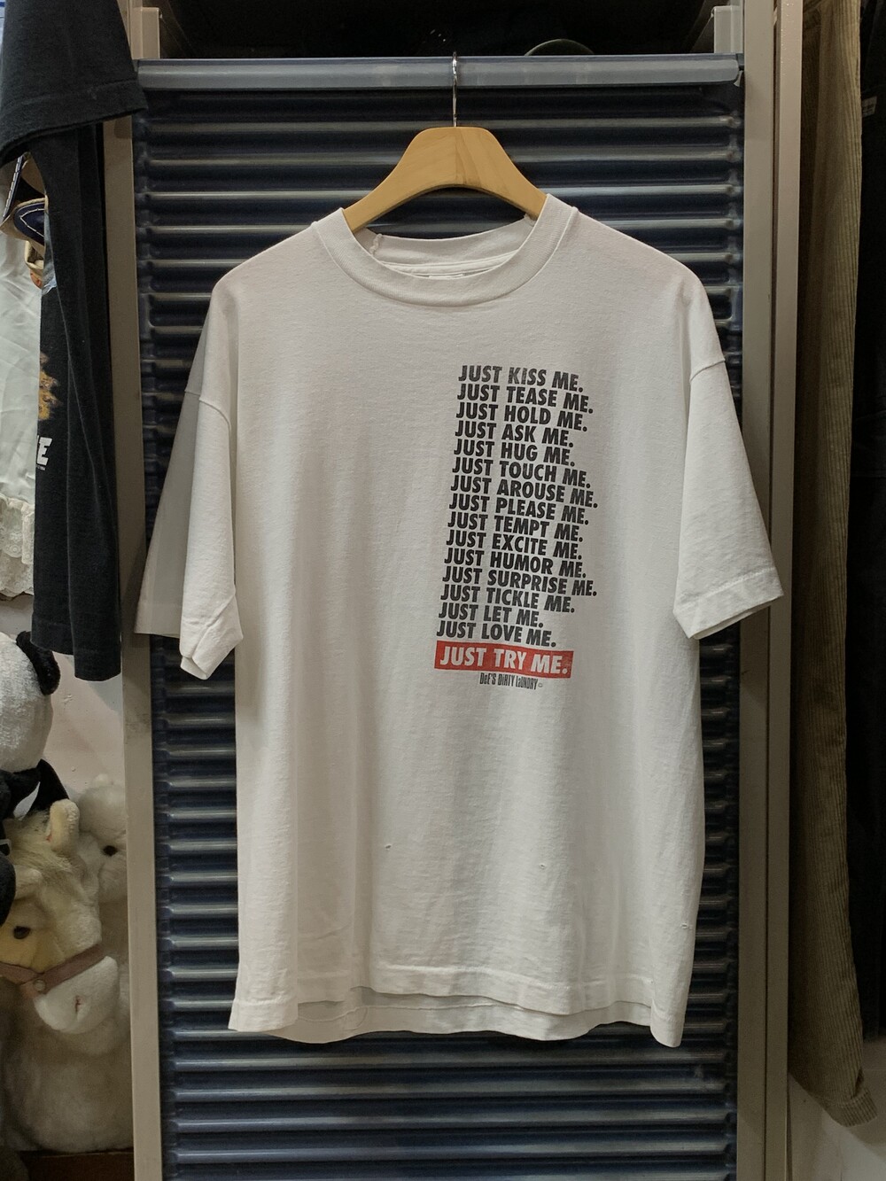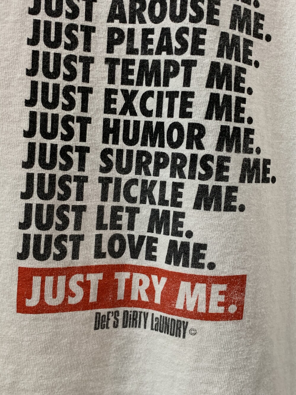 나이키의 대표적인 슬로건 JUST DO IT. 을 연상케하는 프린팅이 반복되며 결론적으로는 DeE'S DiRTY LaUNDRY 라는 이름의 세탁소를 이용해보기를 권장하는 내용의 프로모션 프린팅 티셔츠.