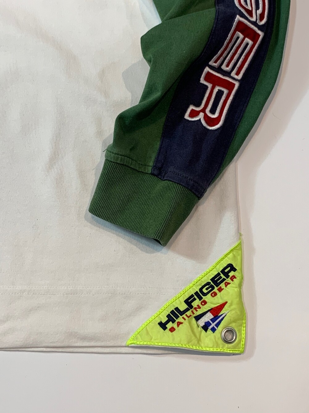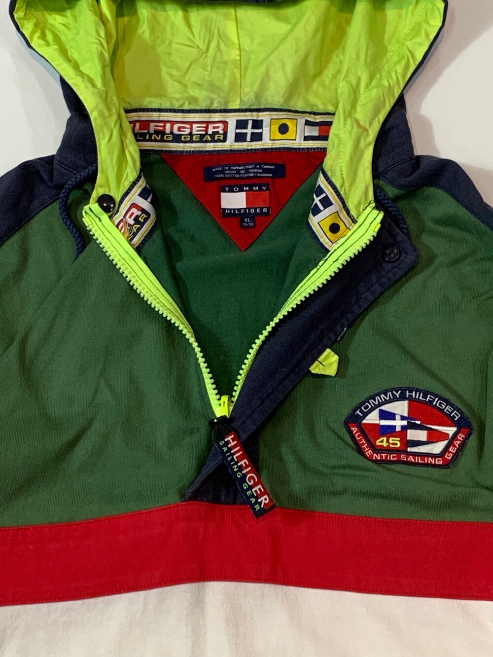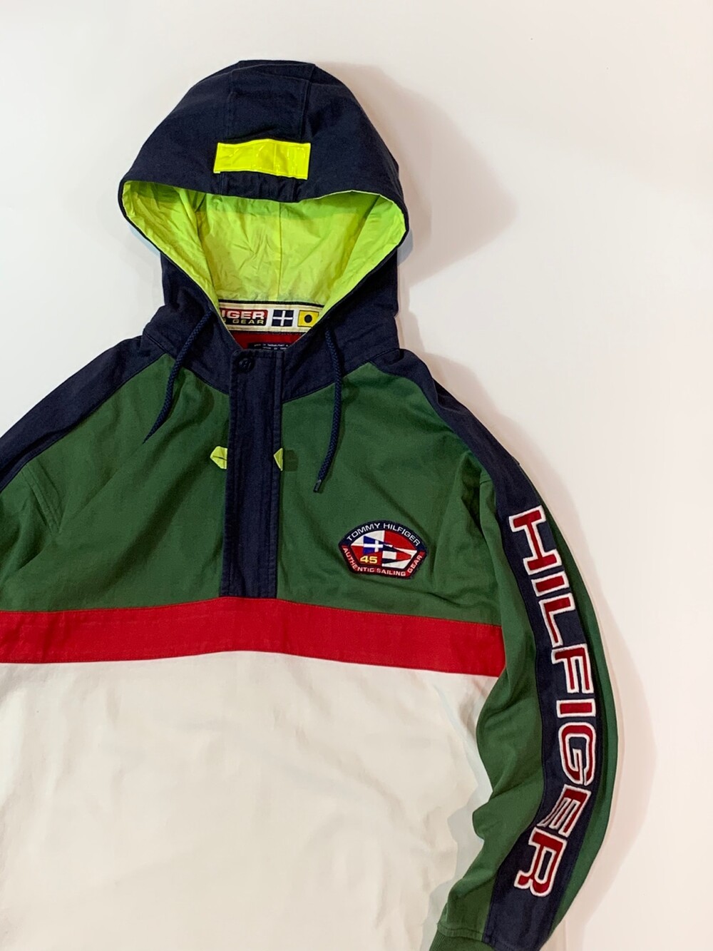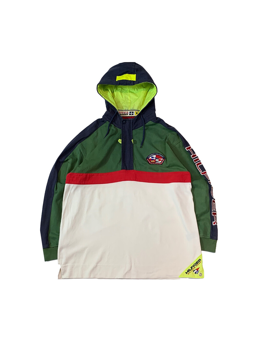 🚩Detail 타미힐피거 세일링 기어 라인의 하프짚 풀오버입니다. 럭비셔츠에서 볼 법한 얇은 트윌 원단과 패널 디자인의 바디에 나일론 원단이 덧대진 하프집업 후드가 붙은 제품으로, 노티카와 더불어 브랜드 초창기부터 세일링(Sailing) 문화에서부터 영향을 받은 타미힐피거 특유의 컬러풀한 배색이 돋보이는 제품입니다.