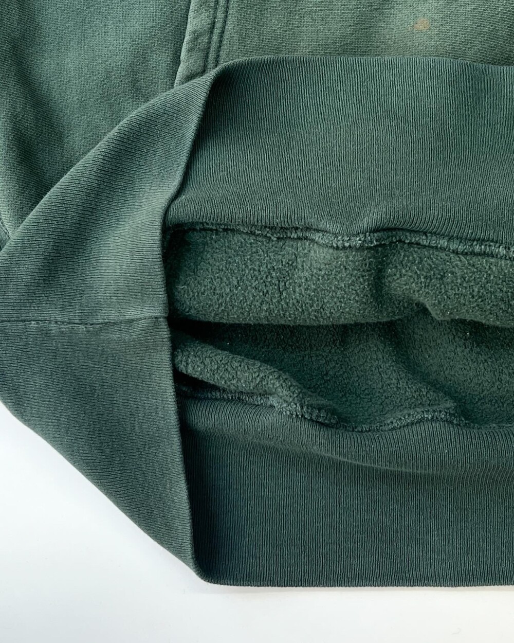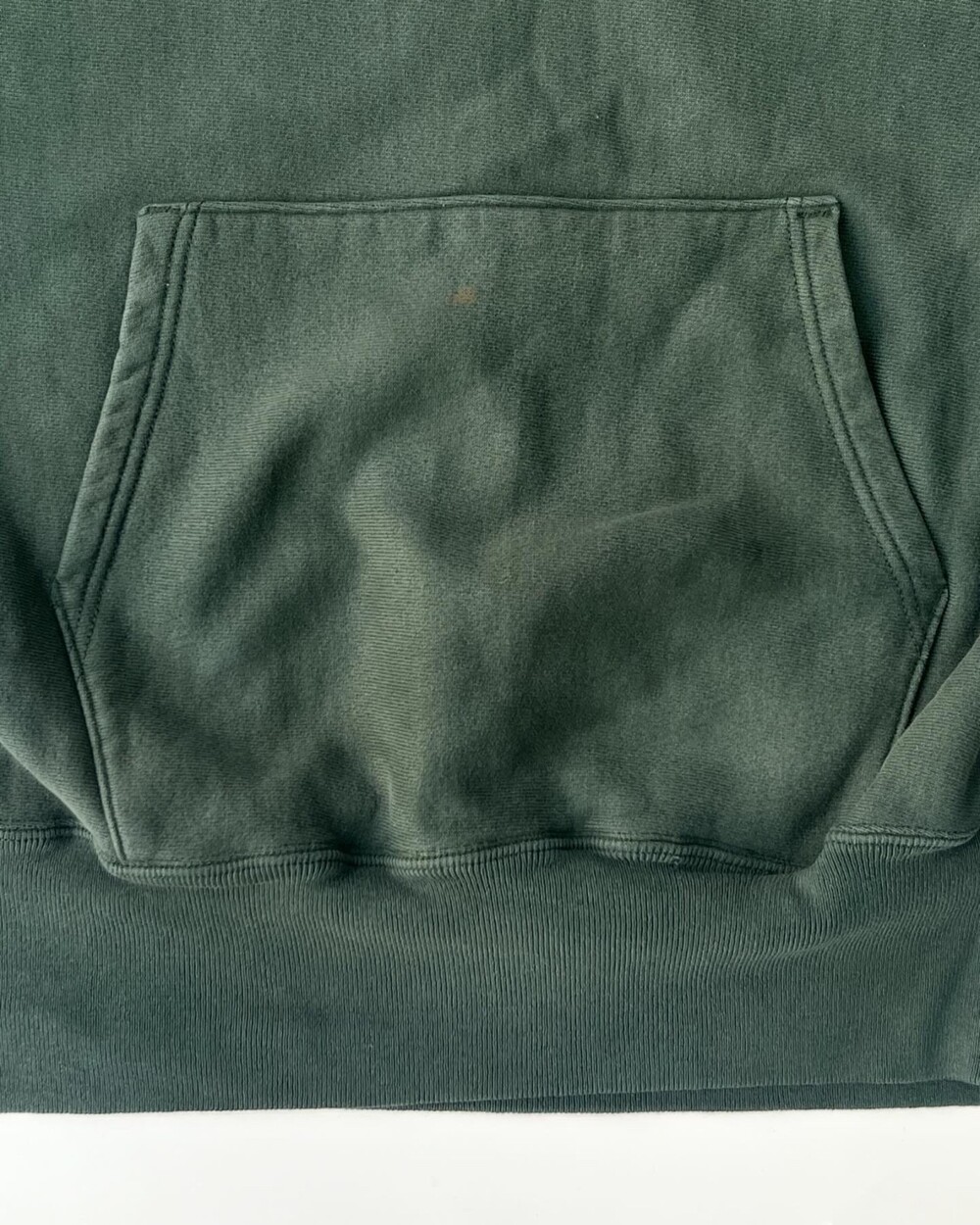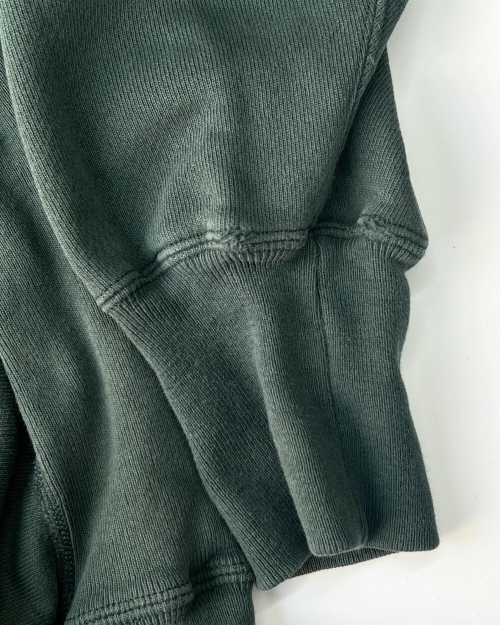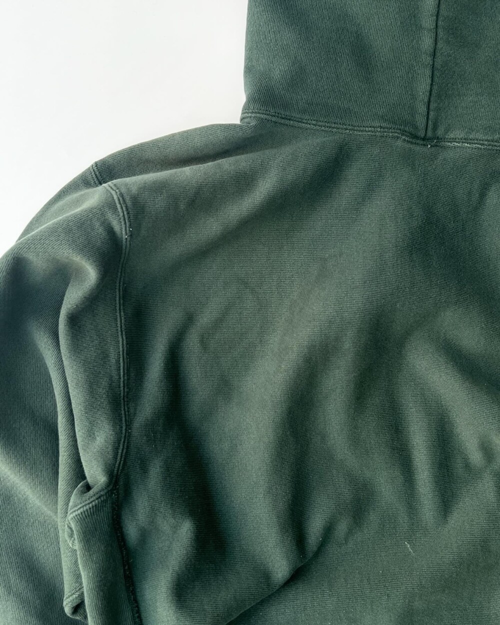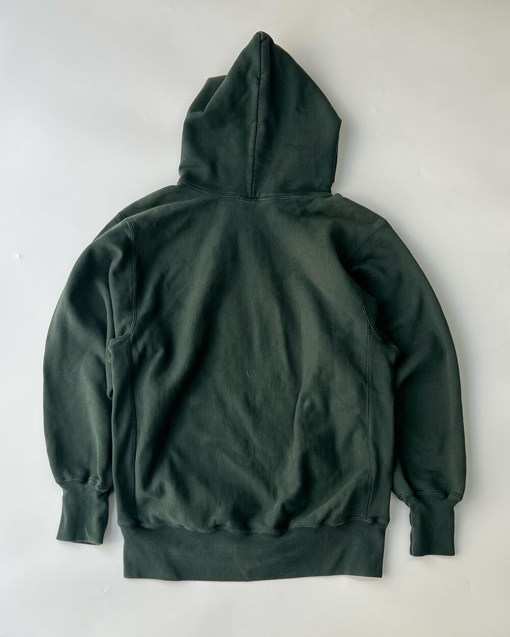 🚩Detail 딥그린 컬러의 리버스위브 스웻 후디입니다. 바람이 새어 들어오지 않도록 막아주는 후드 본연의 기능을 강조하고자 하는 것인지 일본에서는 주로 스웻 파카라는 표현을 쓰는 품목이기도 합니다. 넓은 암홀과 길고 타이트한 소매 립으로 인해 리버스위브 특유의 실루엣이 나올 뿐더러, 거기에 더해 각잡힌 고깔 형태의 후드가 투박한 매력이 있는 클래식한 제품입니다.