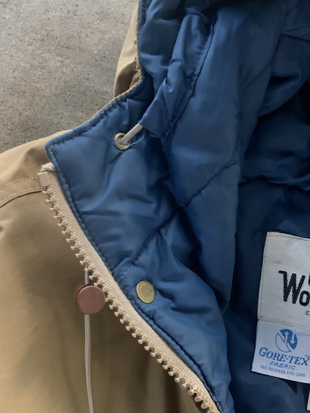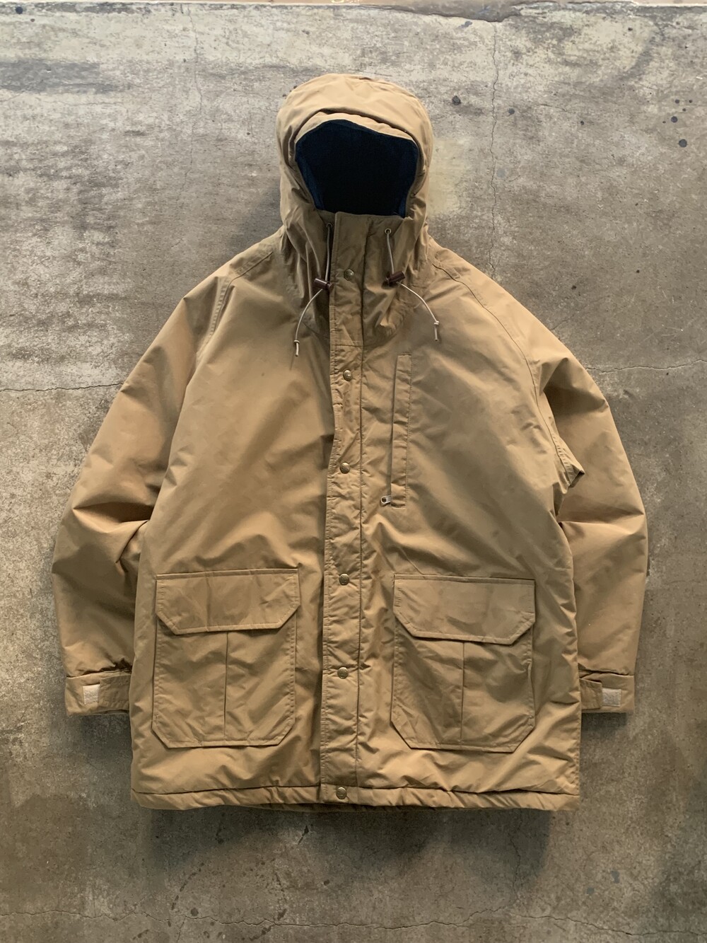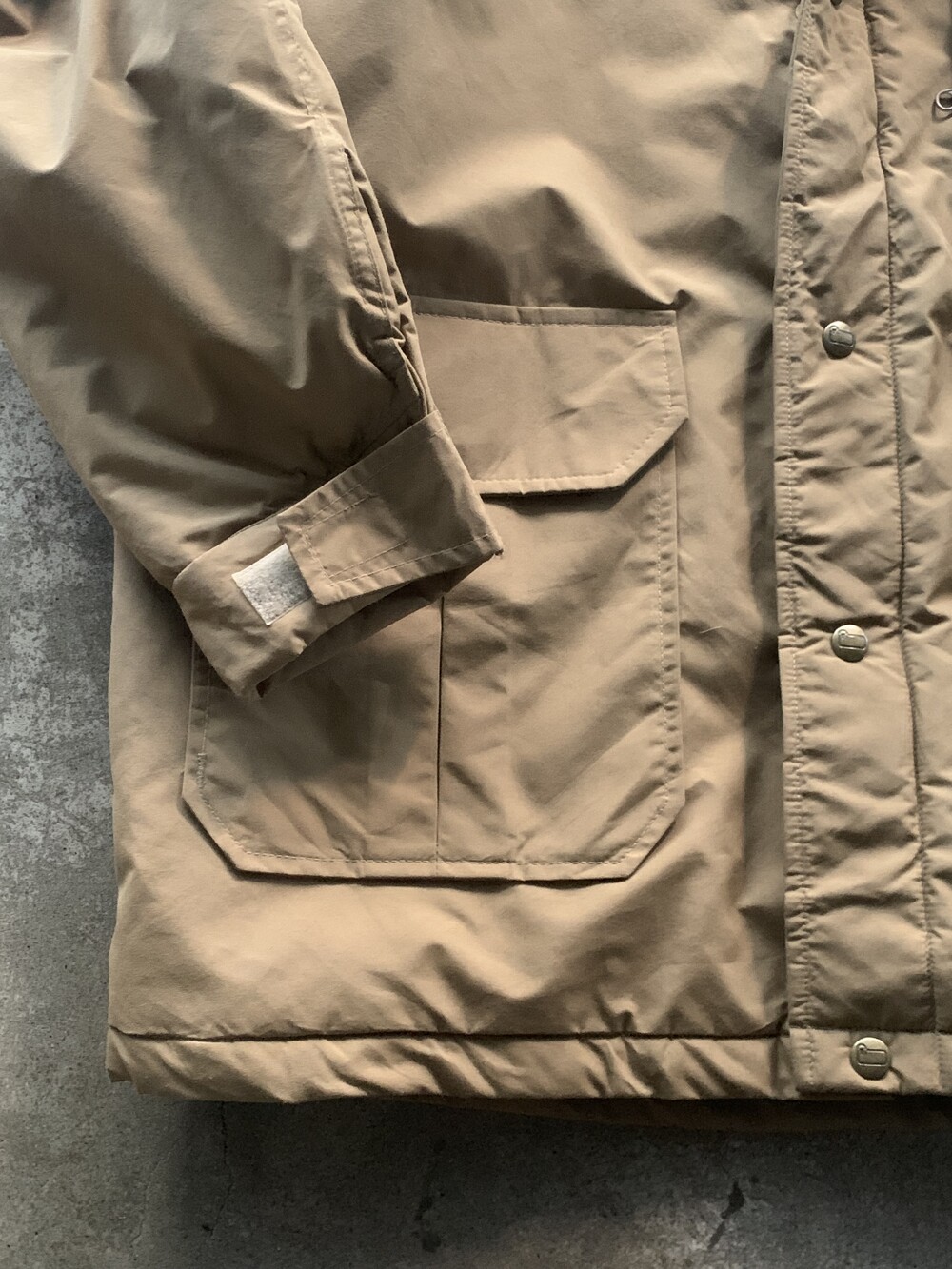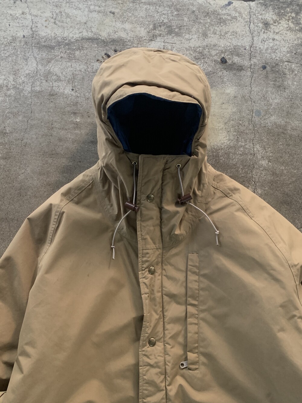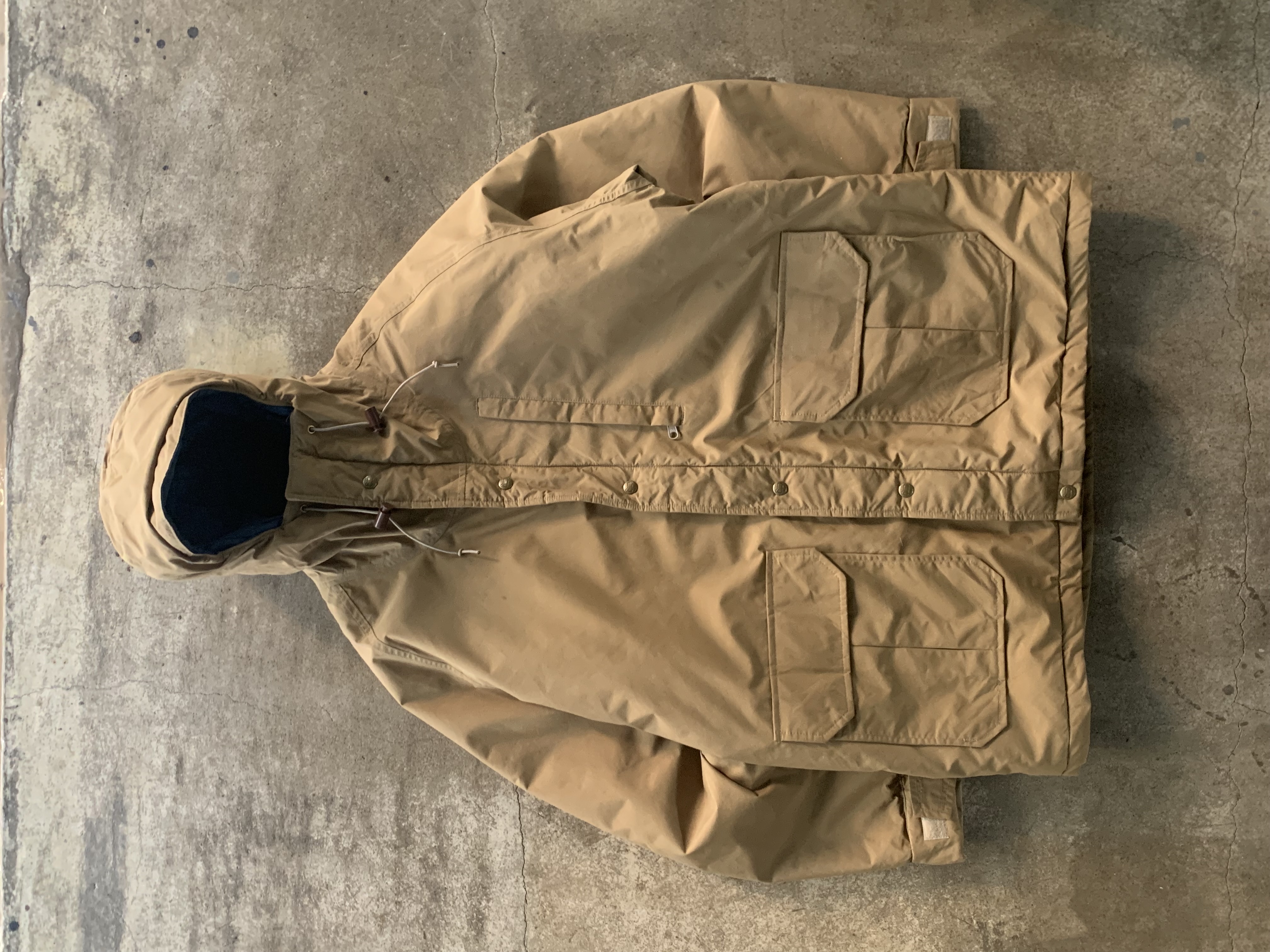 앞서 소개한 것들이 후드에 붙은 플랩포켓이 있어 전통적인 아웃도어웨어스러움을 강조한다면, 고어텍스 아웃쉘에 폴리 충전재가 주입된 울리치의 고어텍스 파카는 얼굴을 가릴 정도로 높게 올라오는 지퍼와 스트링으로 구성되어 있으며 60/40 원단에 비해 뻣뻣하고 힘 있는 아웃쉘 때문인지 보다 미니멀한 구성을 보이는 제품입니다. 전문적인 기어와 비교할 순 없겠지만 일상 생활에서 방풍과 발수 측면에서는 부족함이 없을만한 제품으로 충분한 레이어드를 동반하여 따뜻하게 착용할 수 있을만한 제품입니다. 105호 전후로 착용하는 분들에게 권장드립니다.