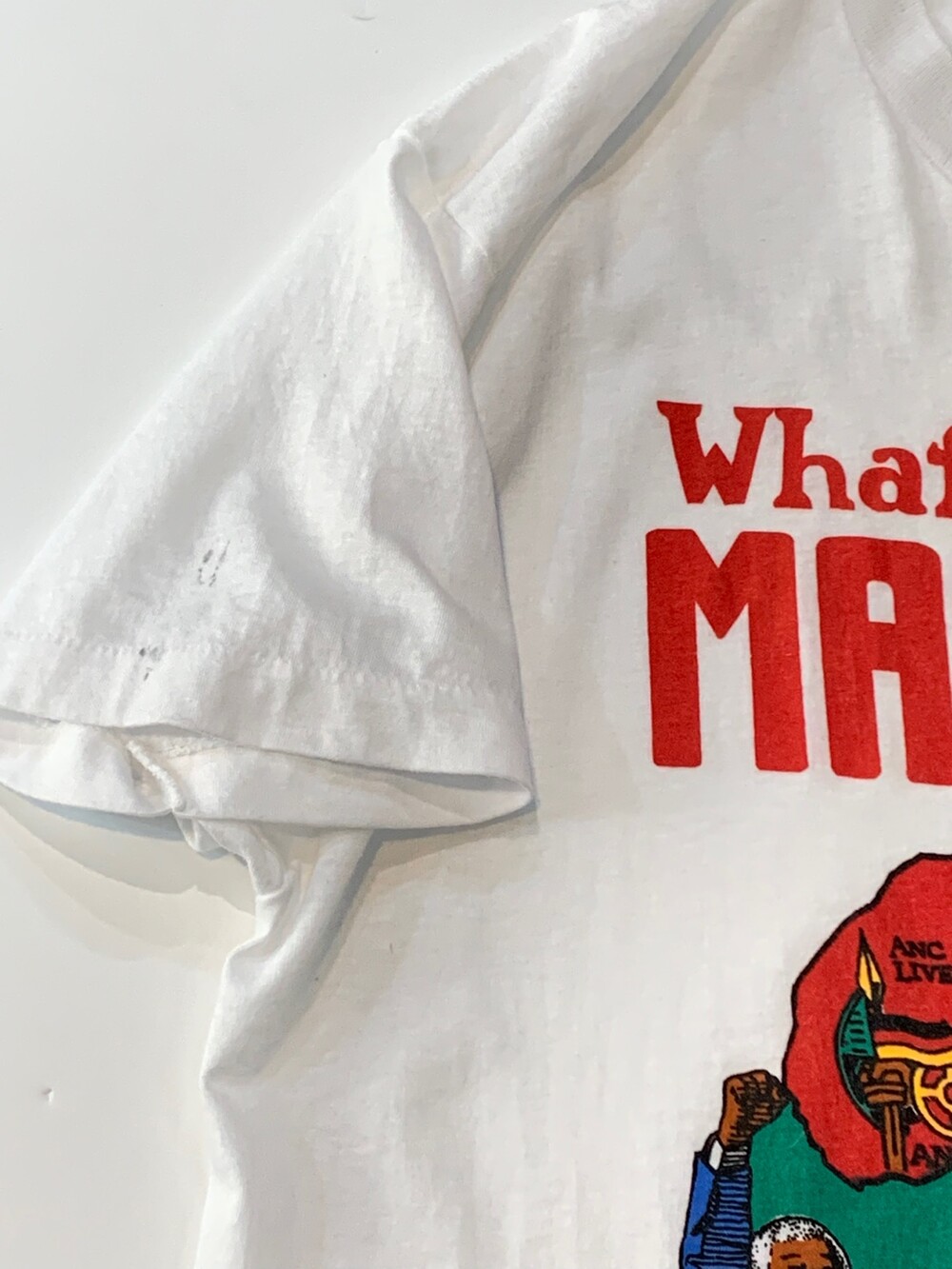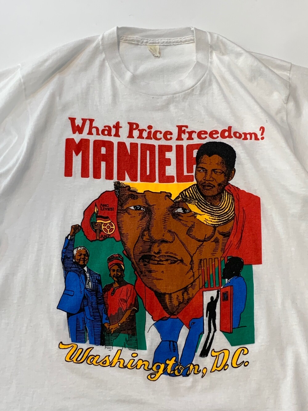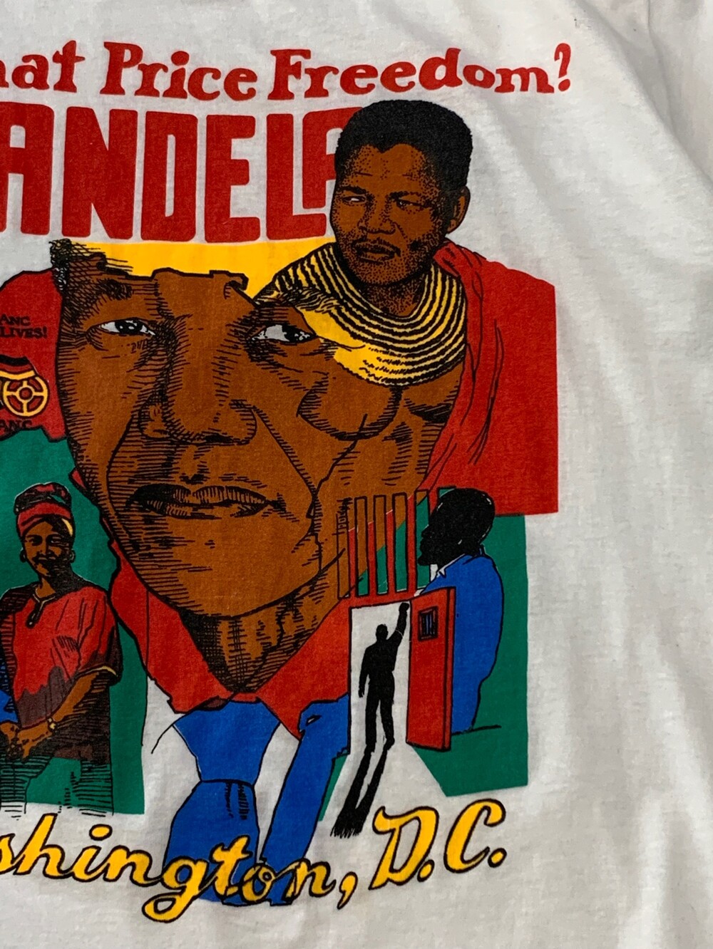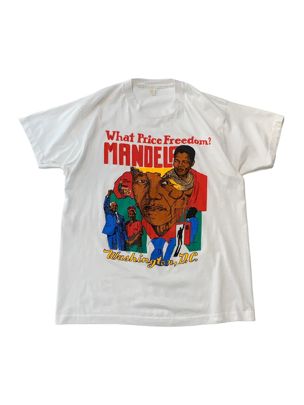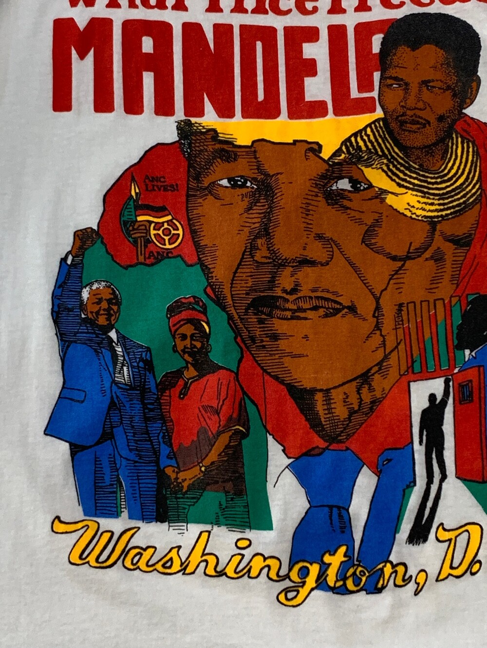 🚩Detail 유색인종이 탄압받는 나라의 현실에 투쟁 운동을 벌이다 수감되었고, 옥중에서도 남아공 내 유색인종의 인권 개선을 위해 부단히 노력한 끝에 석방되어 대통령의 자리에 올라 한 나라의 정상으로서 미국의 수도에 방문하는 등 남아프리카 공화국의 사회운동가이자 대통령으로 널리 알려진 넬슨 만델라(NELSON MANDELA)의 주요 생애가 프린팅으로 표현된 티셔츠. 어려운 상황에서도 평등을 위해 노력했던 올곧은 정신, 대통령의 자리에 오른 이후에 인종차별을 주도한 자들을 너그러이용서하는 포용력 등에 대한 존경이 가격으로 반영된 사례입니다.
