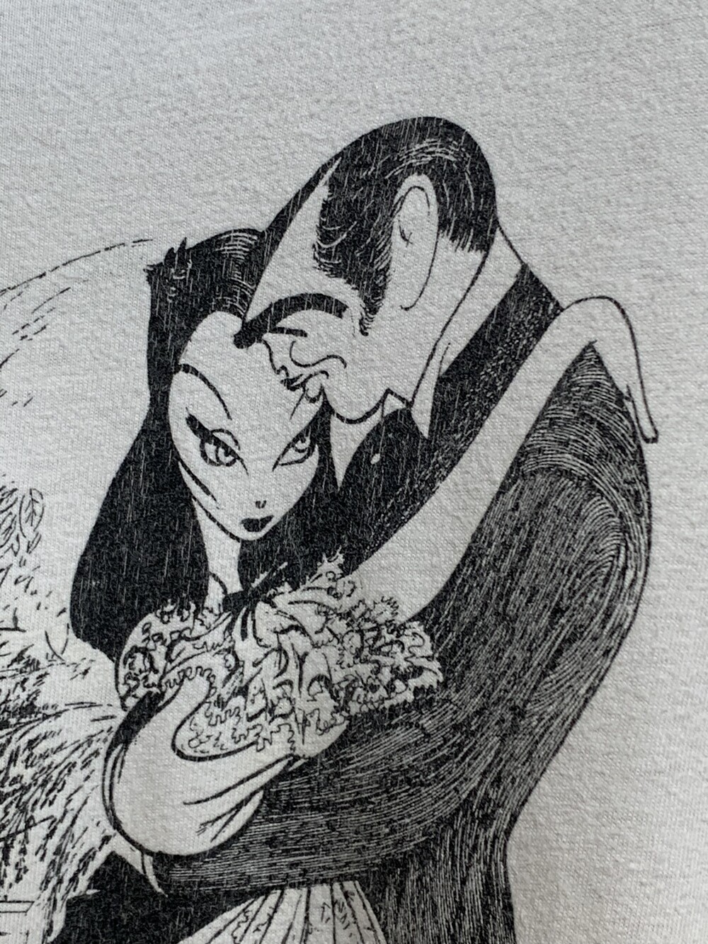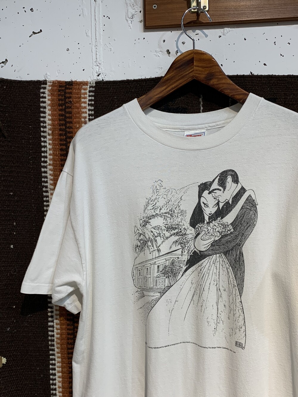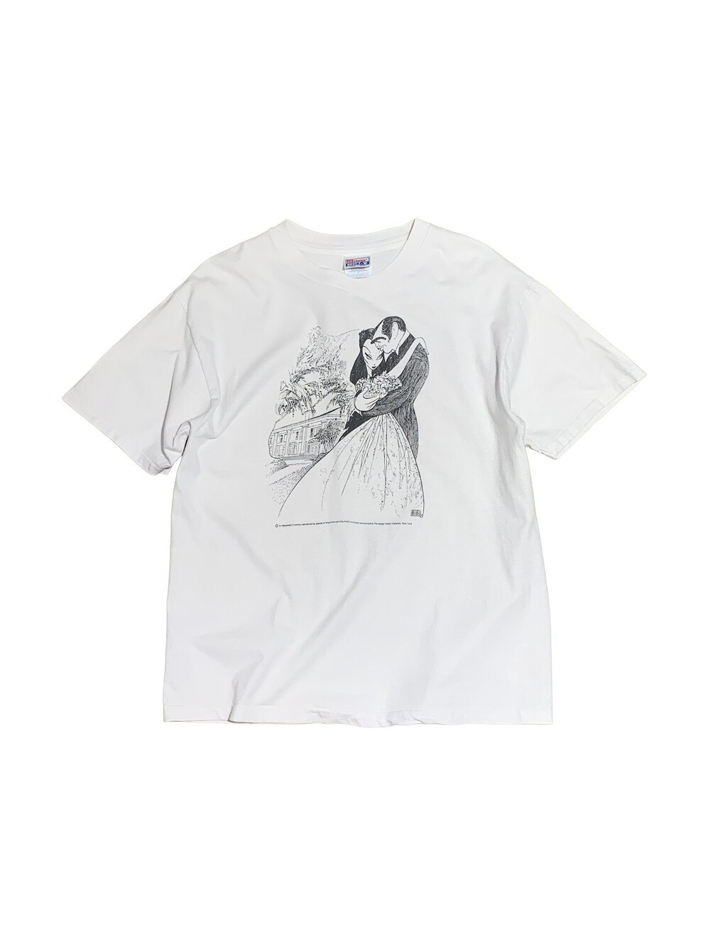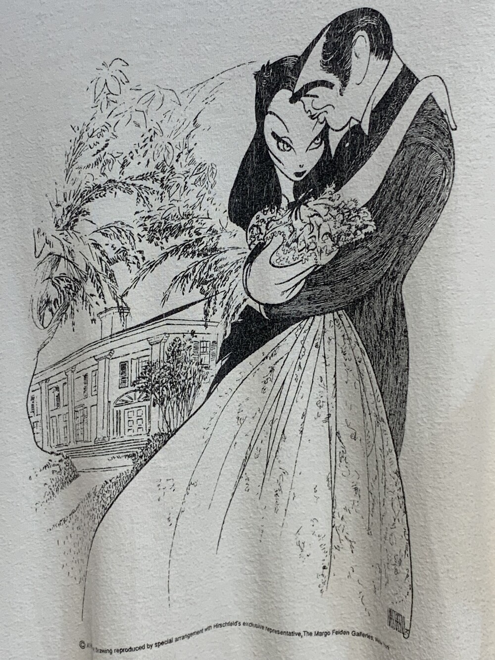 🚩Detail 알 허쉬펠드(Al Hirschfeld)는 미국의 만화가로 주로 브로드웨이 연극이나 할리우드 영화에 등장하는 배우들을 대상으로 약간의 과장, 기괴함, 익살을 적당히 섞은듯한 캐리커쳐 스타일의 흑백 초상화로 그려내는 작품으로 널리 알려져 있습니다. 해당 작품은 영화 바람과 함께 사라지다(Gone With The Wind)의 주연 배우가 함께하는 가장 유명한 장면을 알 허쉬펠드 스타일로 그려낸 작품으로, 해당 작품을 프린팅으로 옮겨온 티셔츠입니다