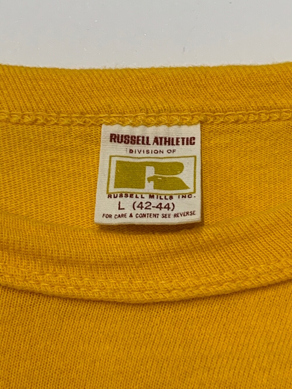 🚩Detail 전면에는 미국 텍사스 주 댈러스에 위치한 W.W. SAMUELL 고등학교 바시티 팀 스파르탄즈 응원단 프린팅이 올려진, 1970년대부터 80년대 사이에 생산된 러셀 애슬레틱의 티셔츠. 적당한 두께감의 코튼 소재로 여유롭게 입기보다는 몸에 붙는 저스트한 피팅감으로 착용하기 좋을만한 제품입니다.