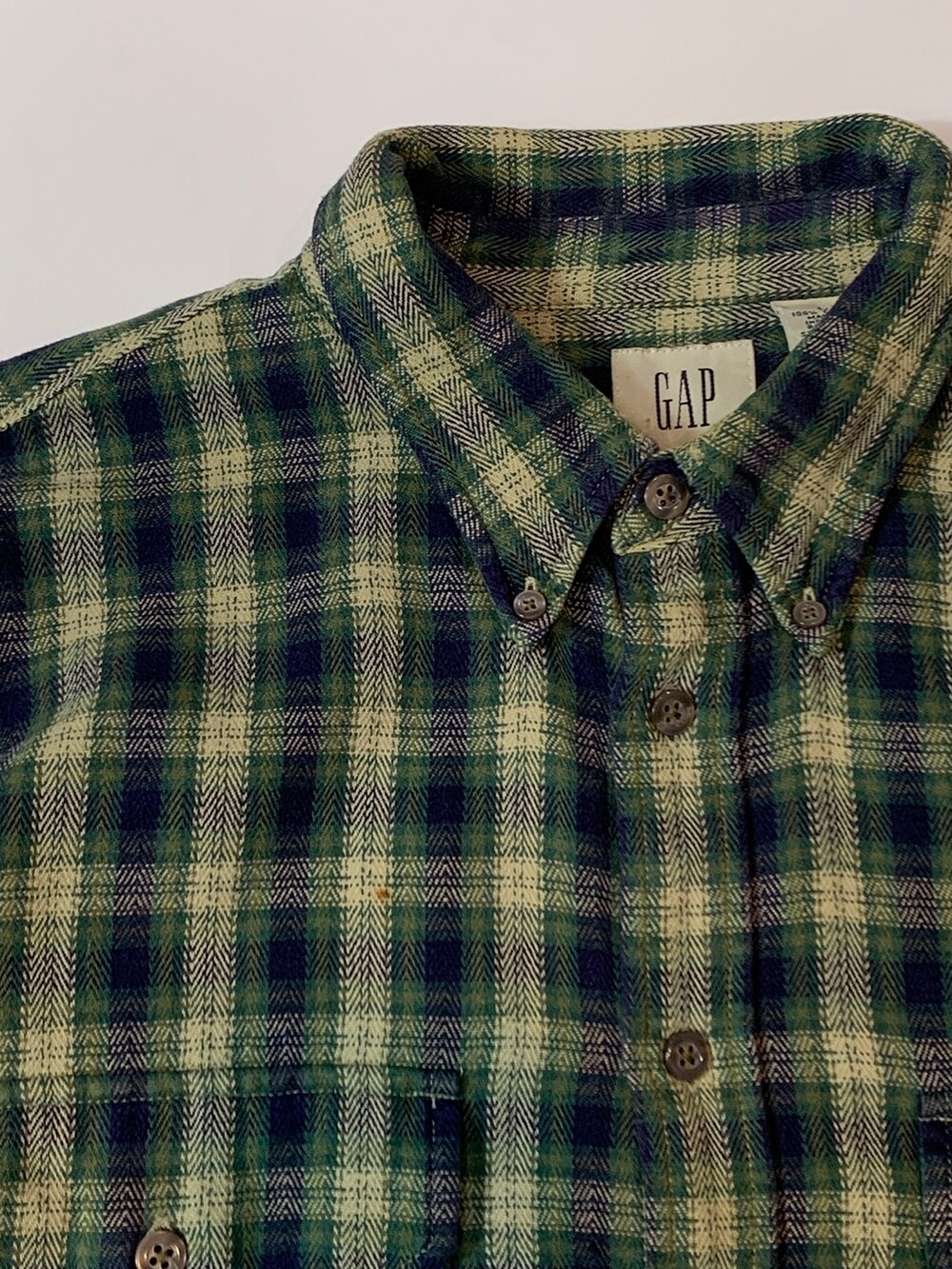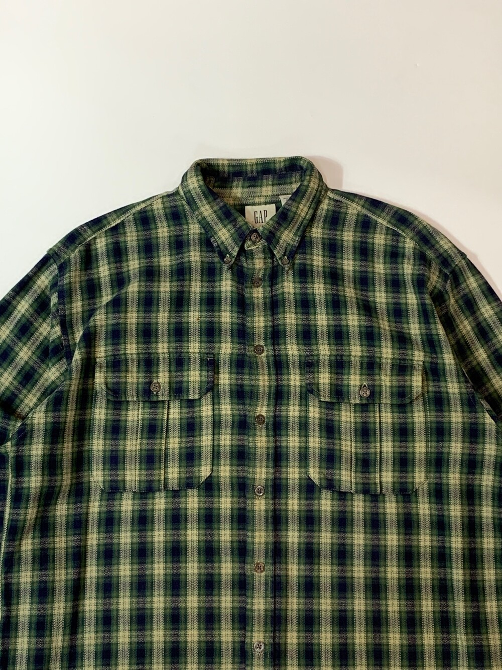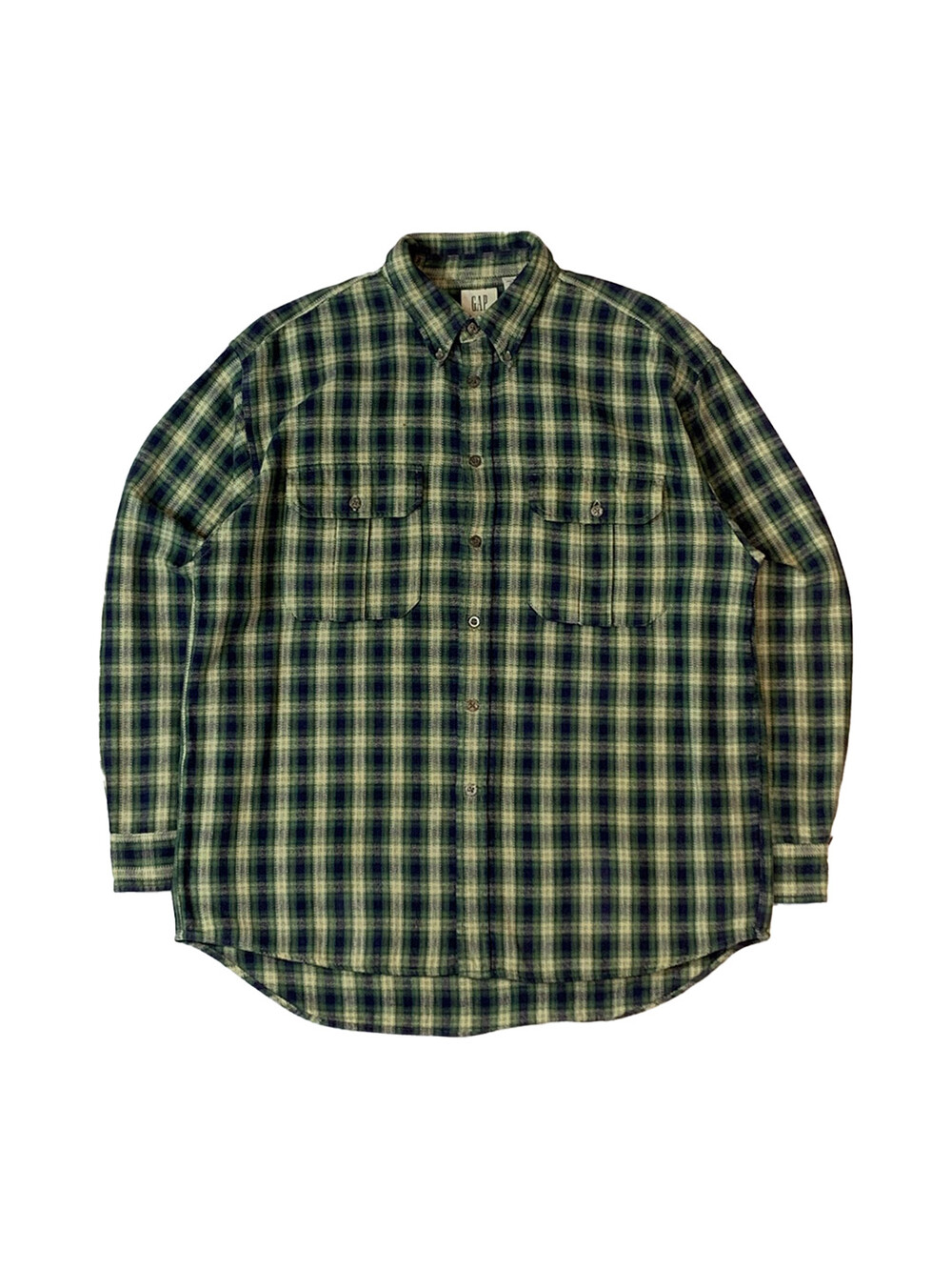 🚩Detail 90년도에서 2000년도 사이에 생산된 것으로 추정되는 올드 갭의 플란넬 버튼다운 셔츠입니다. 기존에 갭에서 선보이던 캐주얼한 버튼다운 셔츠에서 헌팅웨어용 셔츠의 디테일이 더해진 제품으로 전면에는 원활한 수납을 위해 플리츠가 붙은 포켓이, 후면에는 움직이기 편하게끔 뒷면 요크 아래에 플리츠가 붙어있습니다.
