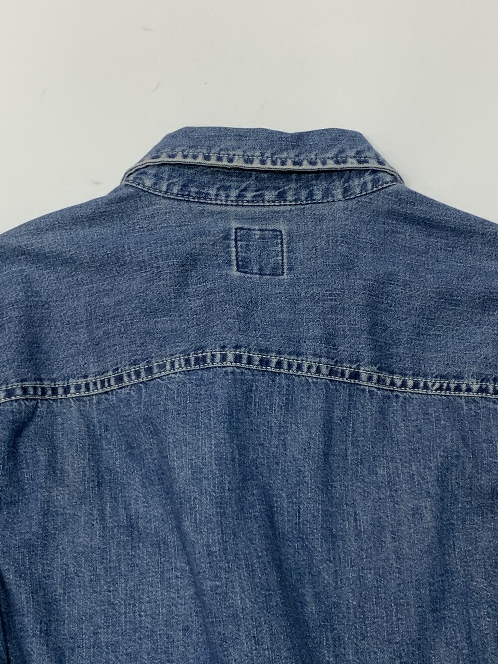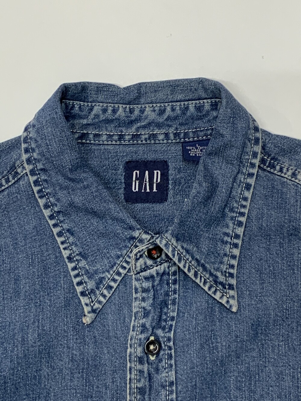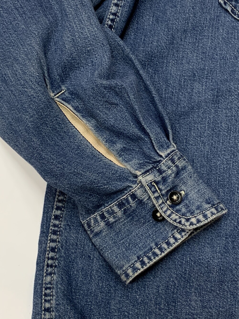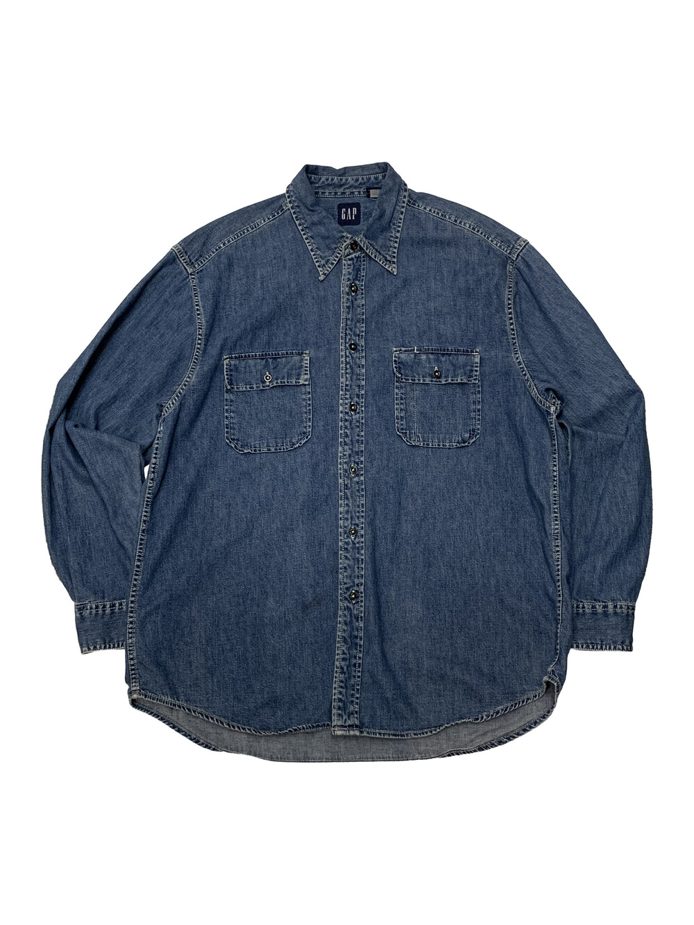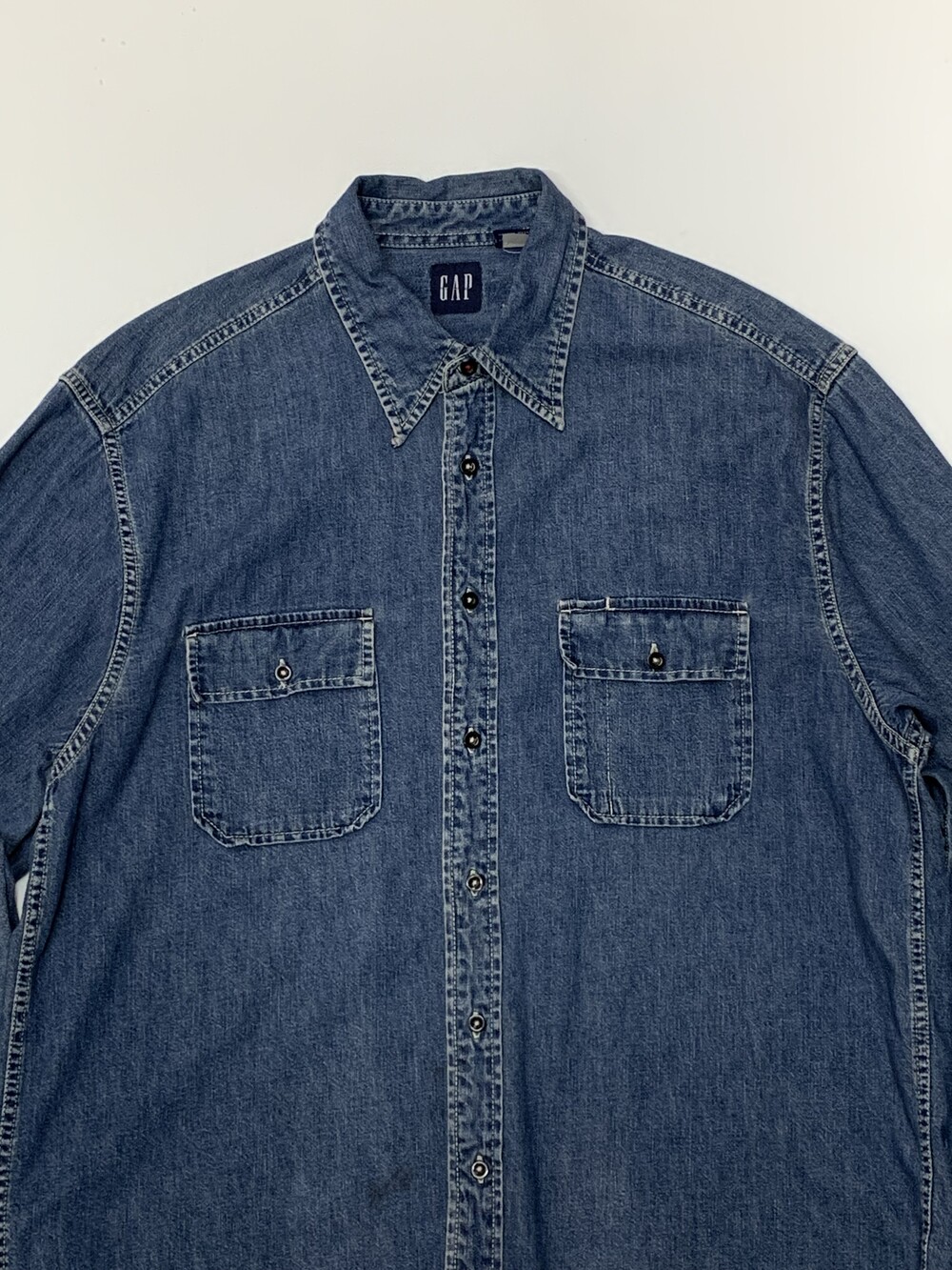🚩Detail 1990년도에서 2000년도 사이에 생산된 것으로 추정되는 올드 갭의 데님 셔츠. 낮은 넥밴드와 칼라 그리고 낮게 자리잡은 요크 등 캐주얼한 인상이 강한 제품으로, 전면 아웃포켓 형태나 버튼 및 스티치 컬러 등의 디테일로 미루어 올드 사양 샴브레이 워크셔츠를 모티브로 소재에 변주를 준 제품으로 추정됩니다. 착용하면서 소매나 포켓 안쪽에 드러나는 트윌 소재 파이핑 역시 겉감의 소재를 고려하여 추가한 것으로 데님 원단과 잘 어울리는 디테일입니다.