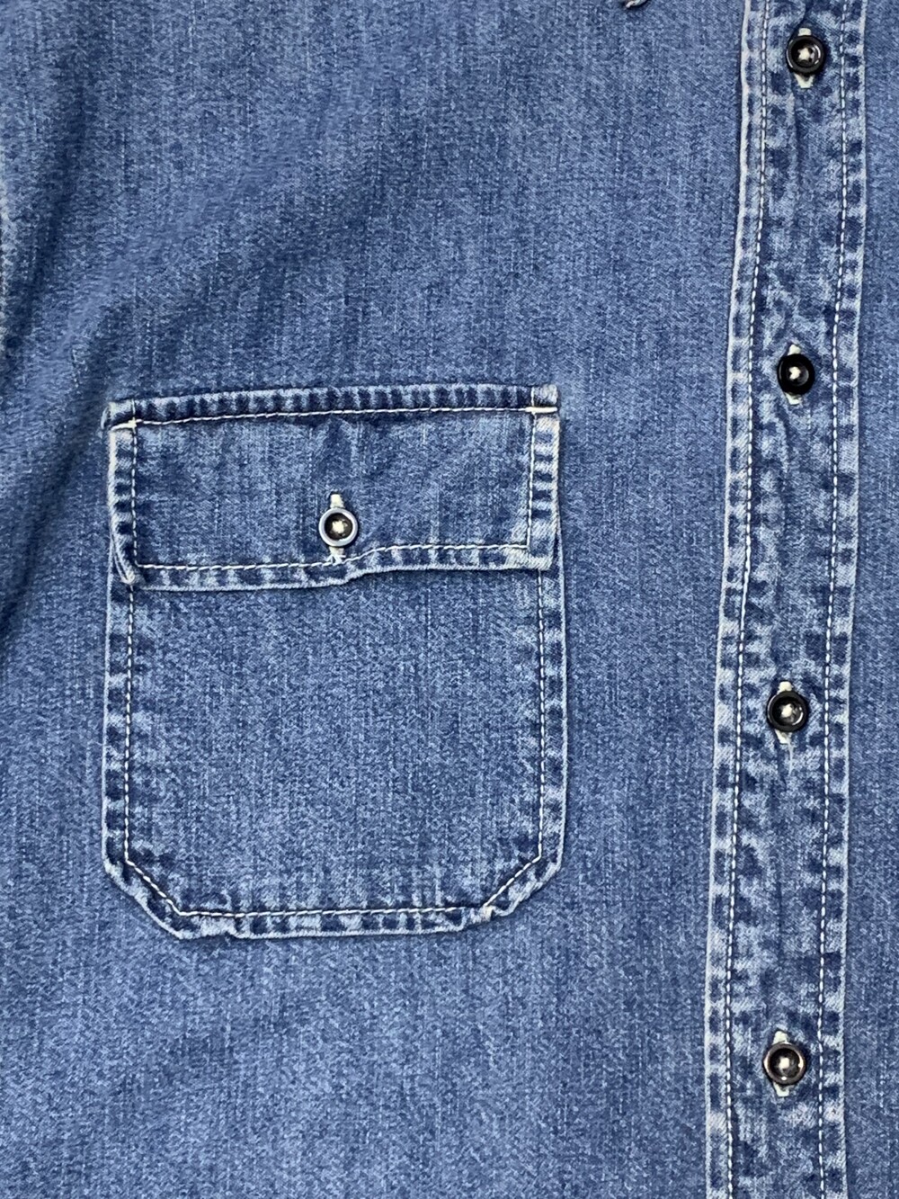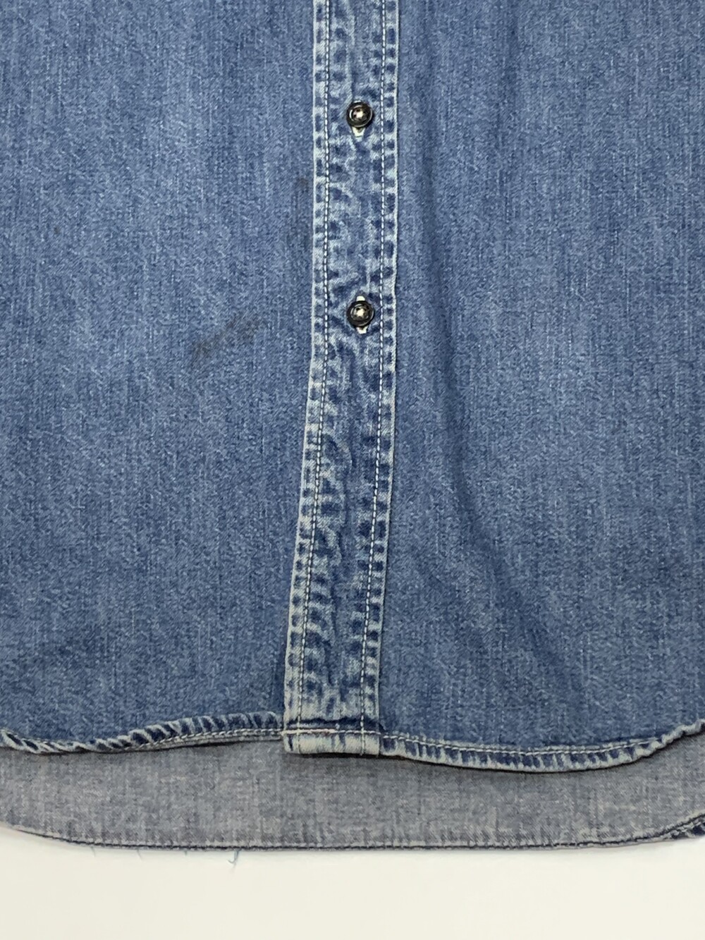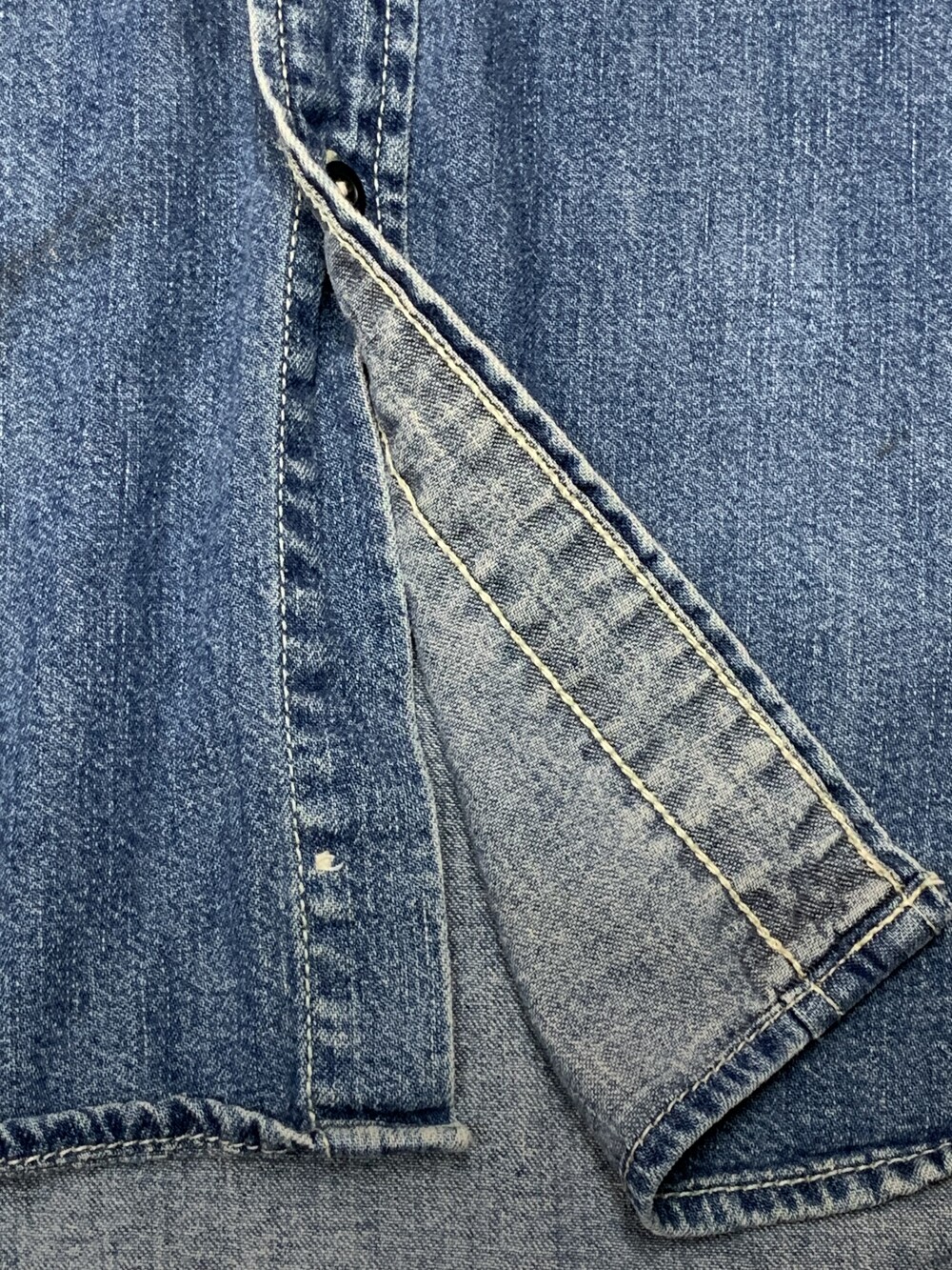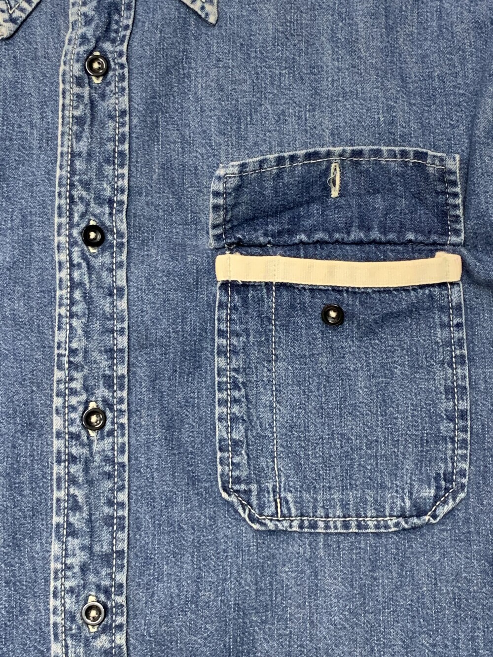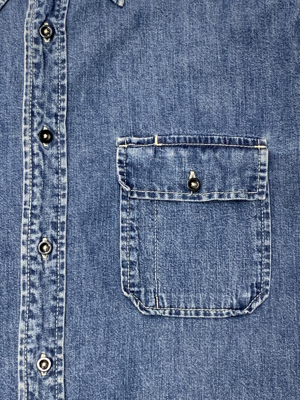 🚩Detail 1990년도에서 2000년도 사이에 생산된 것으로 추정되는 올드 갭의 데님 셔츠. 낮은 넥밴드와 칼라 그리고 낮게 자리잡은 요크 등 캐주얼한 인상이 강한 제품으로, 전면 아웃포켓 형태나 버튼 및 스티치 컬러 등의 디테일로 미루어 올드 사양 샴브레이 워크셔츠를 모티브로 소재에 변주를 준 제품으로 추정됩니다. 착용하면서 소매나 포켓 안쪽에 드러나는 트윌 소재 파이핑 역시 겉감의 소재를 고려하여 추가한 것으로 데님 원단과 잘 어울리는 디테일입니다.