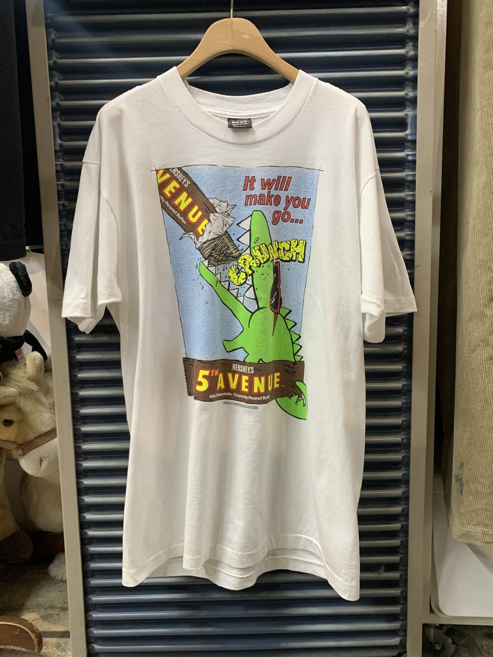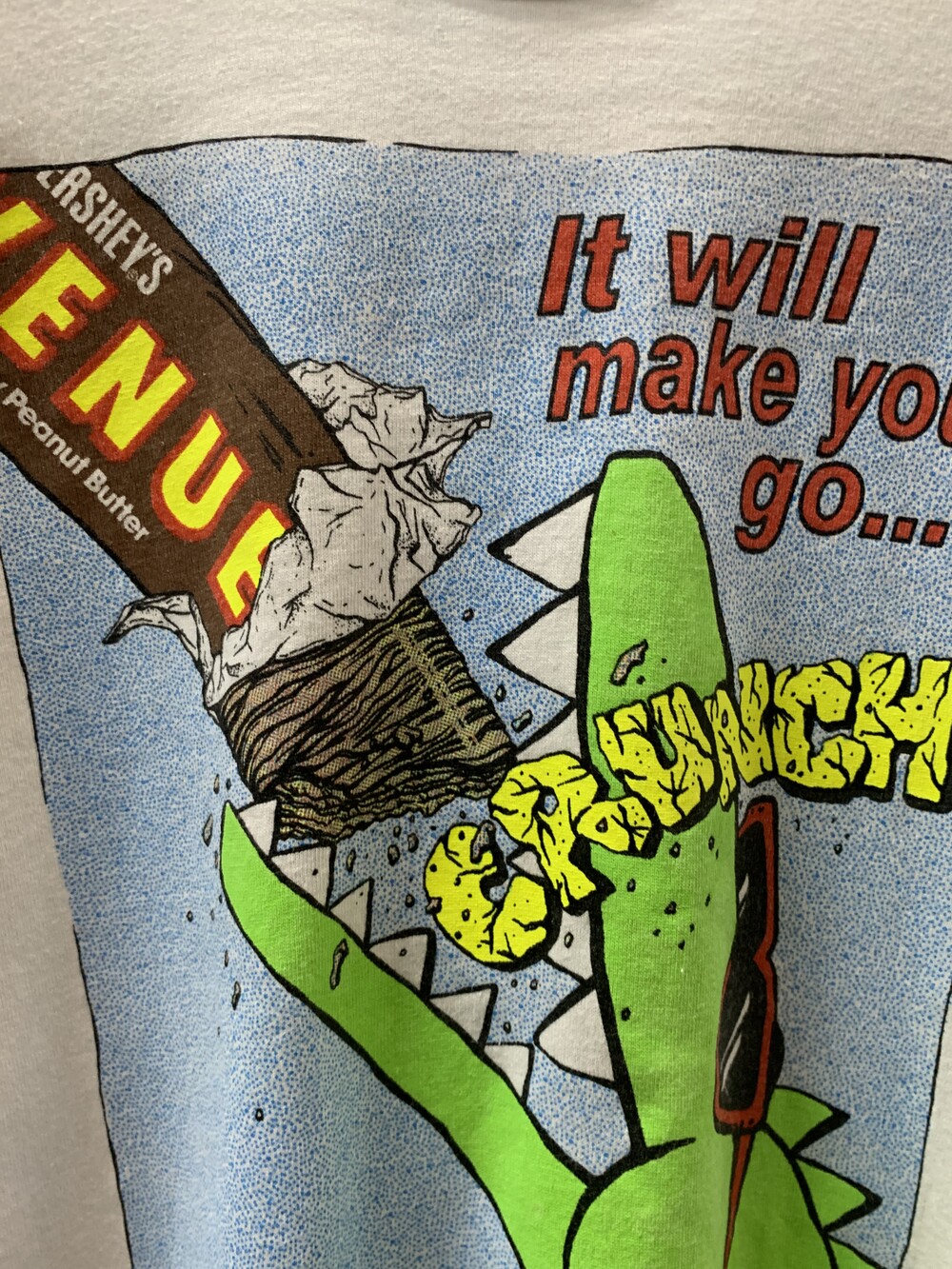 1936년 피넛버터 크런치가 밀크 초콜릿에 코팅된 캔디바 HERSHEY'S 5TH AVENUE 프로모션 프린팅이 올려진 티셔츠. 크런치함을 강조하는 스낵답게 It will make you go... CRUNCH 라는 슬로건을 사용했습니다.