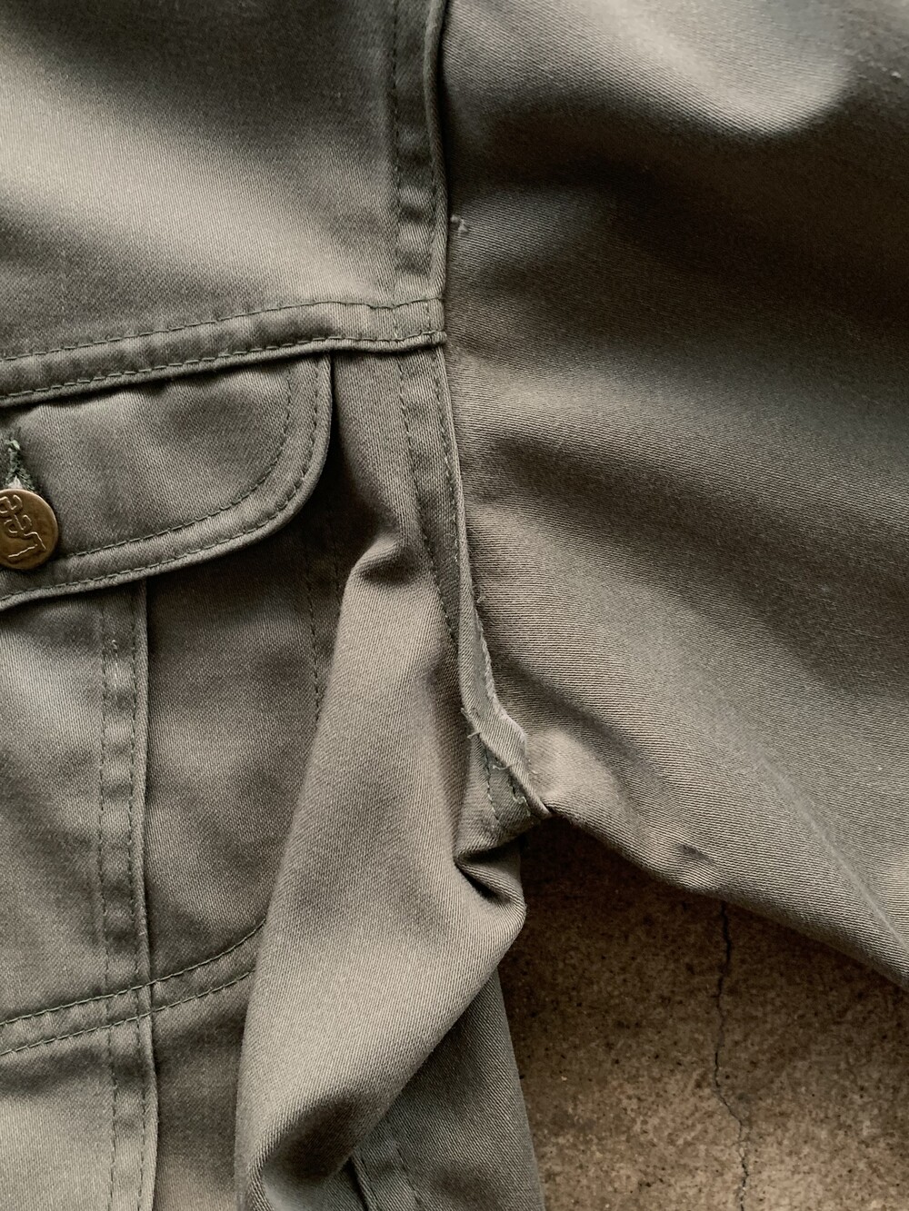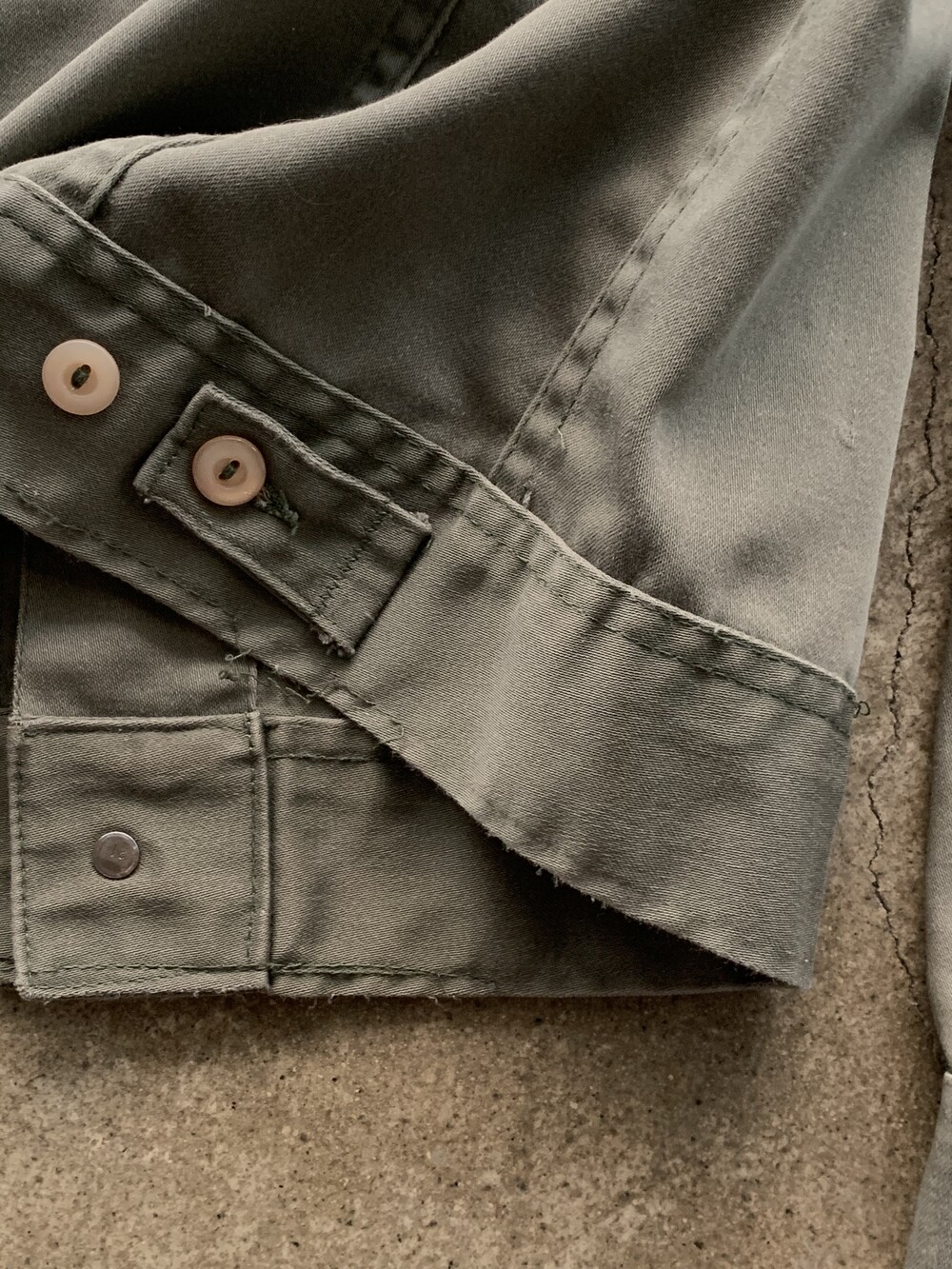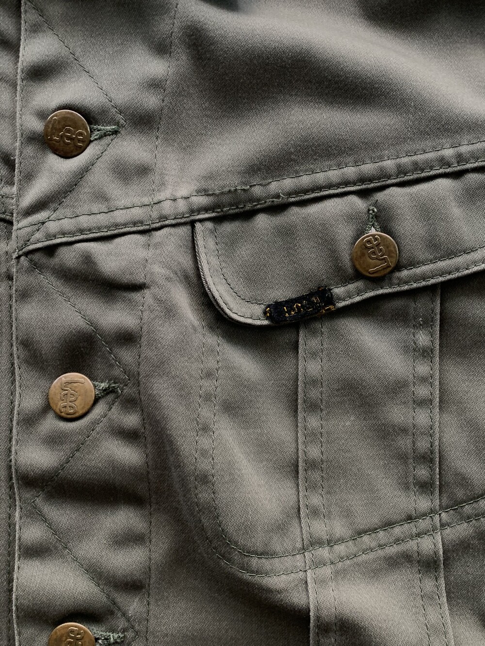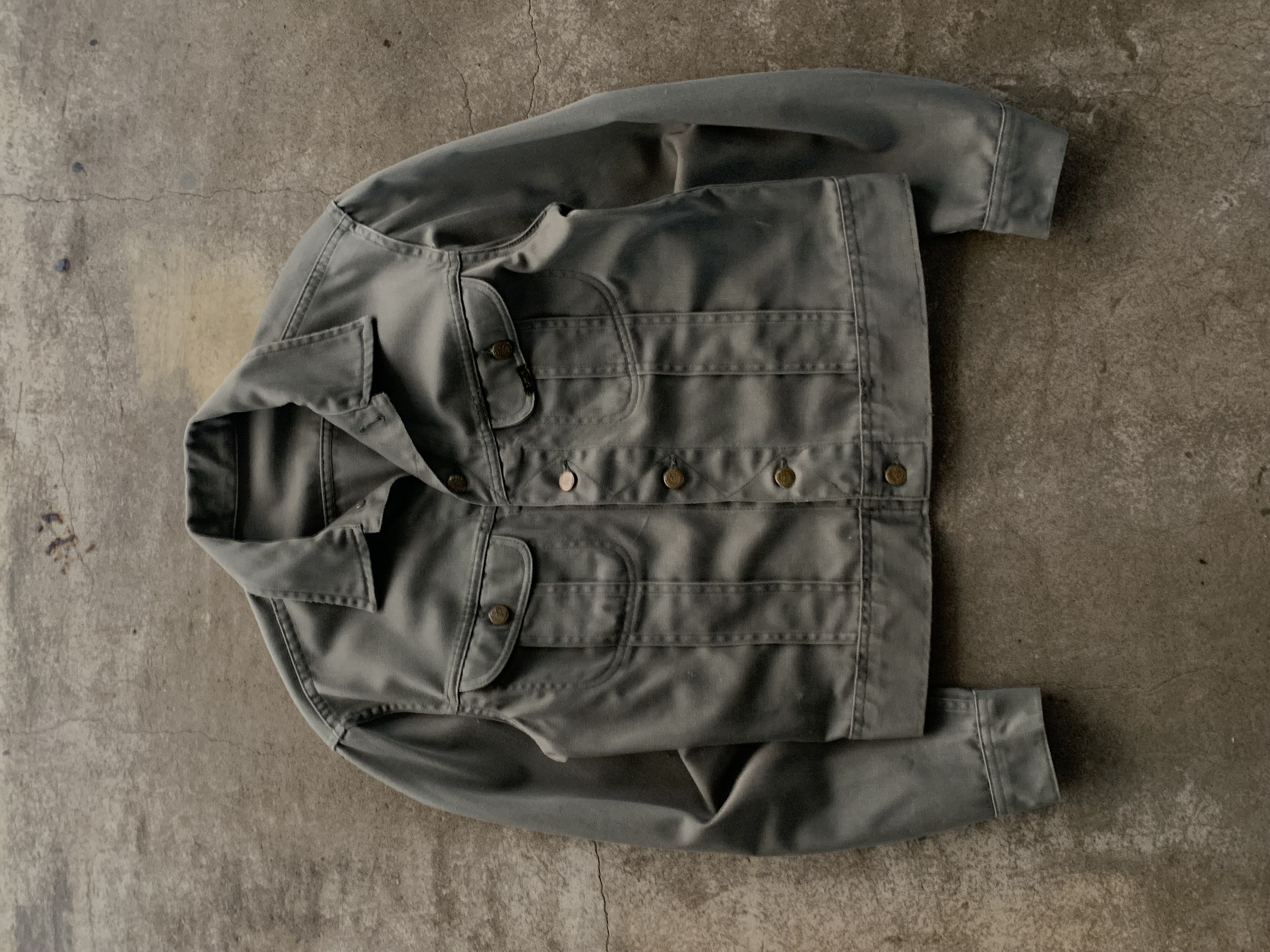 101-J 혹은 100-J로 대표되는 데님이나 코튼 트윌 소재 트러커자켓 디자인을 베이스로 올리브 컬러 코튼 사틴 원단이 적용되어 독특한 컬러와 질감을 보이는 제품입니다. 올드 데님 트러커 디자인을 소재를 바꾸어 선보인 사례는 이전부터 지금까지 꾸준히 있었으나 군납에서나 볼 법한 원단으로 제작된 트러커 자켓은 그 중에서도 보기 드문 사례로, 원단 특성상 극적인 페이딩을 기대할 순 없지만 군복에서 보이는 백사틴 원단의 가로줄 페이딩 정도의 은은한 경년변화를 기대할 수 있을만한 제품입니다.