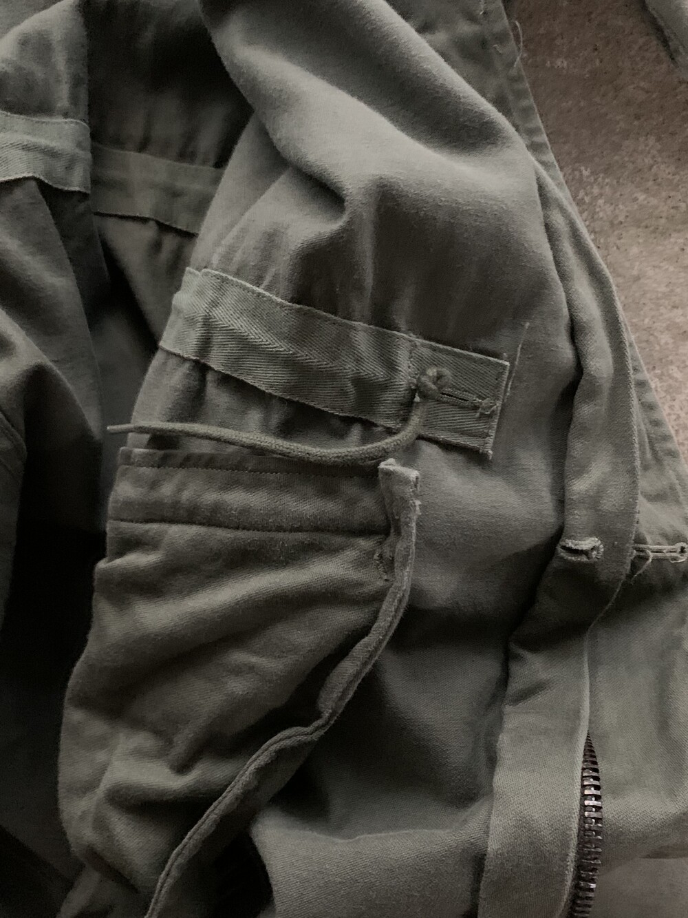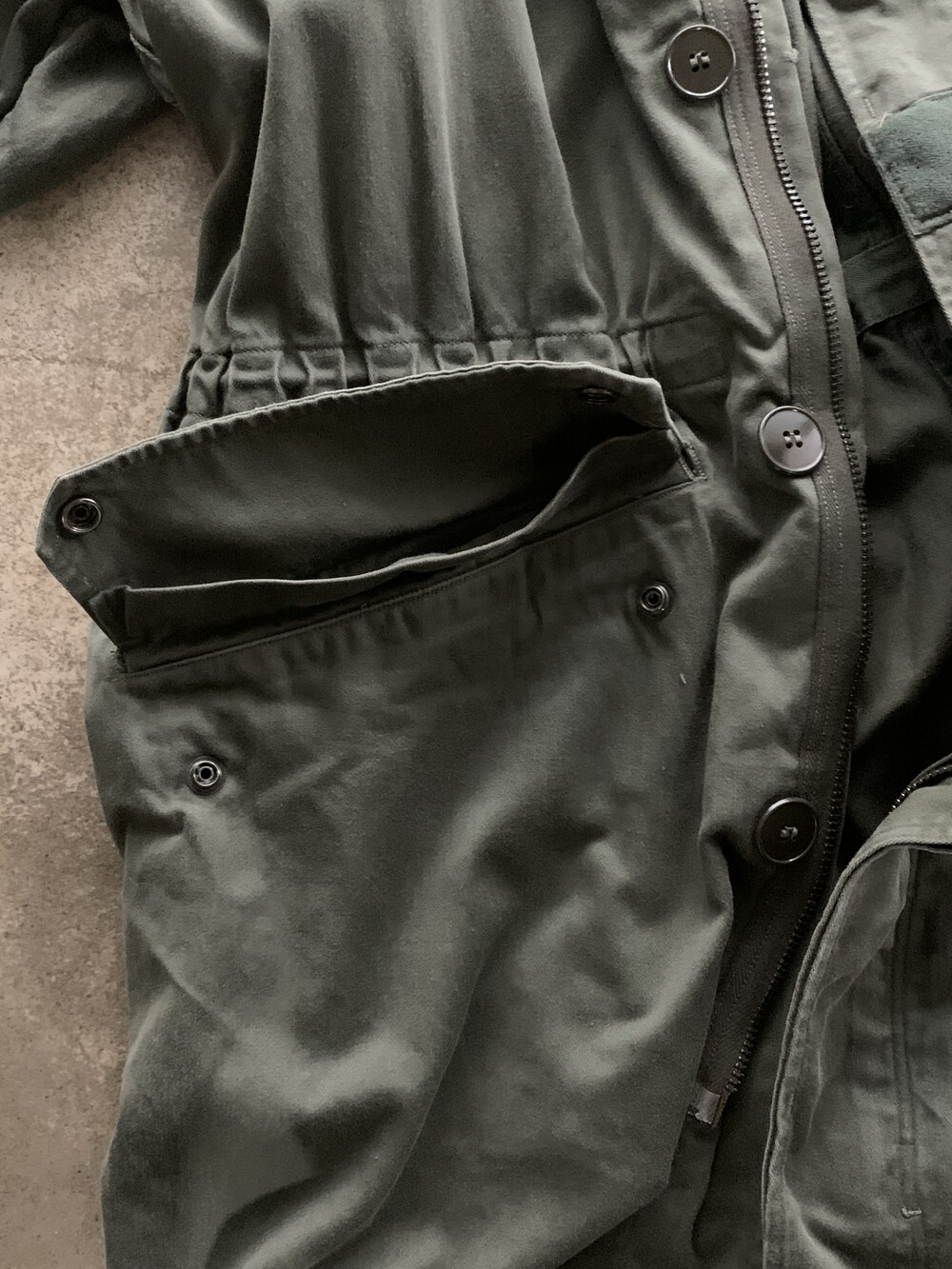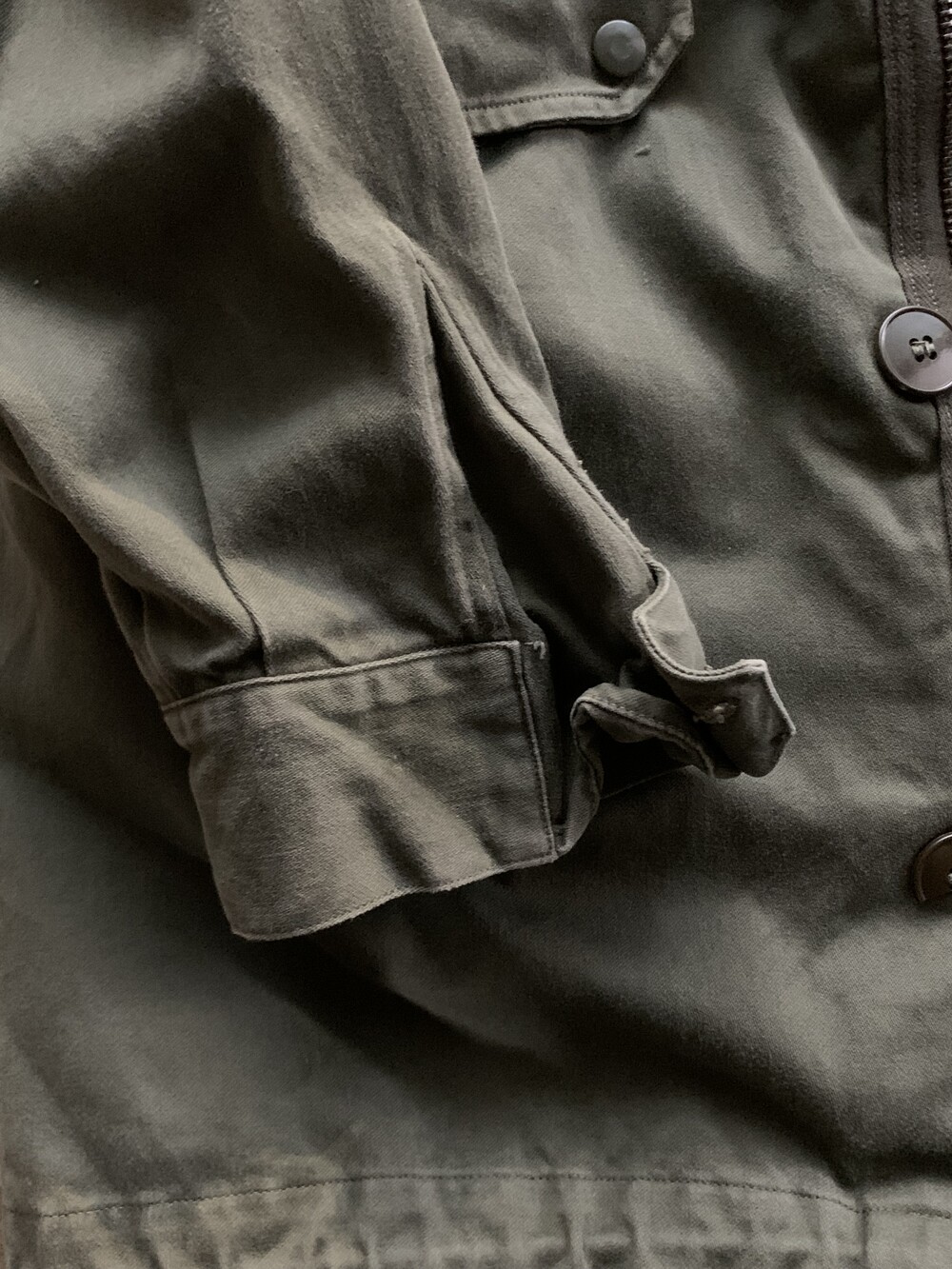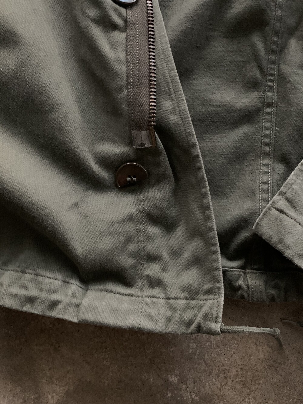 🚩Detail 코튼 사틴 원단과 후드 일체형의 미니멀한 디자인이 돋보이는, 1960년대 개발되어 1980년대까지 선보였던 프랑스군 M-1964 필드 파카. 군복에서 주로 보이는 견장, 뒷면 플리츠, 원활한 수납을 위한 추가 포켓 등이 보이지 않아 군복 치고도 미니멀한 구성이 매력적인 제품입니다.