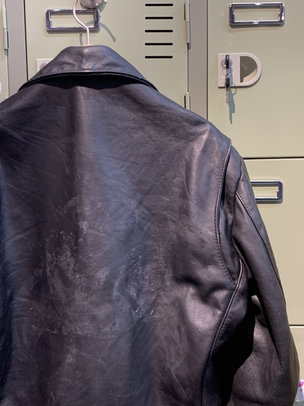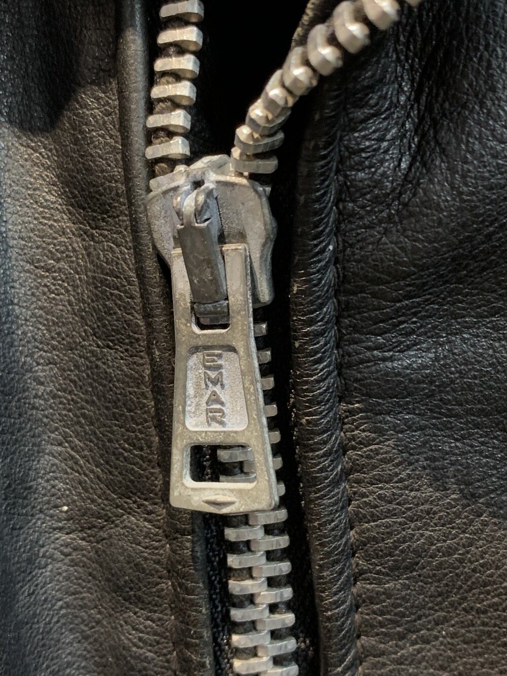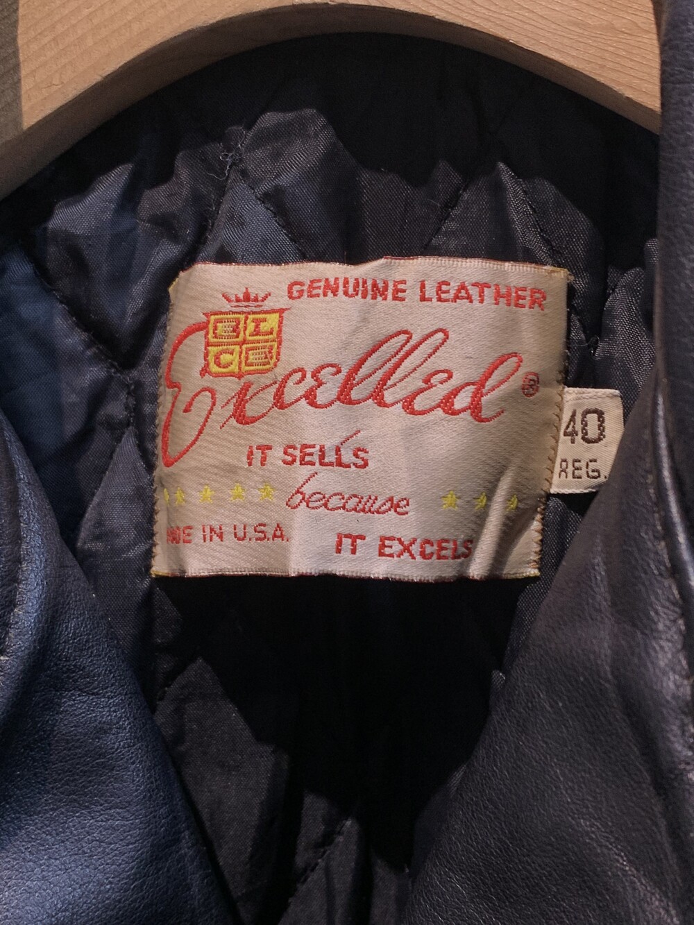 🚩Detail 1920년대부터 가죽자켓을 취급해 온 미국발 메이커 EXCELLED의 더블 브레스티드 타입의 레더 바이커 자켓입니다. 전형적인 더블브레스티드 레더 자켓으로, 바람에 날리지 않도록 플랩이나 칼라 등을 고정할 수 있는 스냅 디테일이나 가죽 특유의 뻣뻣한 원단감의 옷을 활동성을 보완하기 위한 액션 플리츠 등의 구성요소 또한 빠짐없이 갖추고 있습니다. 너무 얇지도 그렇다고 두껍지도 않은 적당한 두께감과 표기 대비 타이트하지 않은 사이즈로 이너에 스웻후디 등을 매치하여 캐주얼하게 척용해도 좋을만한 제품입니다.전면 EMAR, 소매 YKK 지퍼 사양으로 미루어 1970년대 전후로 추정되며 뒷면에 패치를 붙인듯한 흔적이나 자잘한 얼룩 등의 사용감 있는 제품으로 100호 전후로 착용하는 분들에게 권장드립니다.