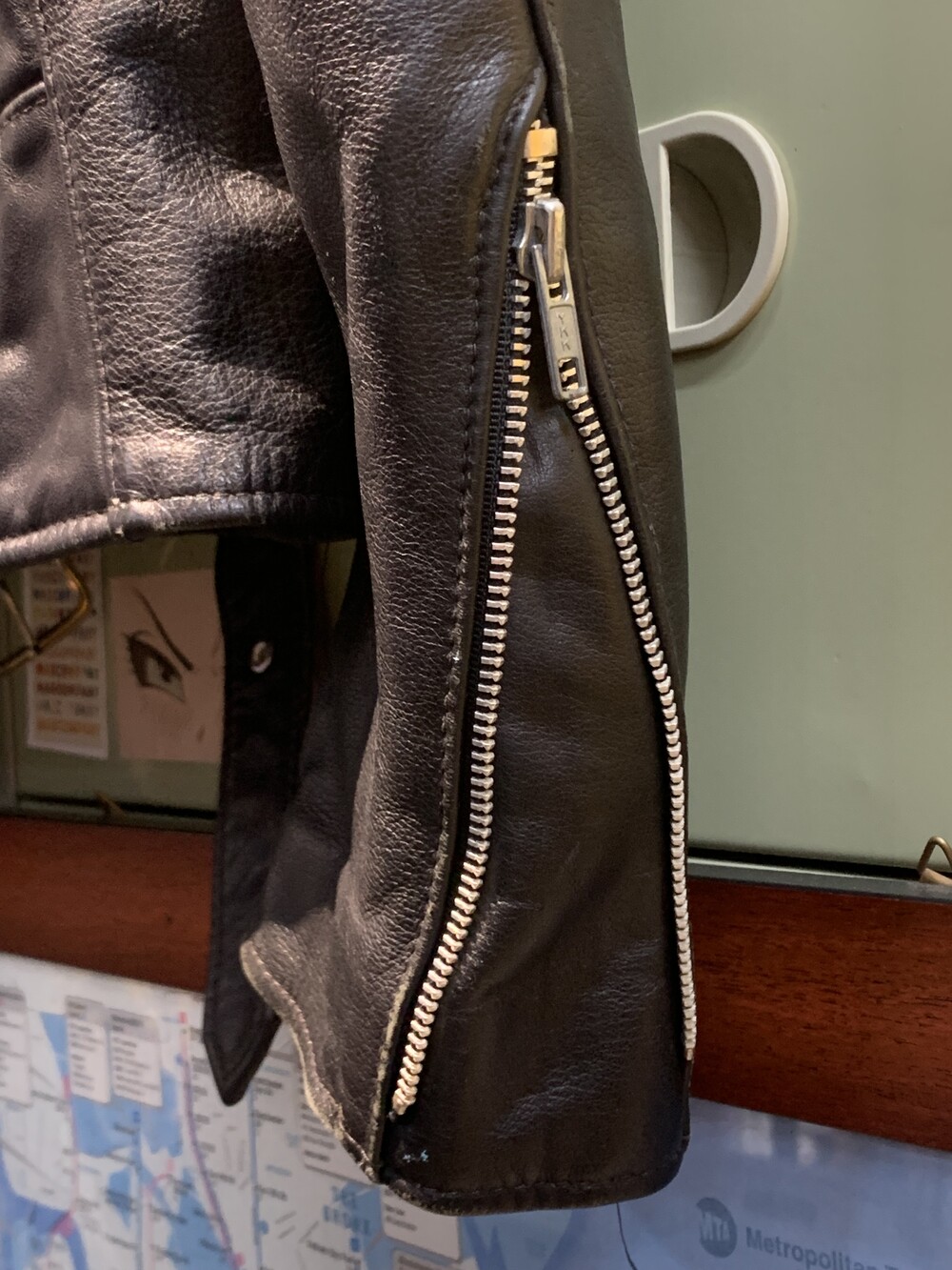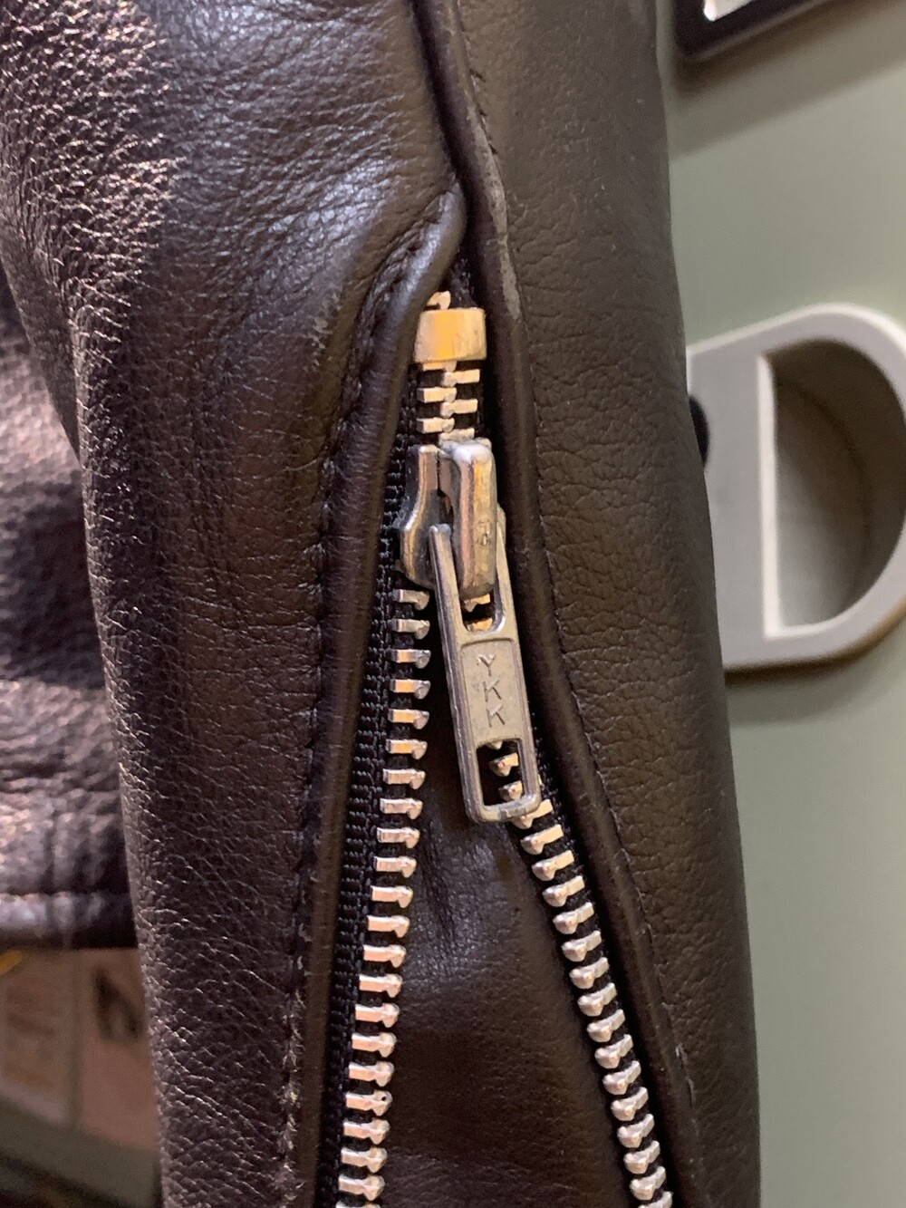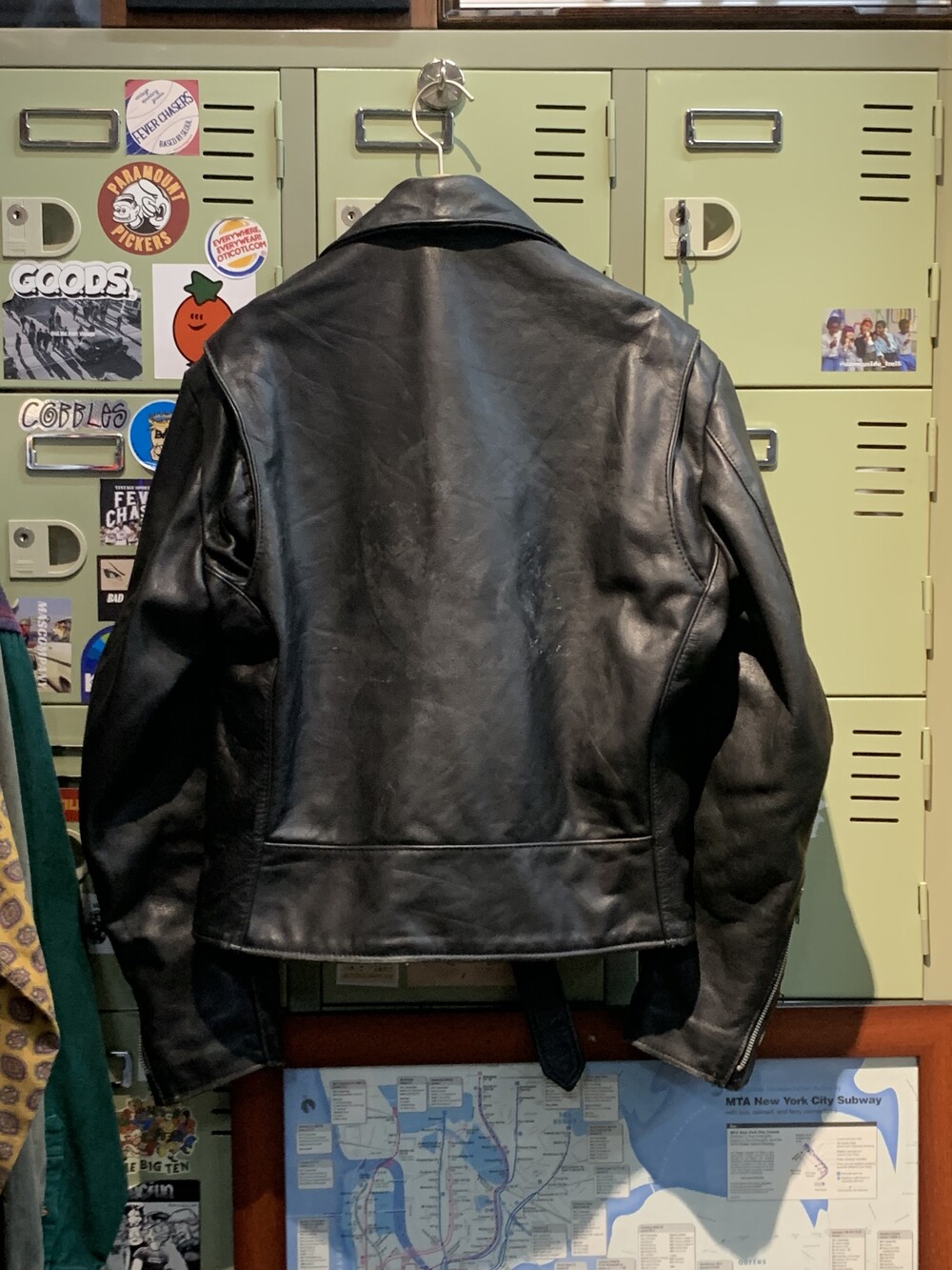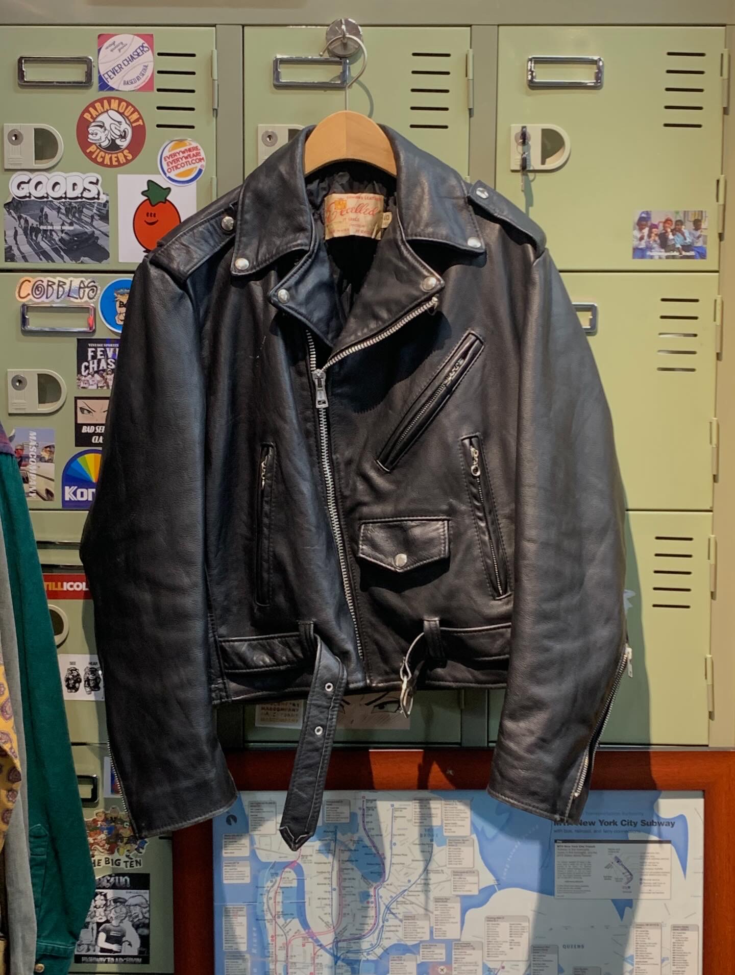🚩Detail 1920년대부터 가죽자켓을 취급해 온 미국발 메이커 EXCELLED의 더블 브레스티드 타입의 레더 바이커 자켓입니다. 전형적인 더블브레스티드 레더 자켓으로, 바람에 날리지 않도록 플랩이나 칼라 등을 고정할 수 있는 스냅 디테일이나 가죽 특유의 뻣뻣한 원단감의 옷을 활동성을 보완하기 위한 액션 플리츠 등의 구성요소 또한 빠짐없이 갖추고 있습니다. 너무 얇지도 그렇다고 두껍지도 않은 적당한 두께감과 표기 대비 타이트하지 않은 사이즈로 이너에 스웻후디 등을 매치하여 캐주얼하게 척용해도 좋을만한 제품입니다.전면 EMAR, 소매 YKK 지퍼 사양으로 미루어 1970년대 전후로 추정되며 뒷면에 패치를 붙인듯한 흔적이나 자잘한 얼룩 등의 사용감 있는 제품으로 100호 전후로 착용하는 분들에게 권장드립니다.