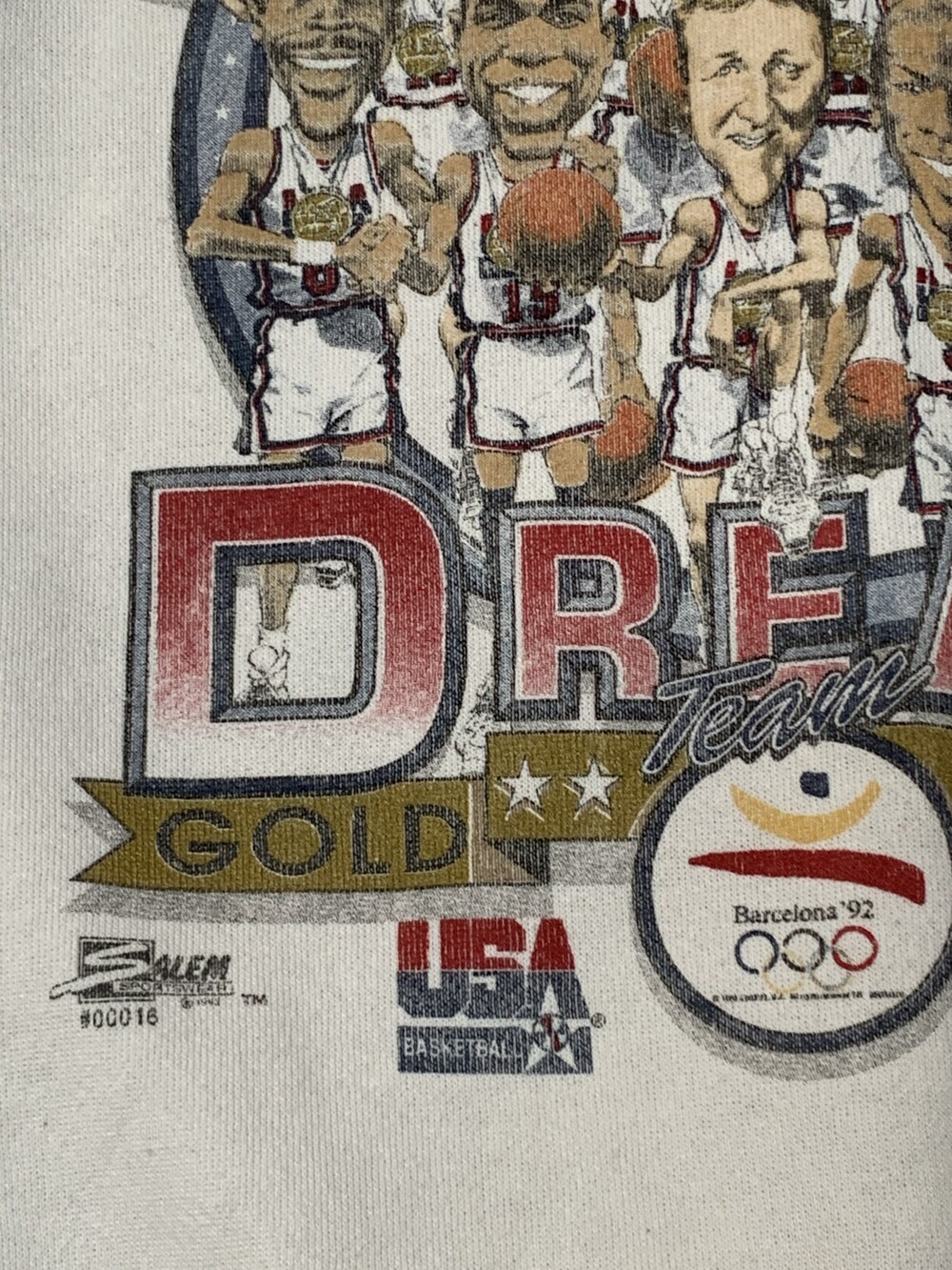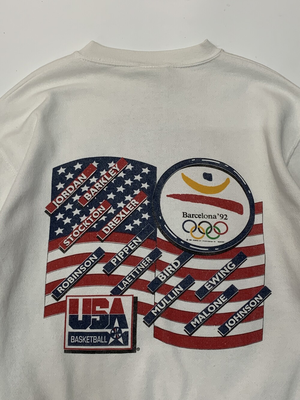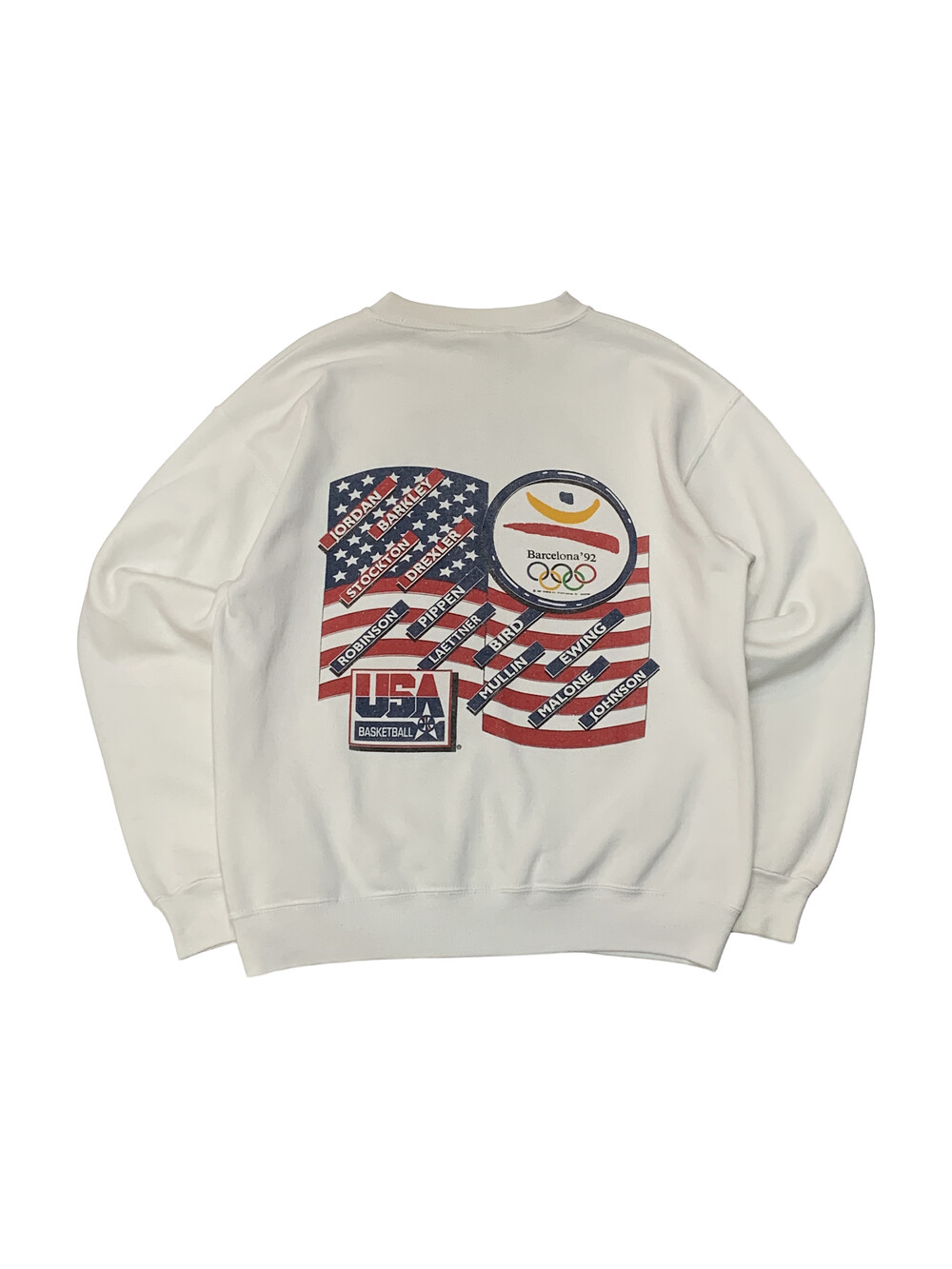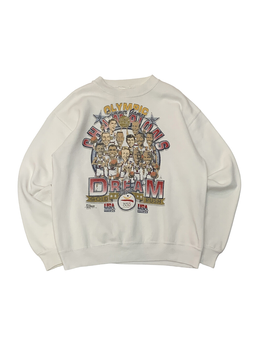 🚩Detail 마이클 조던, 찰스 바클리, 존 스탁턴, 클라이드 드렉슬러, 데이비드 로빈슨, 스카티 피펜, 래리버드, 크리스 멀린, 패트릭 유잉, 칼 말론, 매직 존슨 등의 초호화 멤버로 구성된 미국 남자농구 국가대표팀 중에서도 역대급 구성으로 드림팀(DREAM TEAM)이라는 수식어가 붙은 시절, 1992년 개최된 바르셀로나 하계 올림픽에서 우승을 차지한 것을 기념하는 내용의 프린팅이 올려진 스웻셔츠입니다. 튜블러 타입의 TULTEX MAXIMUM SWEATS 바디에 전후면에 프린팅이 올려진 제품입니다.