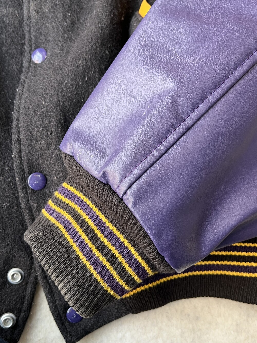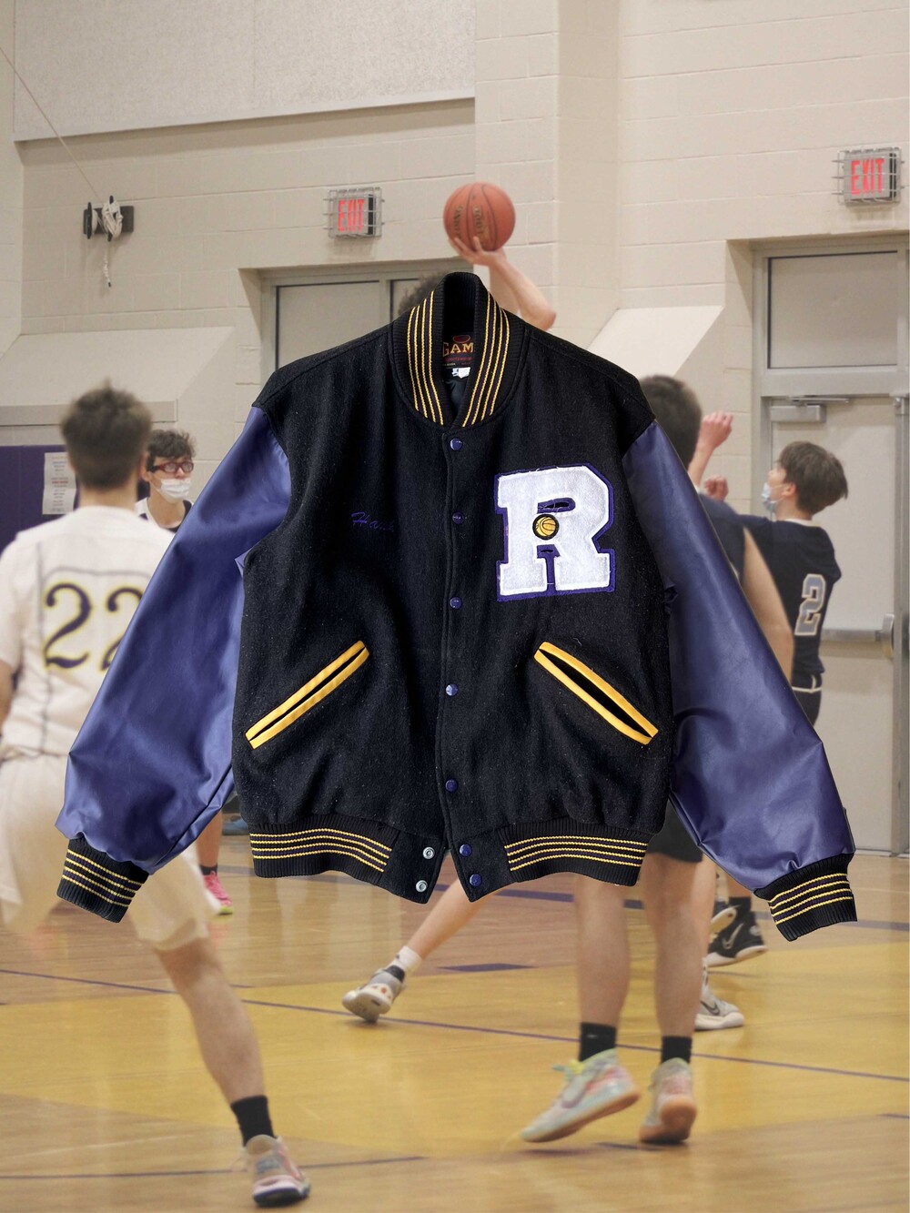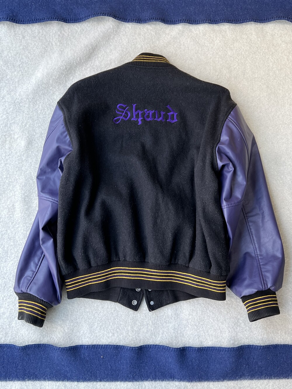 Rhinebeck High School 의 바시티 팀인 Rhinebeck Hawks 자수와 셔닐패치가 전면에, 후면에는 Shaud 자수가 놓인 제품으로, 독특한 배색이 돋보입니다.