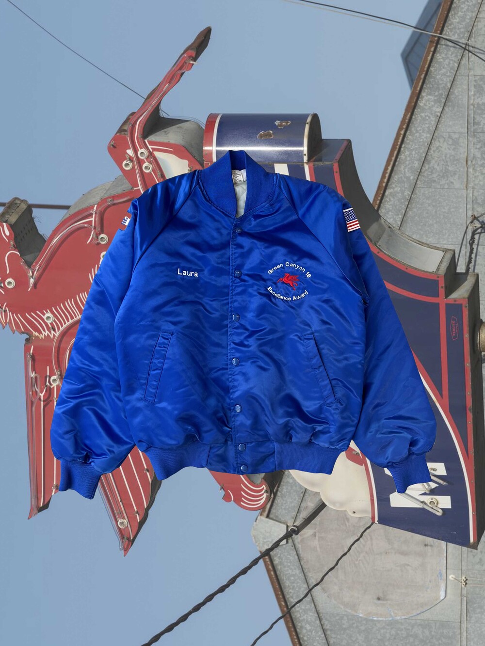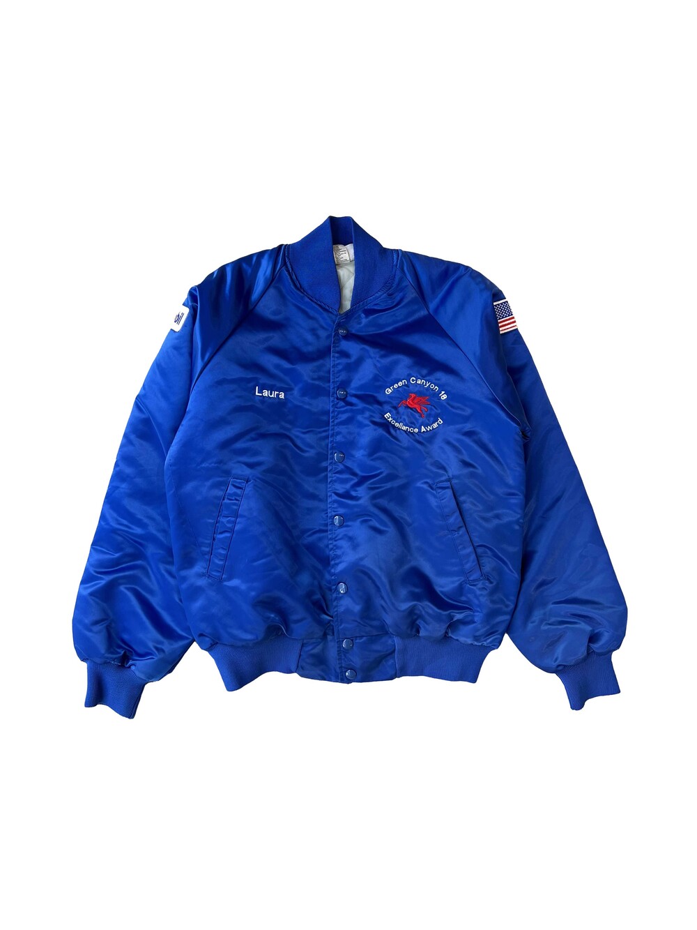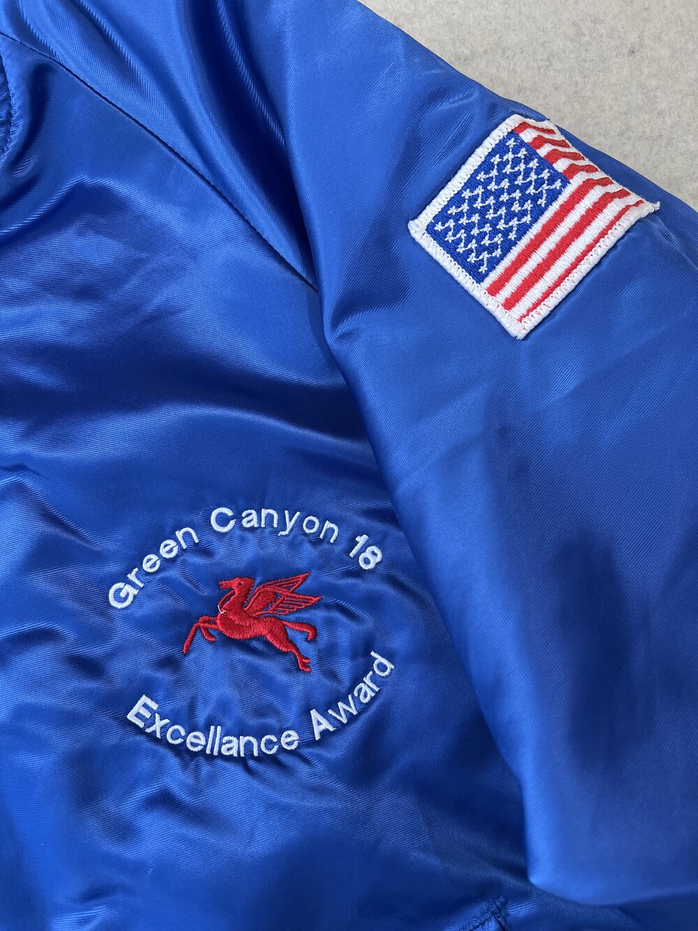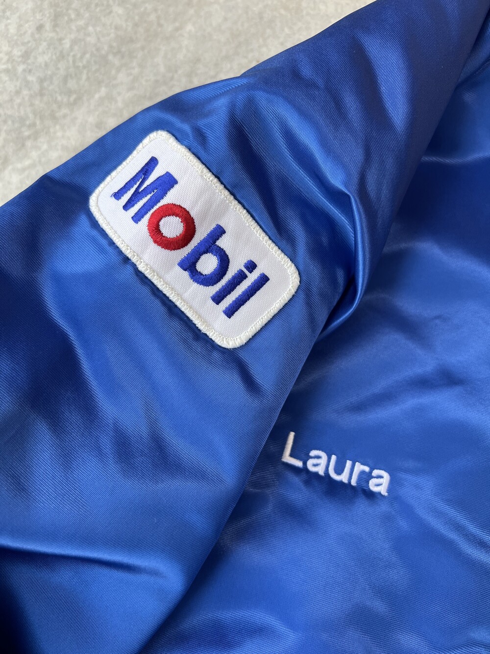 전면과 소매 부분에 MOBIL 관련 패치 및 자수, 그리고 성조기 패치가 놓여 있습니다.