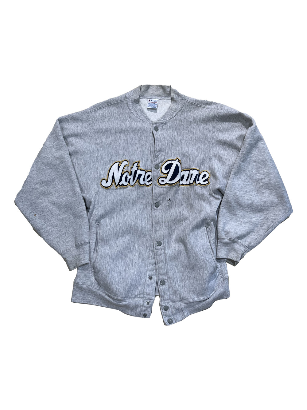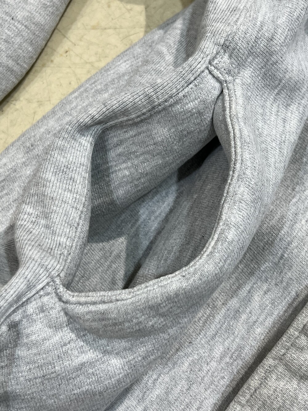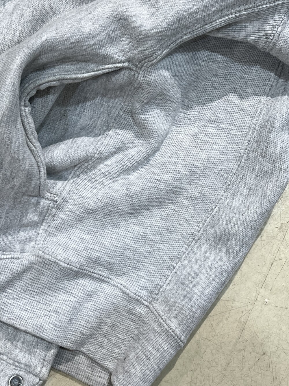[DETAIL] - 일반적인 의류의 재단방향을 90도로 돌려 재단하여 제작된 호라이즌 위브(Horizontal Weave) - 팔을 편하게 움직일 수 있도록 암홀을 의도적으로 넓게 만든 프리 스윙 슬리브(Free Swing Sleeve) - 목 옆부터 어깨 절개선까지의 시접이 없는 심리스 숄더(Seamless Sholder) - 암홀 아래부터 몸판을 잡아주는 역할을 하는 사이드패널(Side Panel) - 전면 스냅버튼이 있는 카디건 타입의 스웻셔츠 - 노터데임(Notre Dame) 대학교 패치