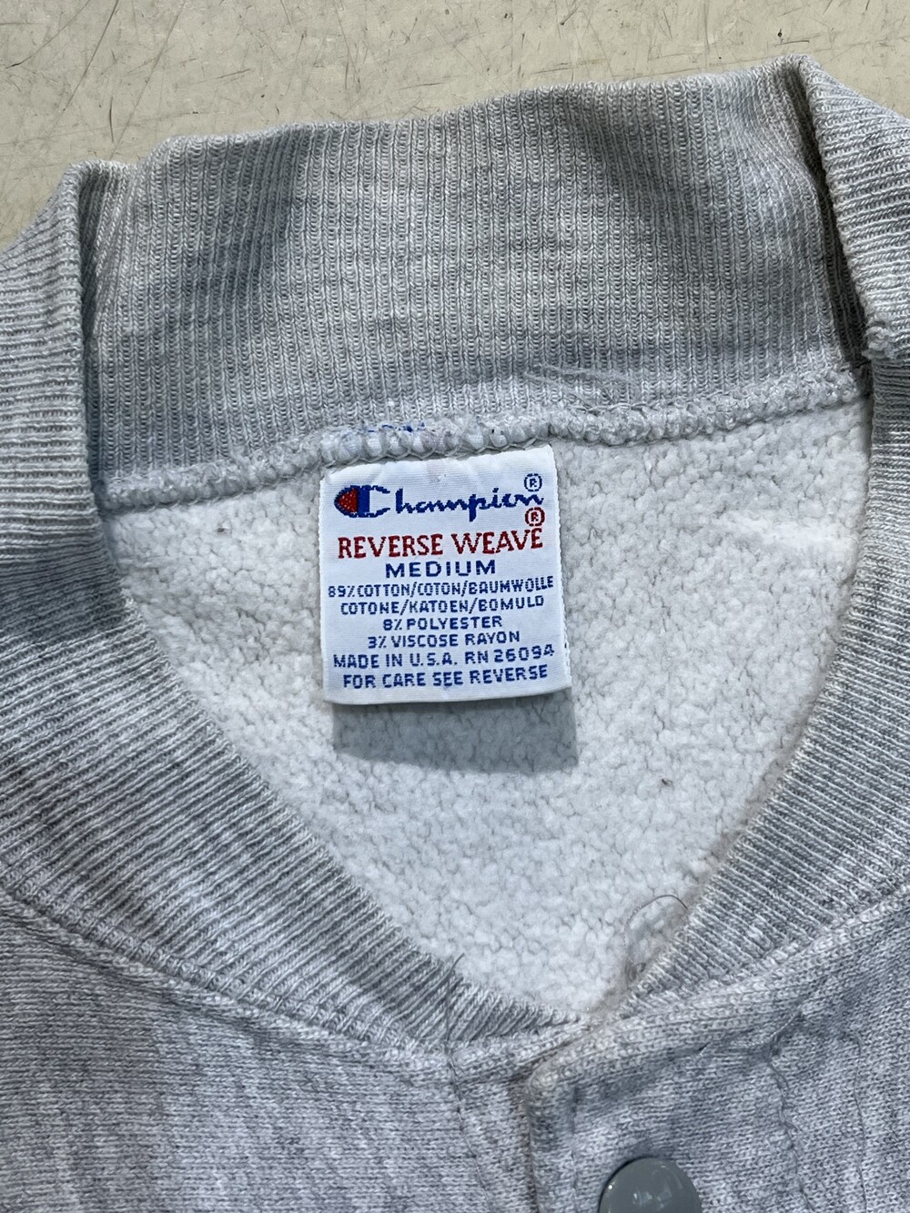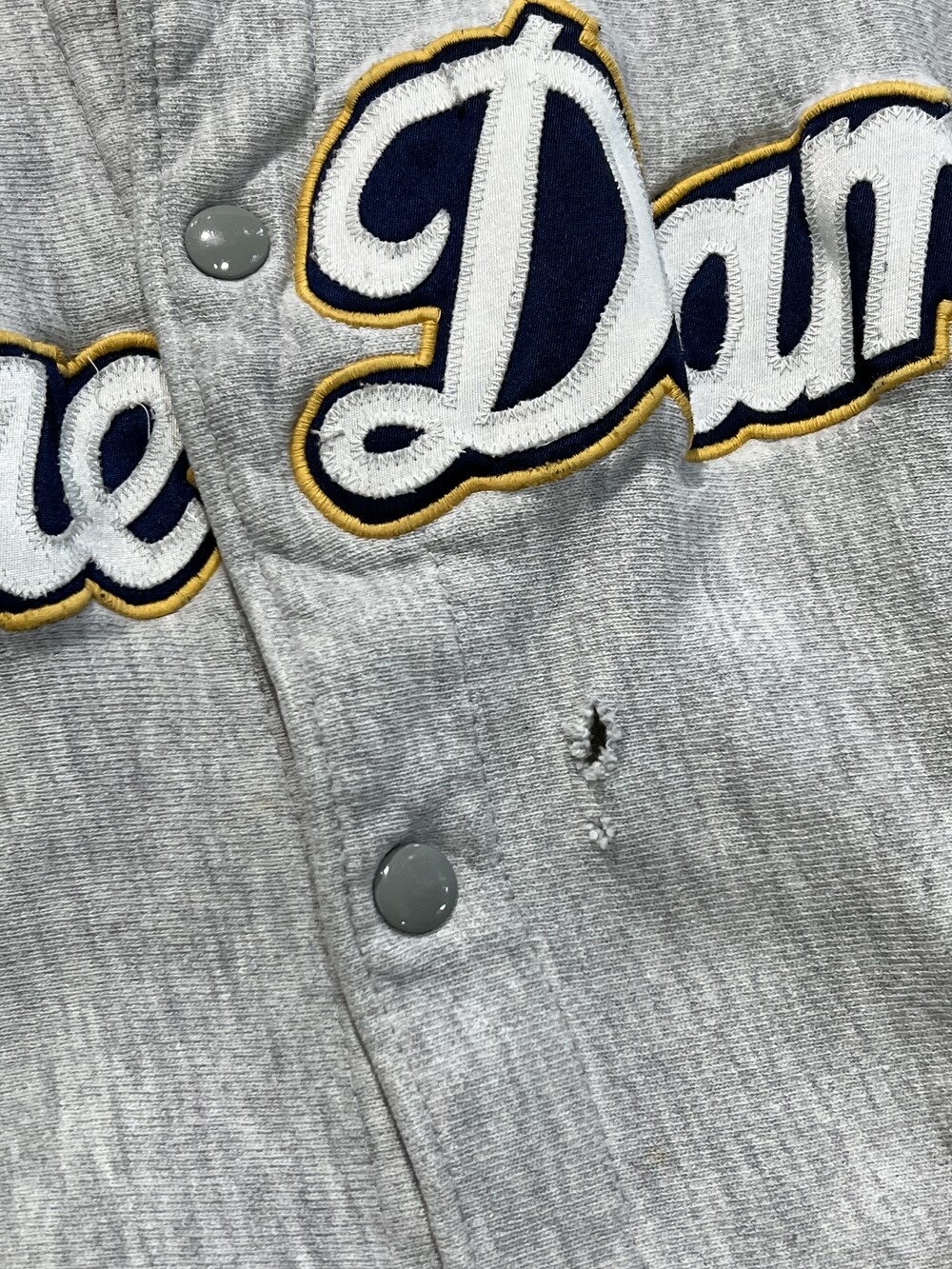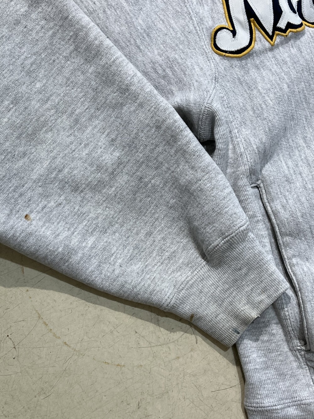 [DETAIL] - 일반적인 의류의 재단방향을 90도로 돌려 재단하여 제작된 호라이즌 위브(Horizontal Weave) - 팔을 편하게 움직일 수 있도록 암홀을 의도적으로 넓게 만든 프리 스윙 슬리브(Free Swing Sleeve) - 목 옆부터 어깨 절개선까지의 시접이 없는 심리스 숄더(Seamless Sholder) - 암홀 아래부터 몸판을 잡아주는 역할을 하는 사이드패널(Side Panel) - 전면 스냅버튼이 있는 카디건 타입의 스웻셔츠 - 노터데임(Notre Dame) 대학교 패치