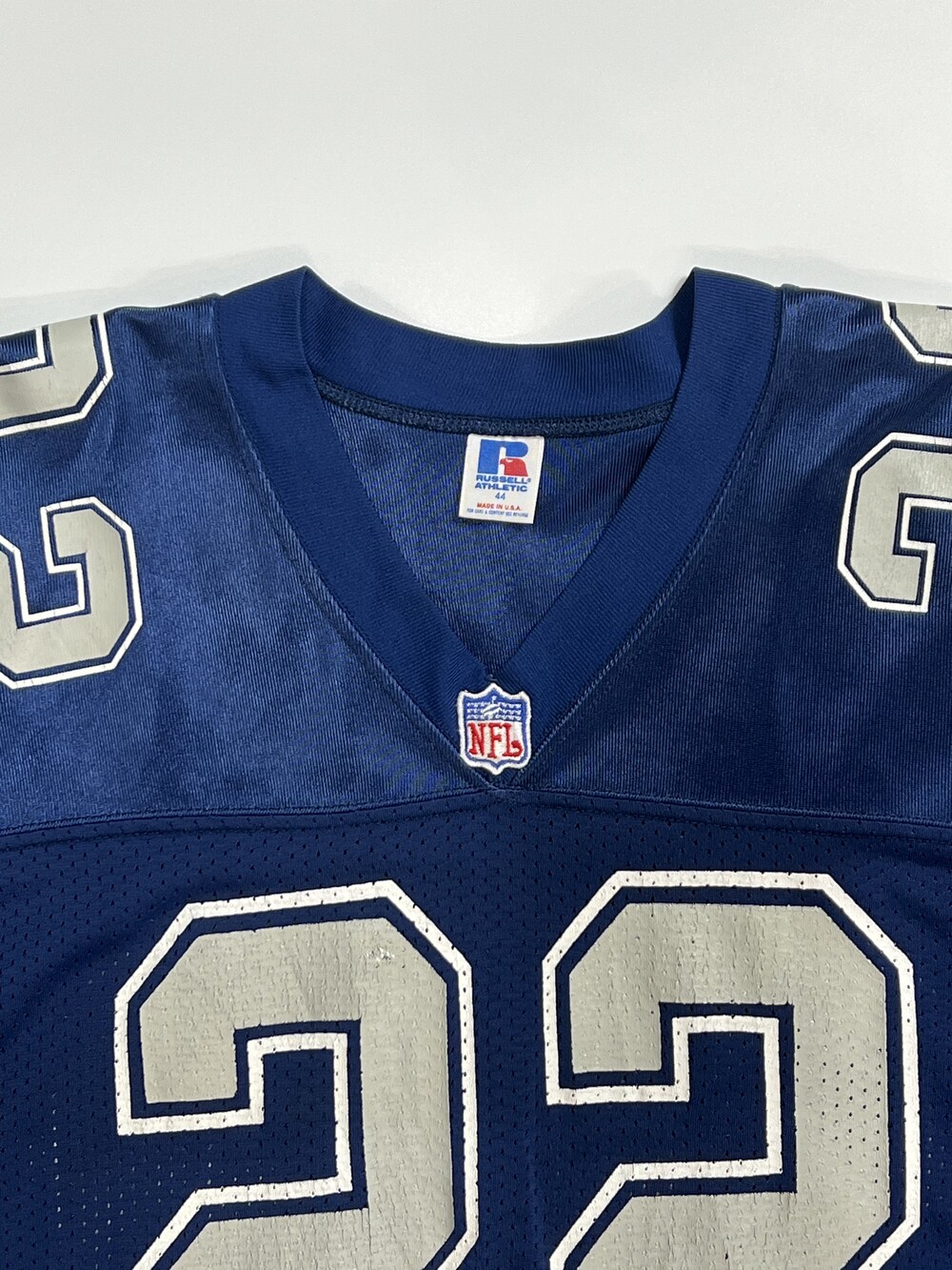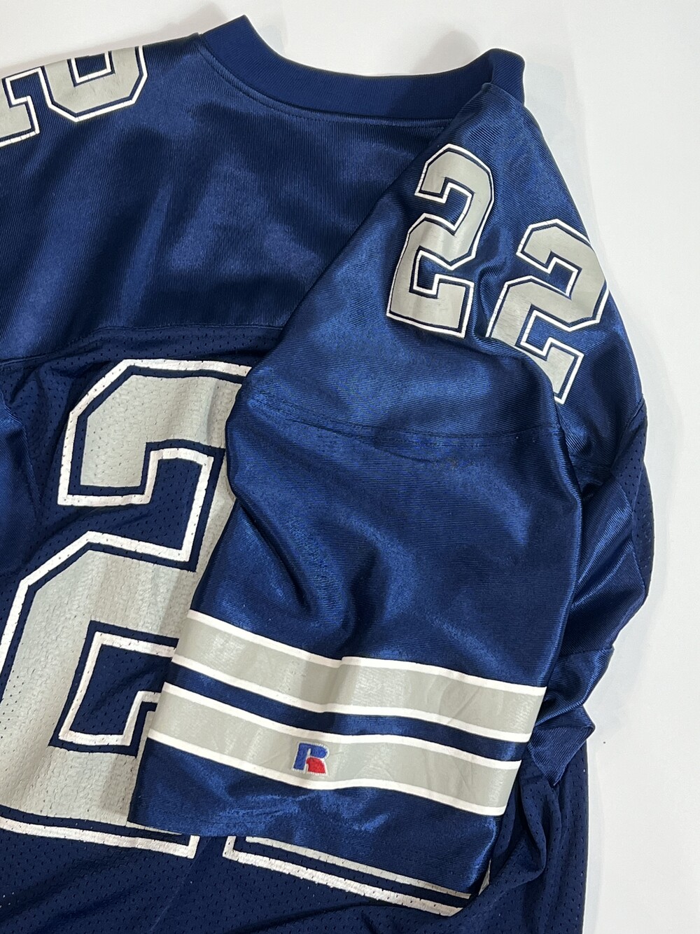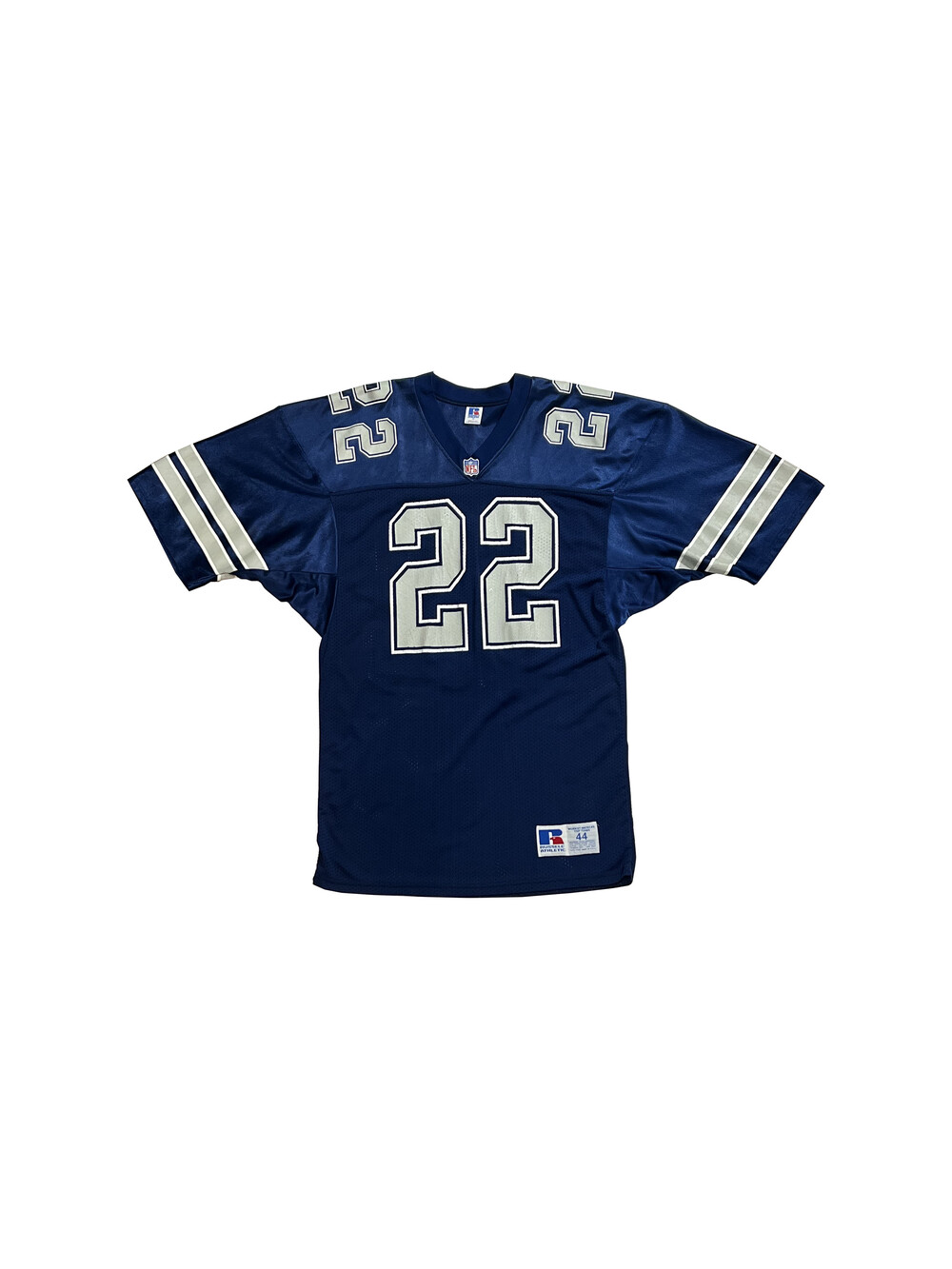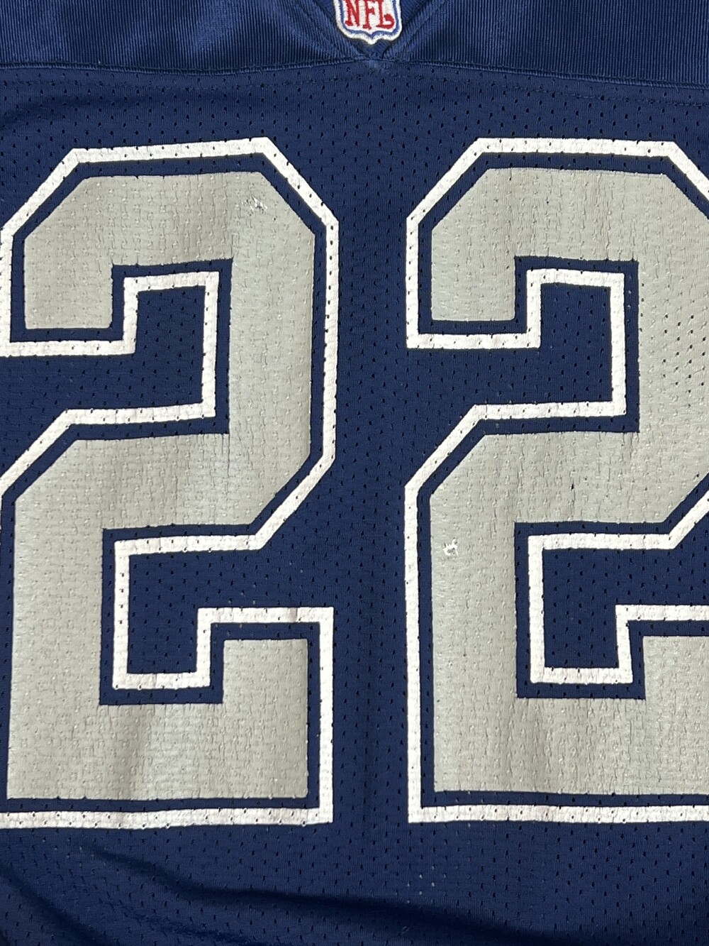 🚩Detail 프로 미식축구 리그 NFL 소속 팀들 중에서도 압도적인 마켓 파워를 자랑하는 댈러스 카우보이스 풋볼 저지. 두께감 있는 나일론 원단에 밑단 트임이 따로 없어 선수들이 착용하던 제품으로 추정됩니다. 등번호 22번은 당시 1990년부터 2002년까지 주전 러닝백으로 활약하던 에밋 스미스(EMMITT SMITH) 선수입니다.