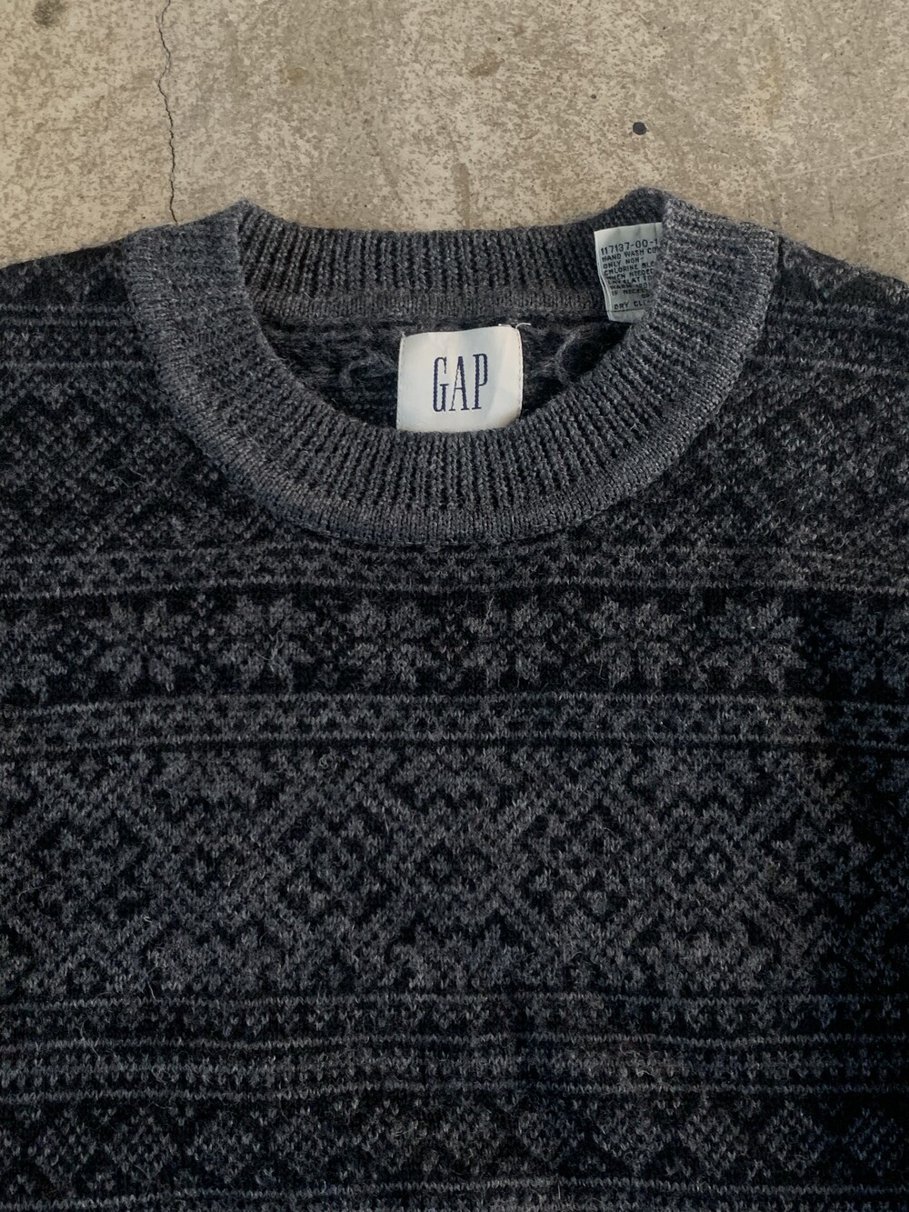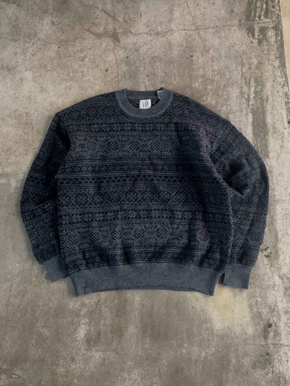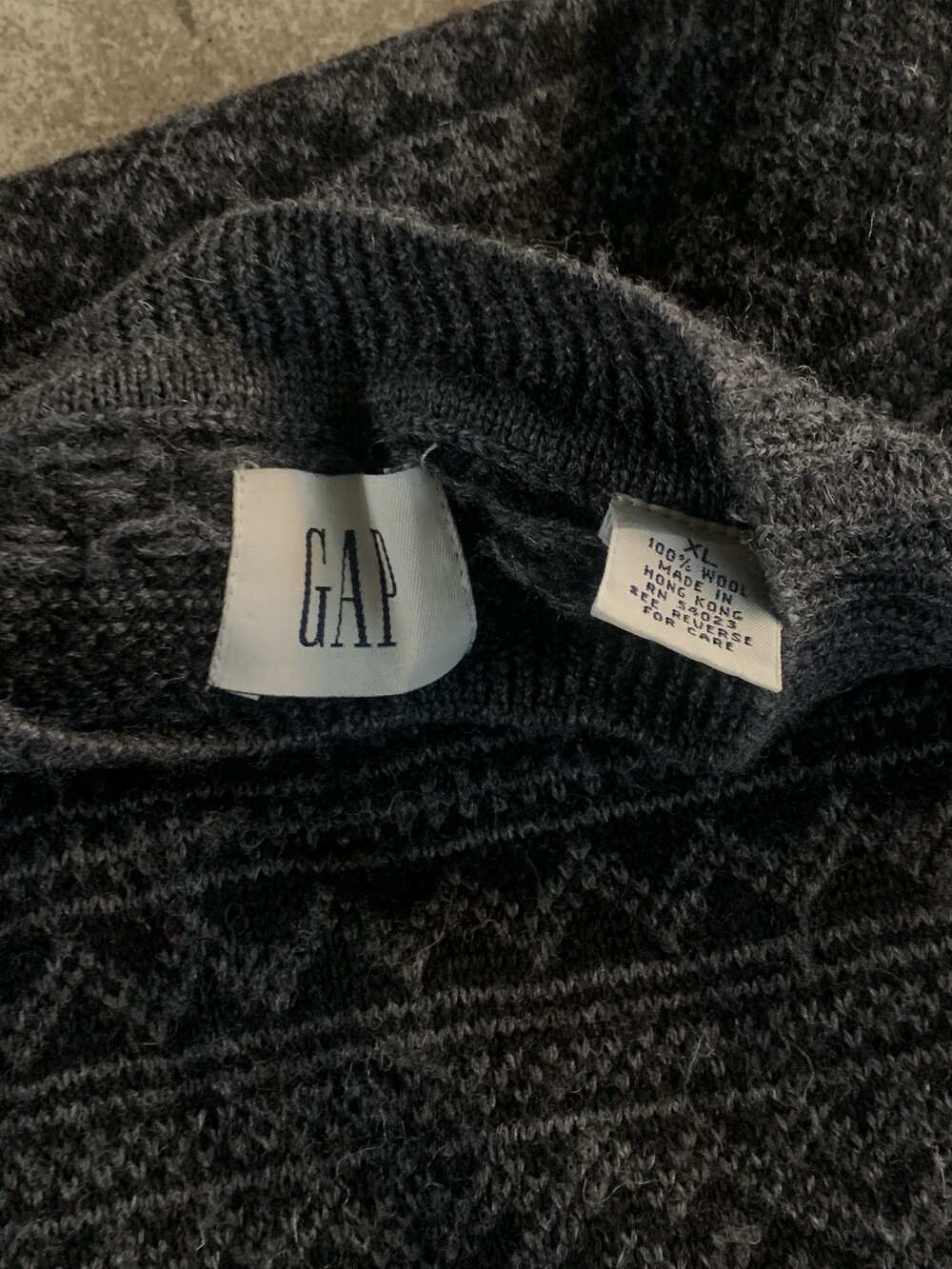 1990년도에서 2000년도 사이에 생산된 것으로 추정되는 올드 갭의 울 스웨터. 누구나 입기 좋을만한 얄팍하지도, 그렇다고 두껍지도 않은 적당한 두께감에 블랙&그레이 배색의 노르위전 패턴으로 두께감있는 아우터나 푸퍼베스트, 혹은 코트 이너로 활용하기 좋을만한 제품입니다.