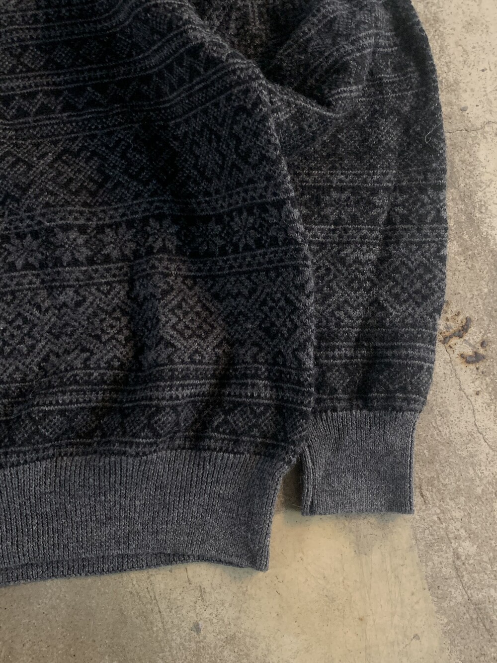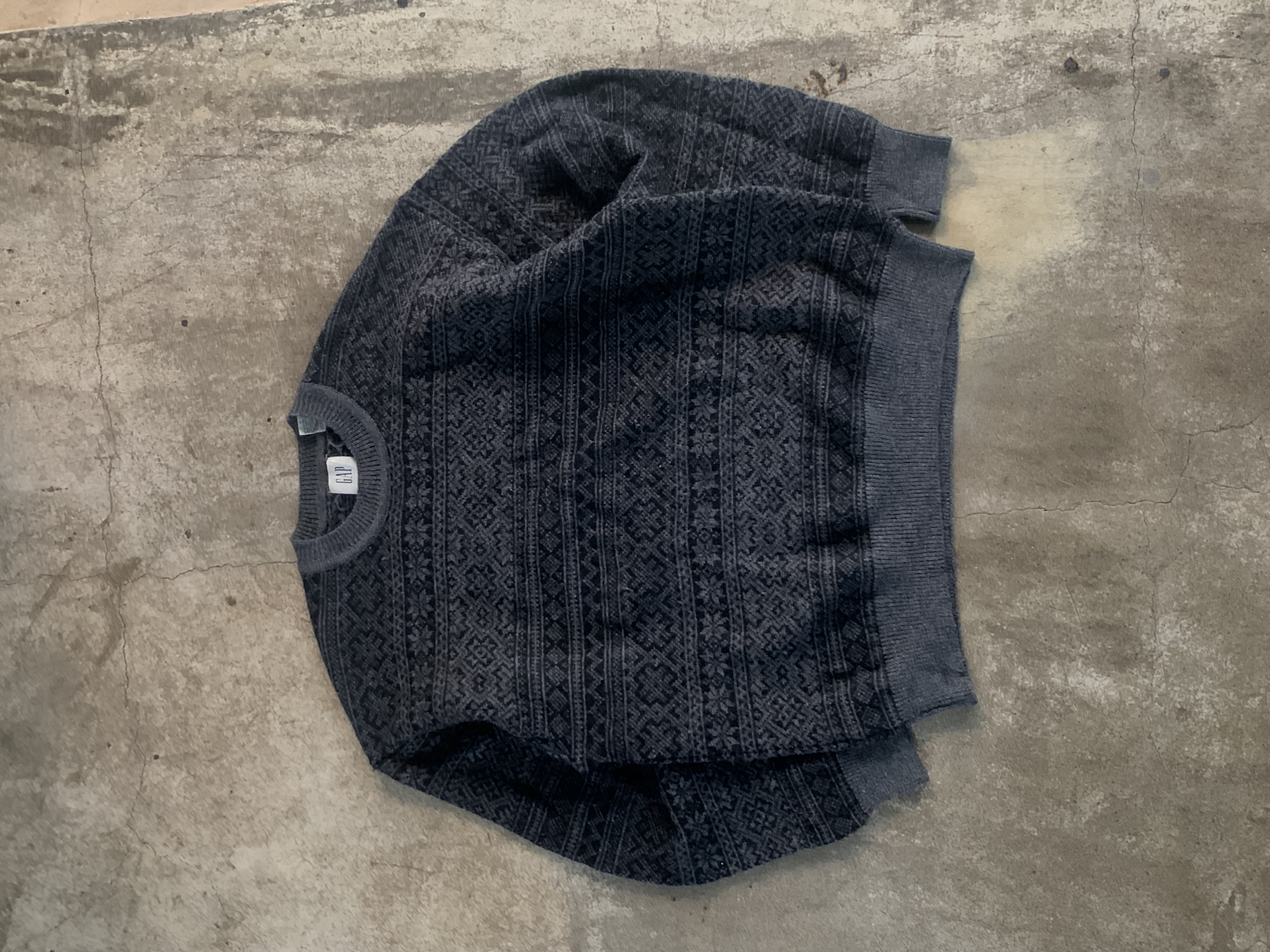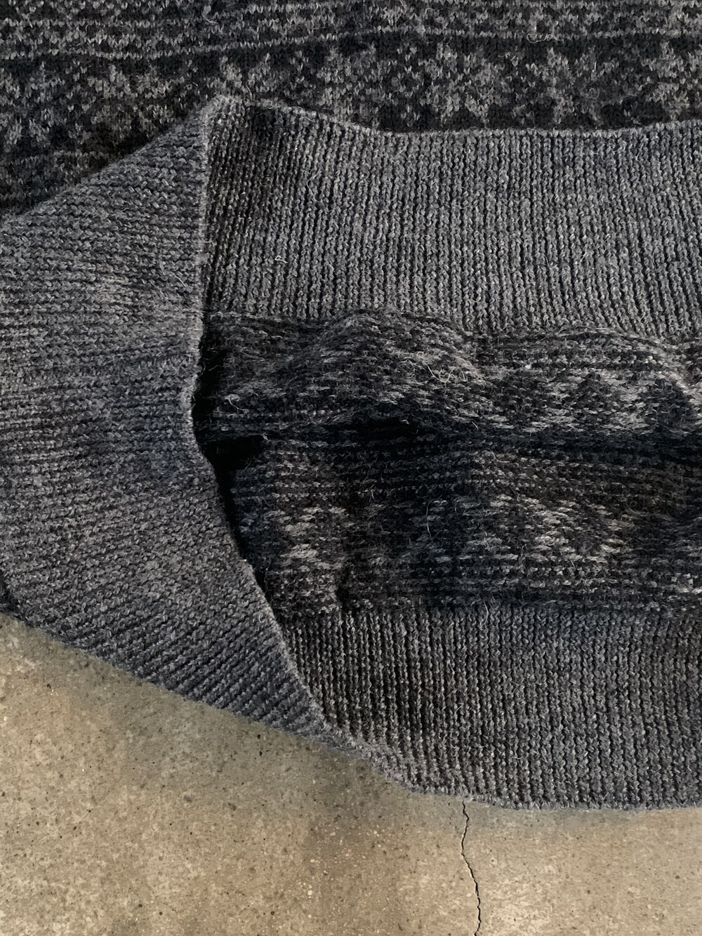 1990년도에서 2000년도 사이에 생산된 것으로 추정되는 올드 갭의 울 스웨터. 누구나 입기 좋을만한 얄팍하지도, 그렇다고 두껍지도 않은 적당한 두께감에 블랙&그레이 배색의 노르위전 패턴으로 두께감있는 아우터나 푸퍼베스트, 혹은 코트 이너로 활용하기 좋을만한 제품입니다.