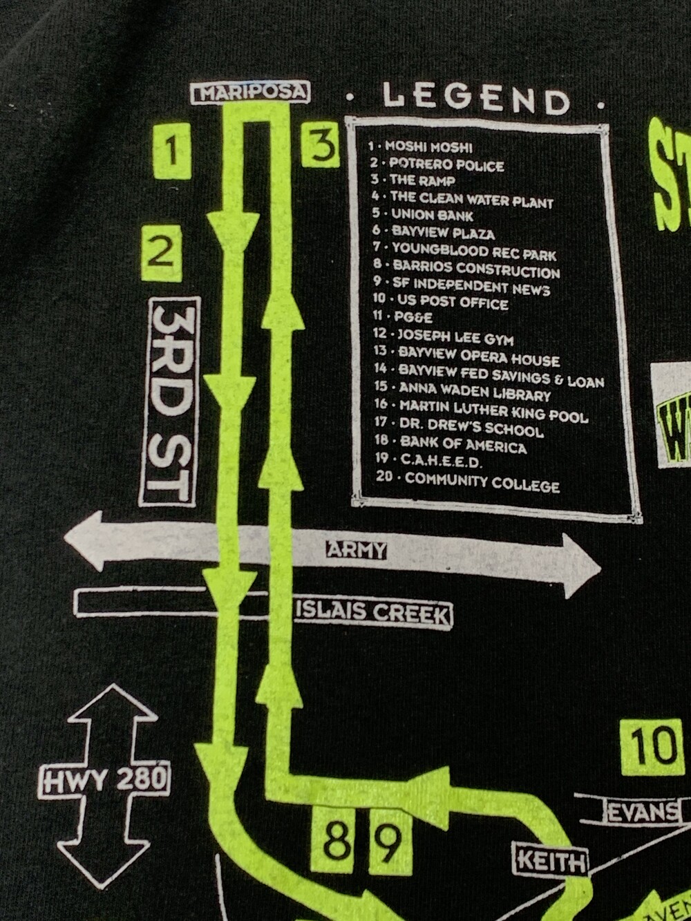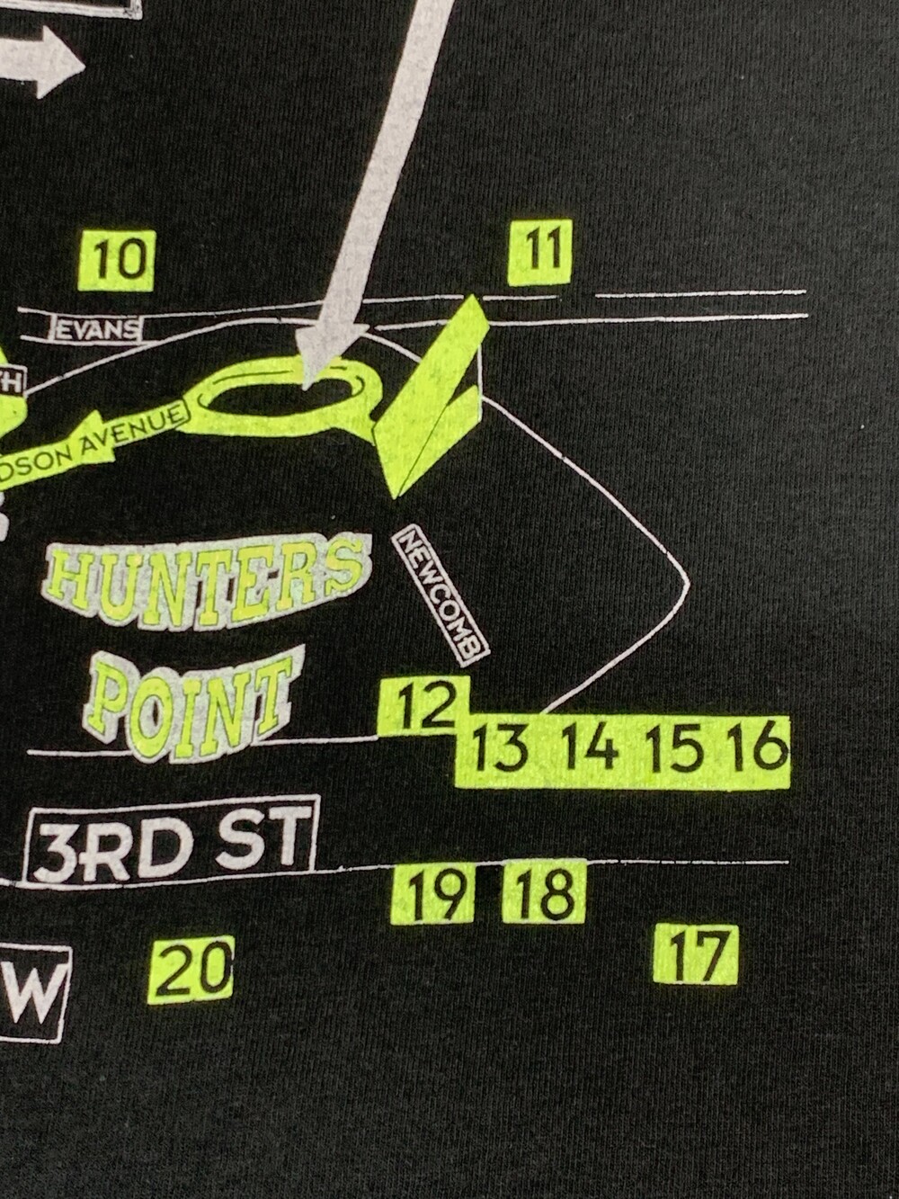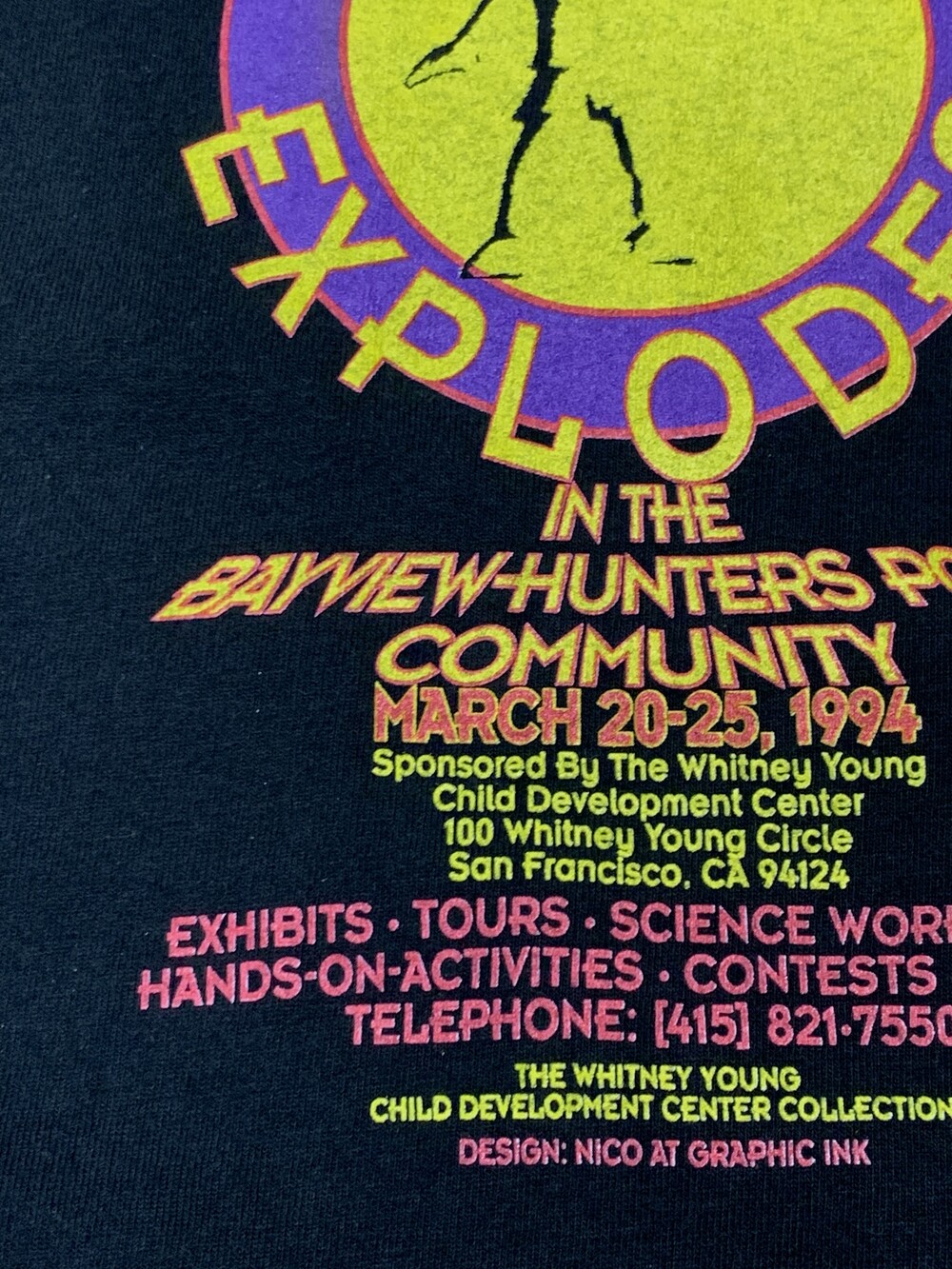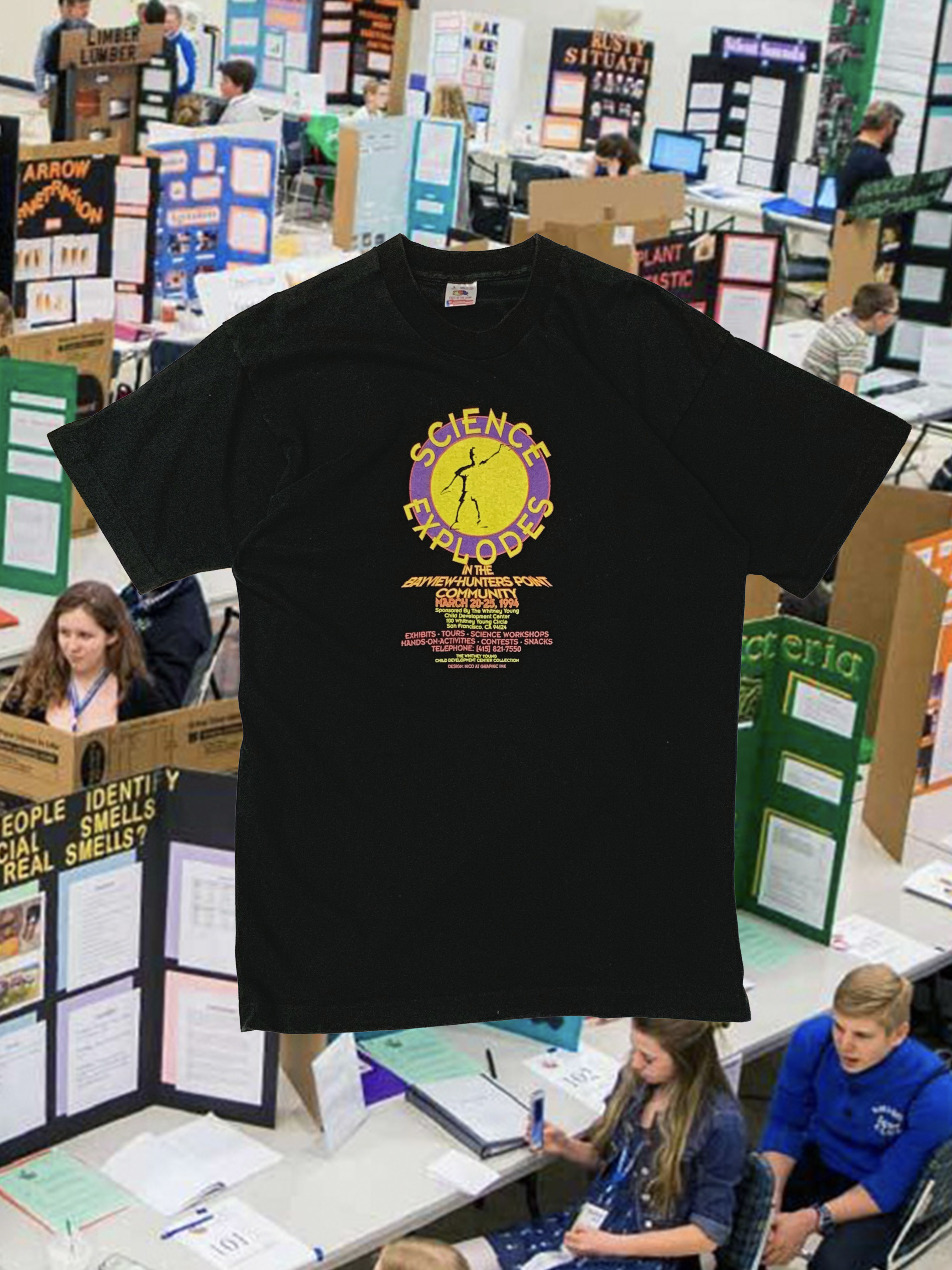 1994년 3월에 열린 과학 전시 행사 SCIENCE EXPLODES 행사에 대한 개요가 전면에, 부스 배치를 한 눈에 볼 수 있는 행사장 약도가 뒷면에 배치된 프로모션 프린팅이 올려진 티셔츠. 너디하고 긱한 느낌이 돋보이는 제품입니다.