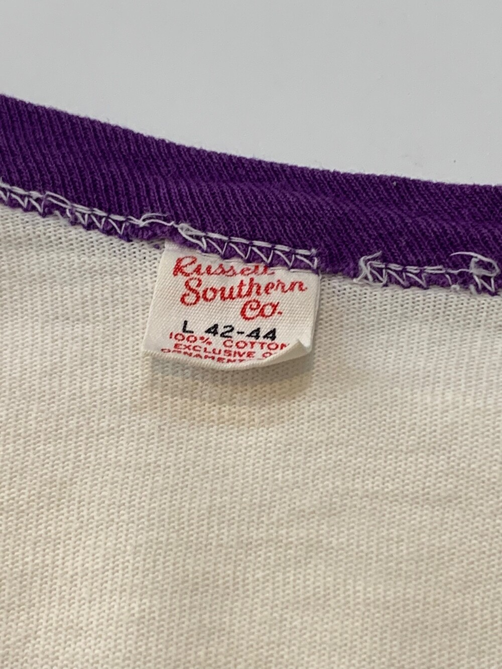 🚩Detail 러셀 애슬레틱 이전, 기존의 러셀 매뉴팩터링 컴퍼니가 제조업체인 서던 매뉴팩터링 컴퍼니를 인수하며 두 회사의 이름을 따 러셀 사우던 컴퍼니(Russell Southern Company)라는 이름으로 미국 전역에 스포츠웨어를 납품하는 브랜드를 운영하던 시절에 생산된 티셔츠입니다.