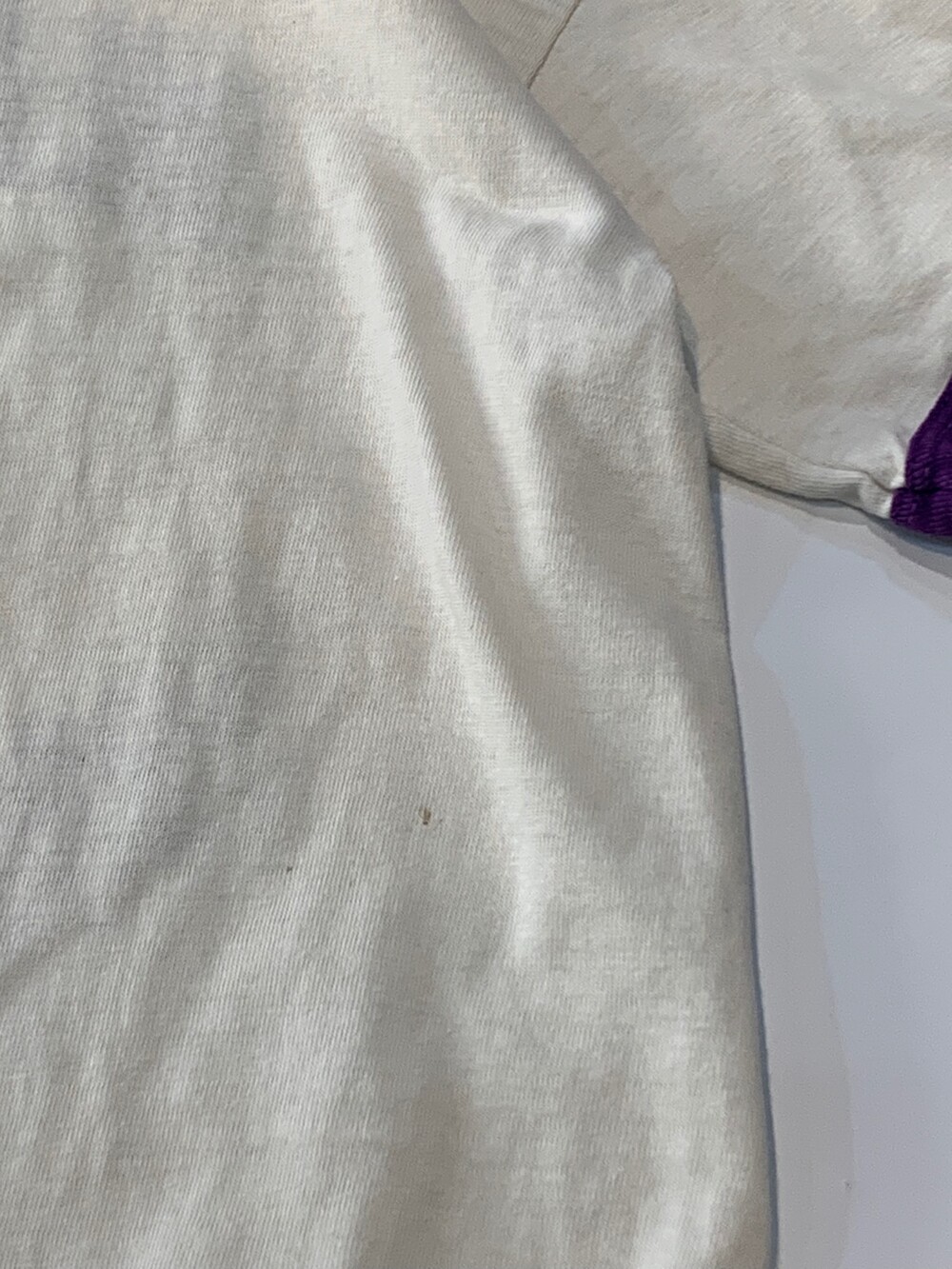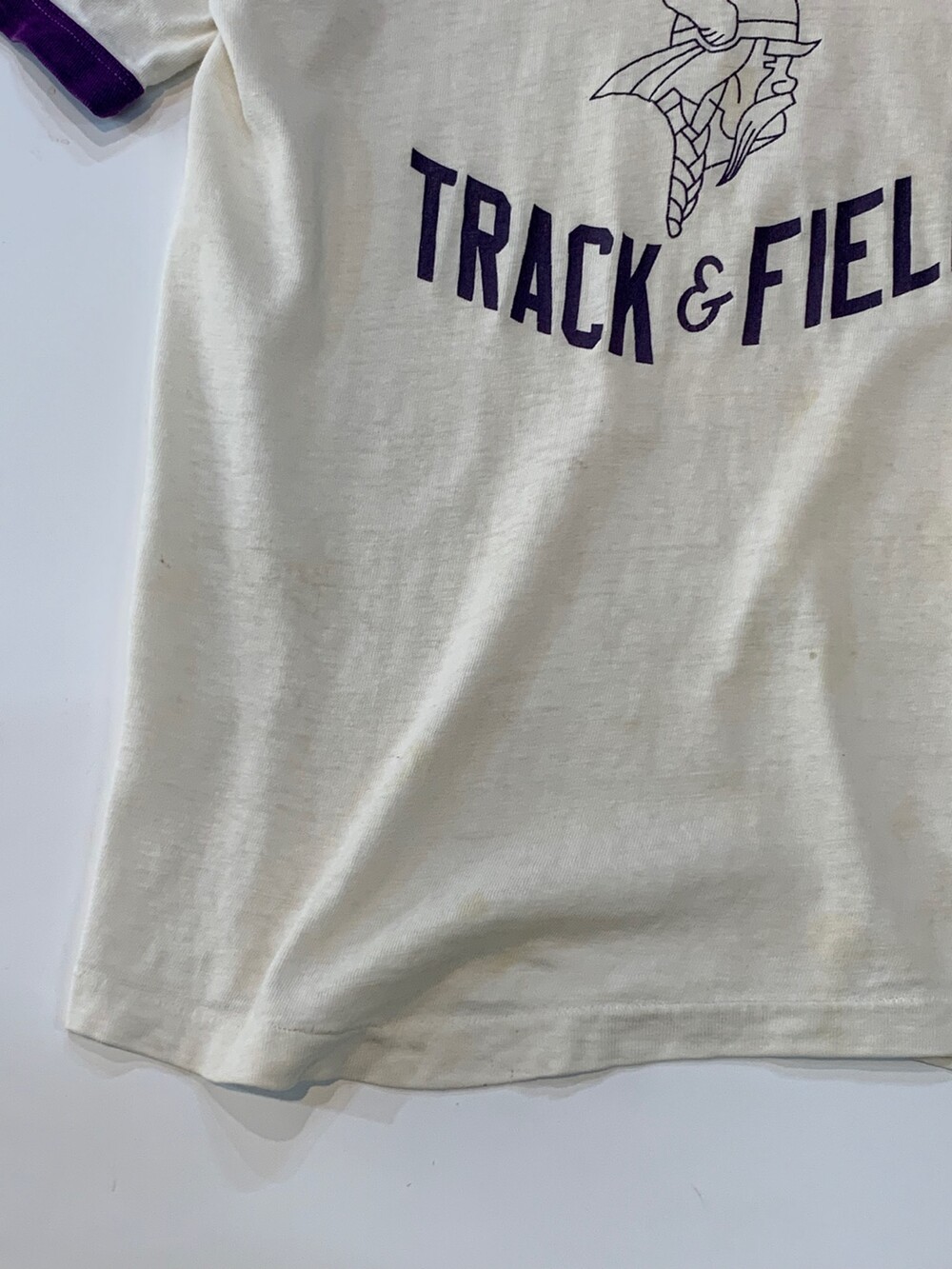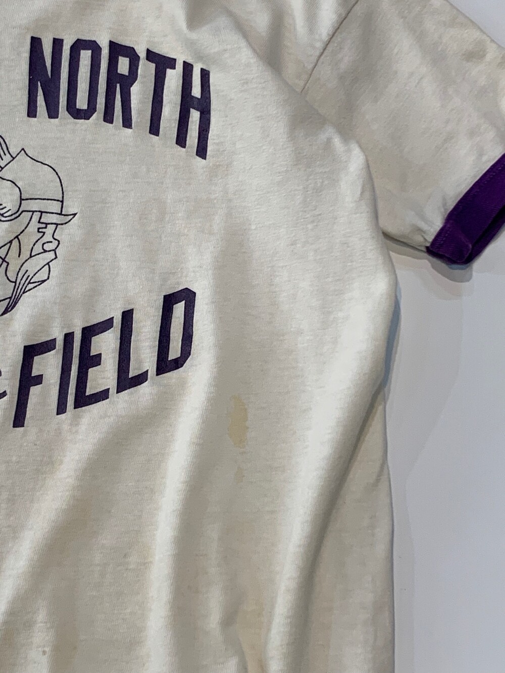 코튼 소재의 링거 티셔츠로, 전면에는 NILES NORTH 고등학교 바시티 팀 VIKINGS 트랙 앤 필드 프린팅이 올려져 있습니다. 바시티 팀 메인 컬러에 걸맞게 프린팅과 립 모두 퍼플 컬러를 띠는 제품으로, 여성분들이 약간은 루즈하게 착용하거나 남성분들이 몸에 딱 맞게 핏하게 착용하기를 권장드립니다.