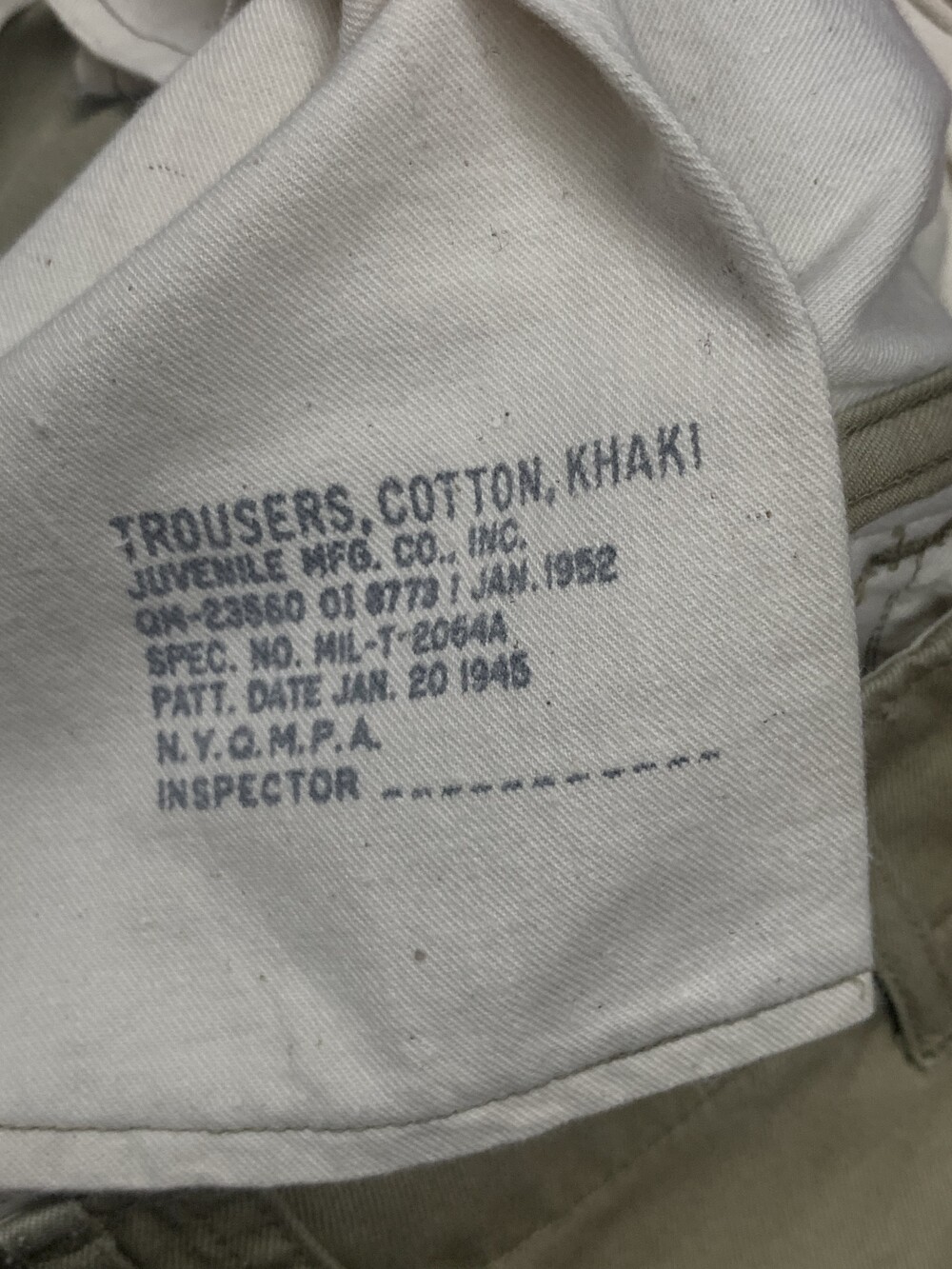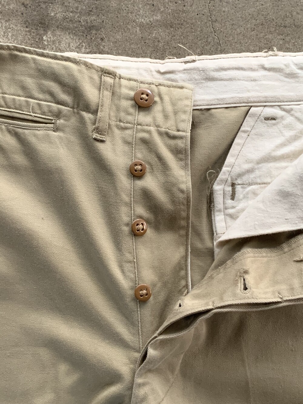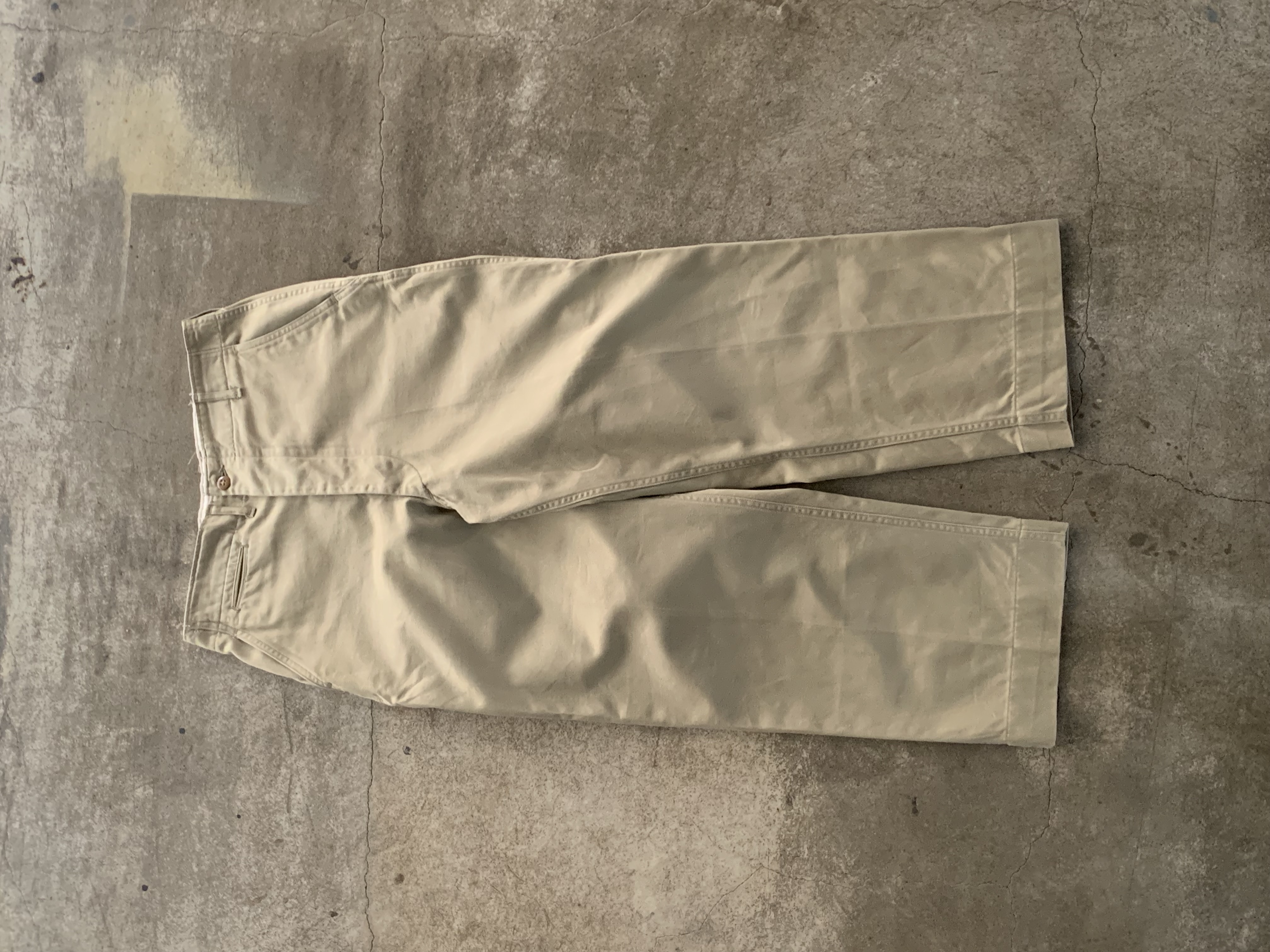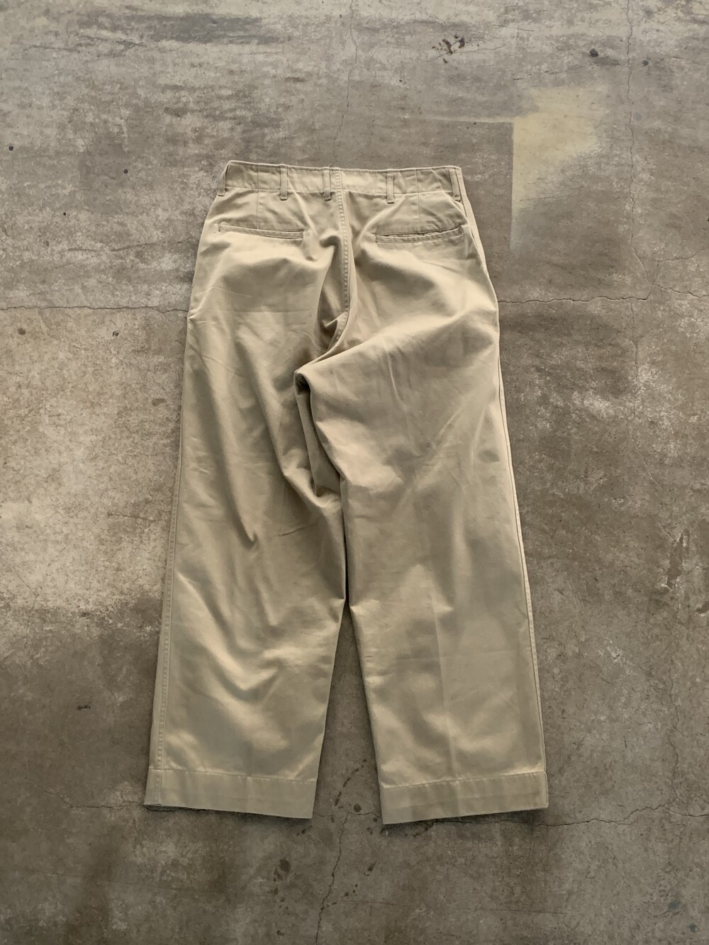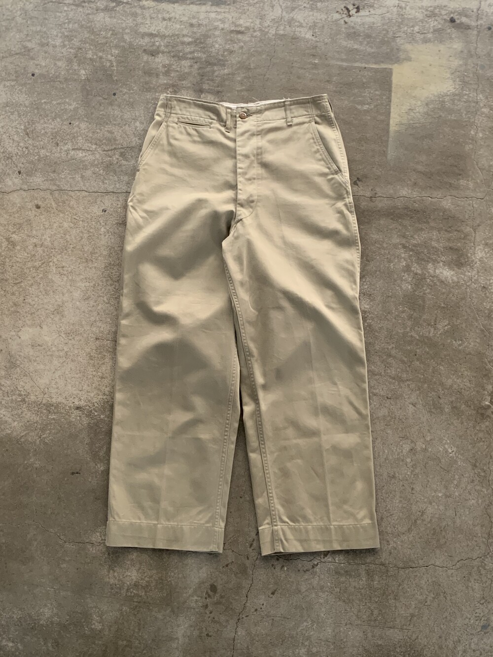 미군 장교에게 지급되어 오피서 치노(Officer Chino) 팬츠로도 불리우는 카키 컬러 코튼 트윌 트라우저입니다. 1952년도 생산 제품이나 1945년도 패턴 특유의 측면 더블스티치 마감, 버튼이 생략된 뒷면 포켓, 와이드한 스트레이트 실루엣 등의 디테일을 갖춘 제품입니다.