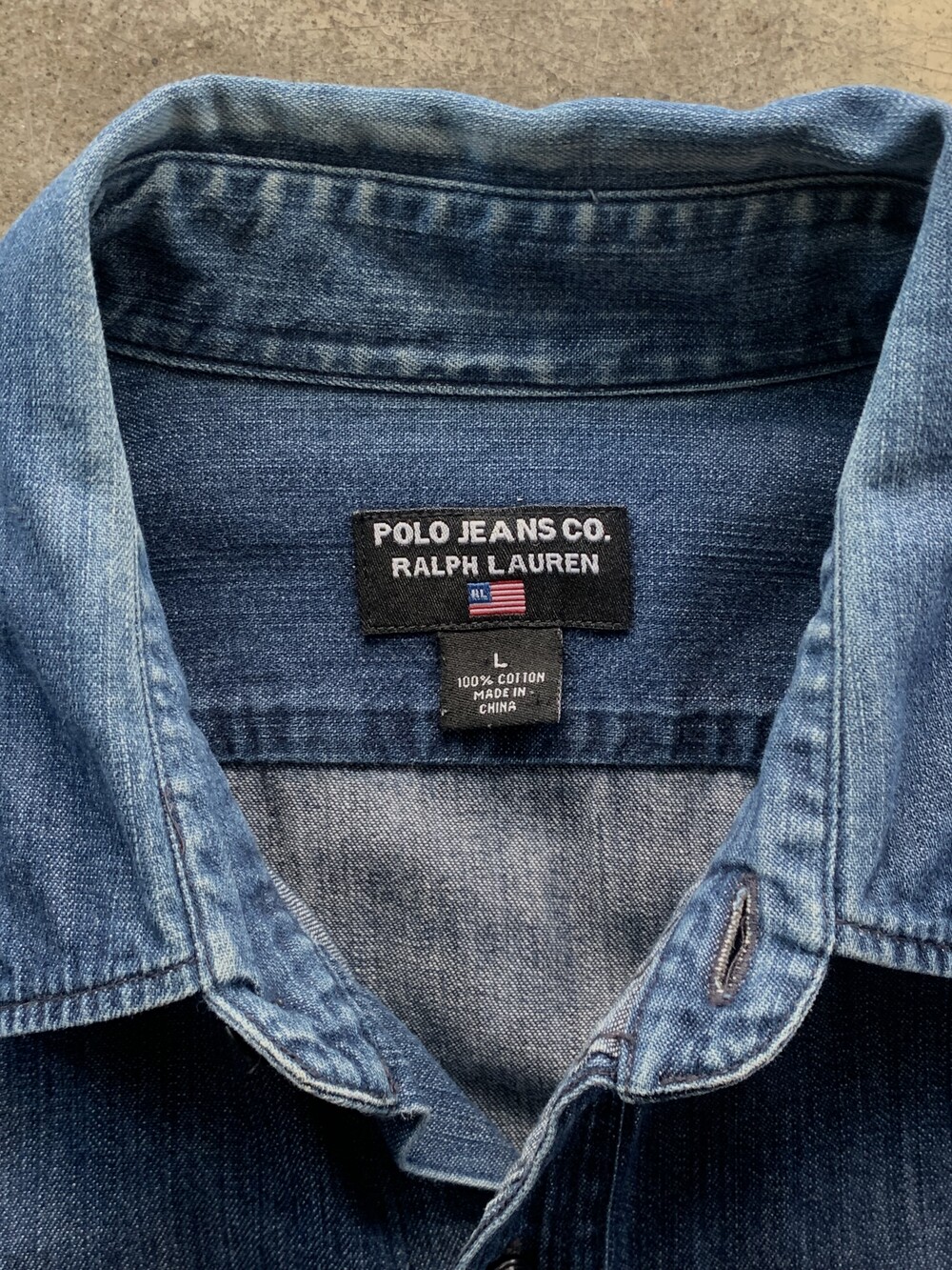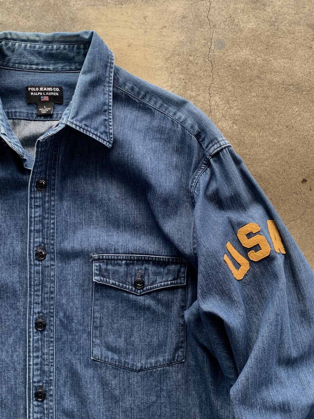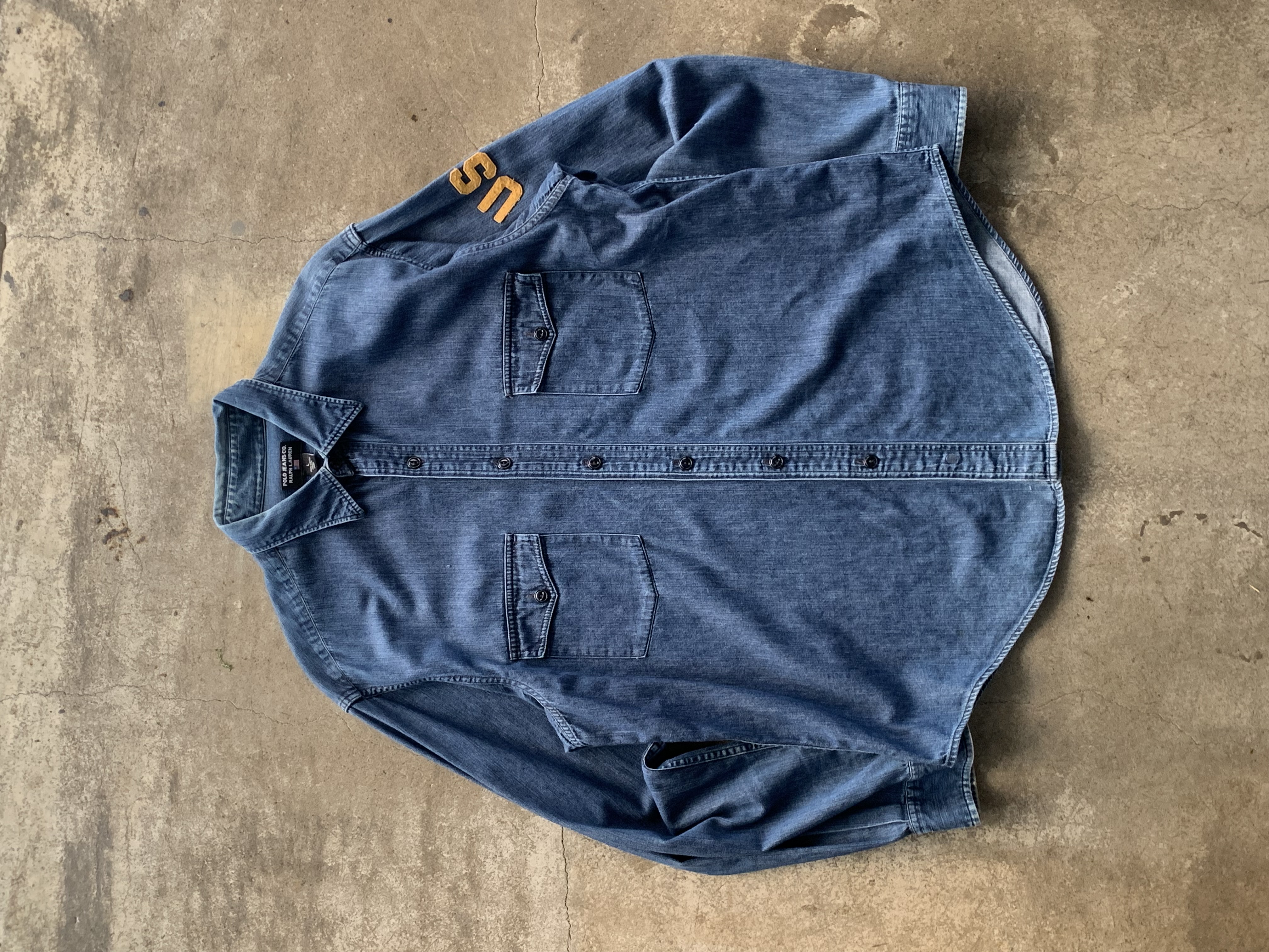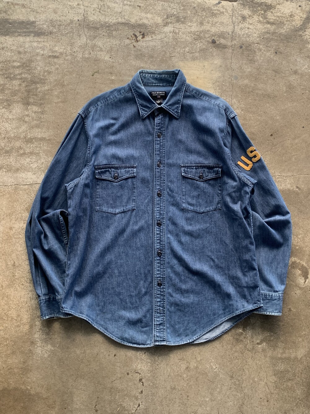 대칭형 포켓과 캣츠아이 버튼, 그리고 소매에 USA 펠트 아플리케가 붙는 랄프로렌 산하 캐주얼 브랜드 폴로 진스(POLO JEANS CO.)의 데님 워크 셔츠. 짙은 인디고 컬러를 유지하고 있으며 범용성있는 사이즈로 턱인과 턱아웃 모두 활용할 수 있을만한 제품입니다.