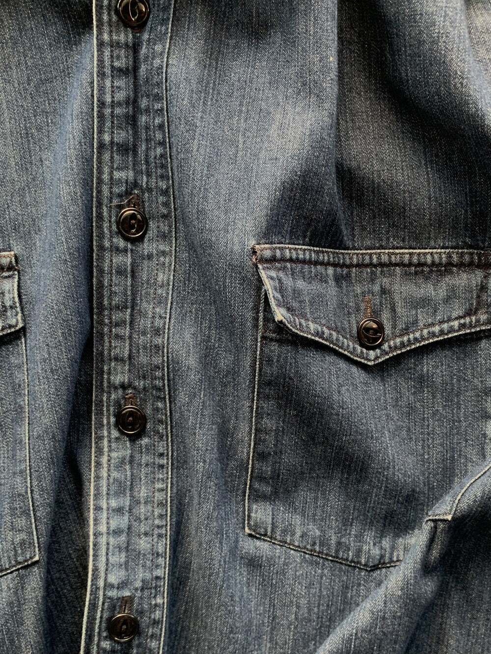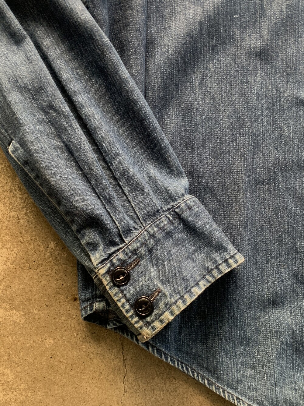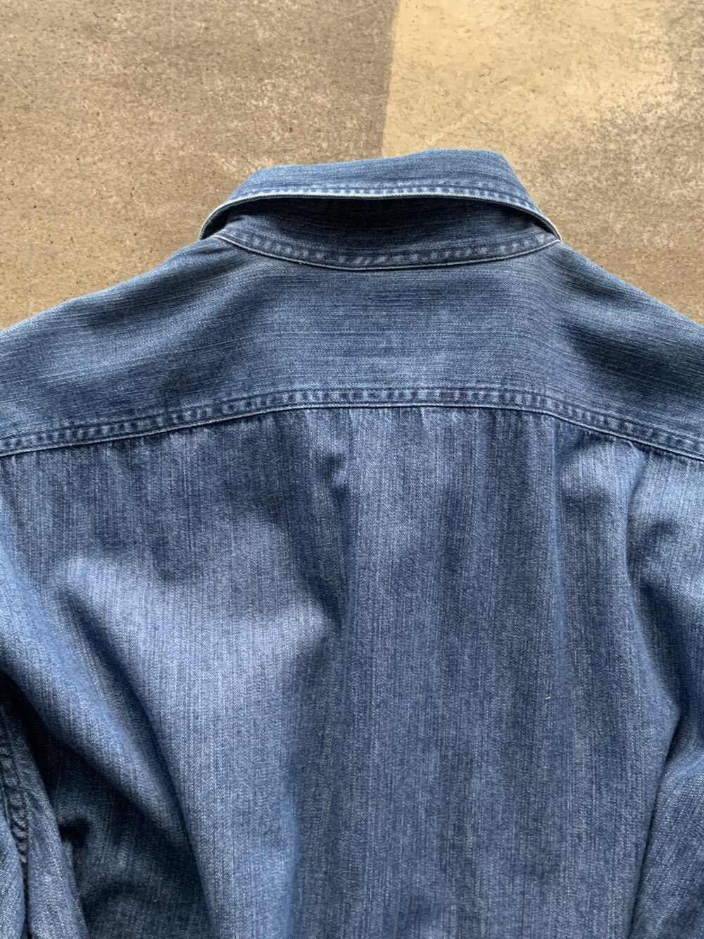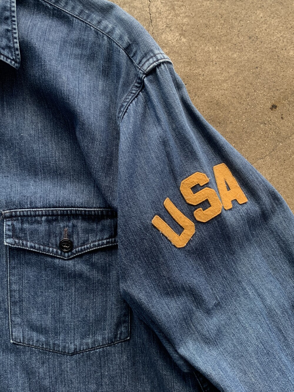대칭형 포켓과 캣츠아이 버튼, 그리고 소매에 USA 펠트 아플리케가 붙는 랄프로렌 산하 캐주얼 브랜드 폴로 진스(POLO JEANS CO.)의 데님 워크 셔츠. 짙은 인디고 컬러를 유지하고 있으며 범용성있는 사이즈로 턱인과 턱아웃 모두 활용할 수 있을만한 제품입니다.