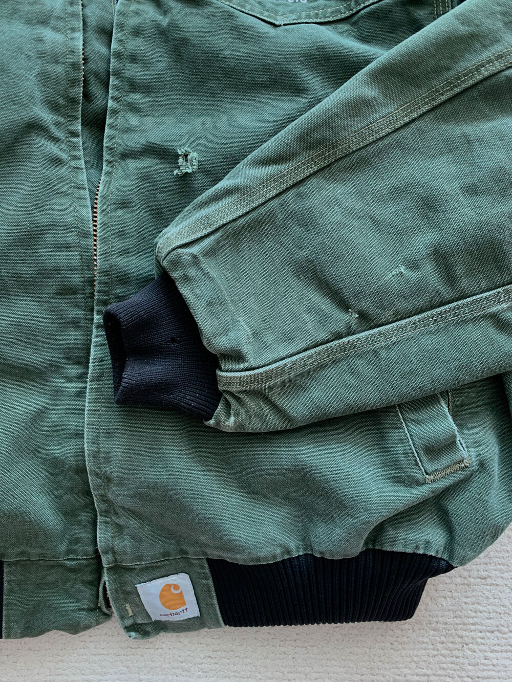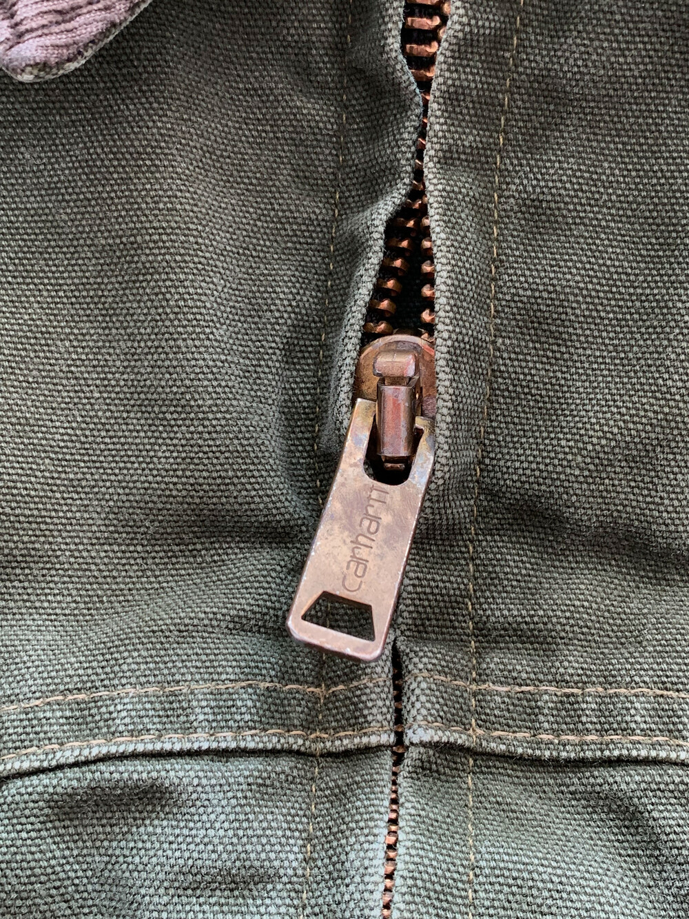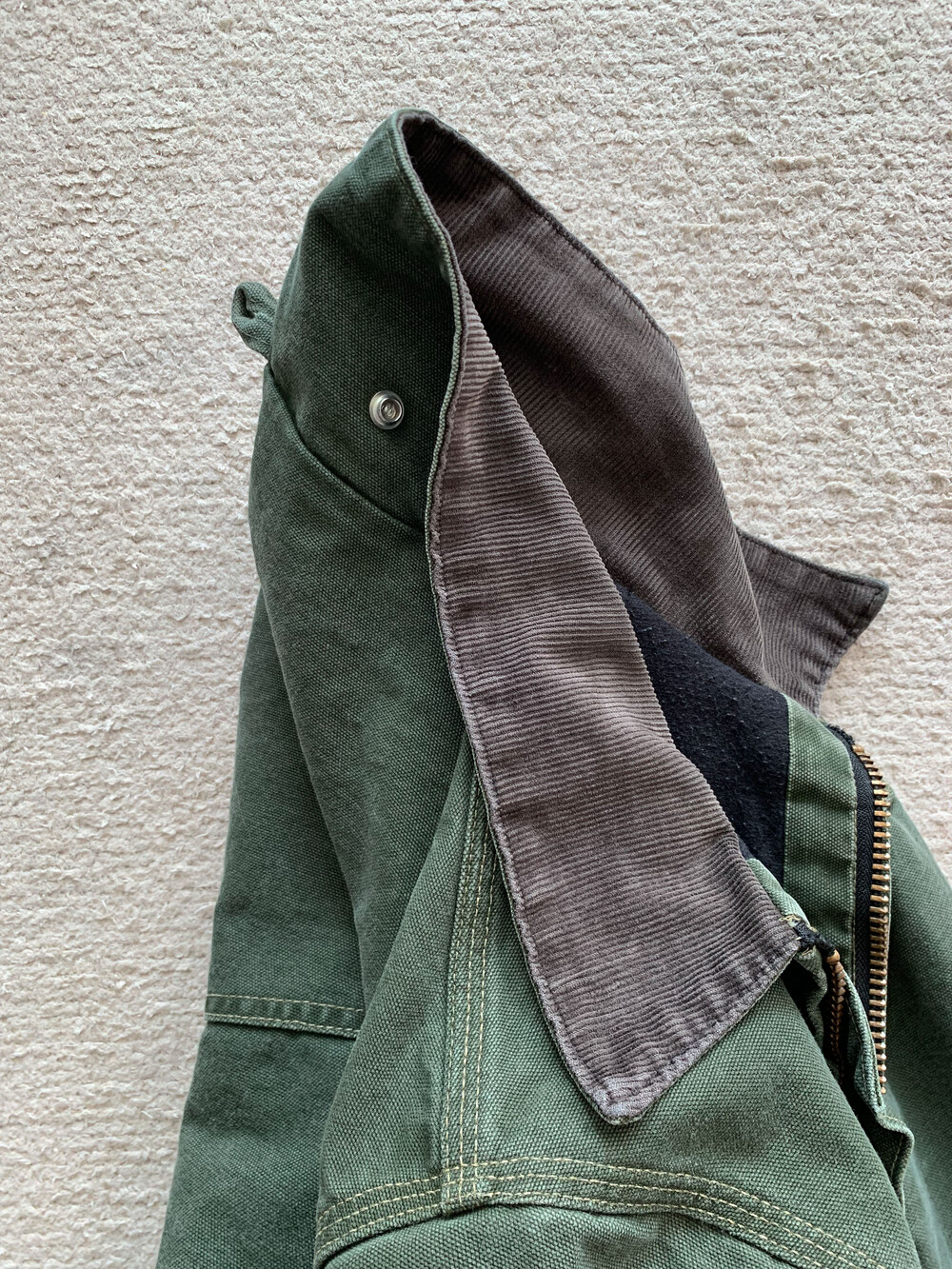 🚩Detail 칼하트 자켓류가 J 시리즈로 모델명이 통합되기 이전, JQ2104라는 모델명이 붙었던 짙은 그린 컬러의 산타페 자켓입니다. 산타페 자켓의 전신인 웨스턴 자켓이 1995년까지 소개되었기에 1995년 후반 혹은 1996년에 생산된 산타페 초기형 제품이라 할 수 있겠습니다.
