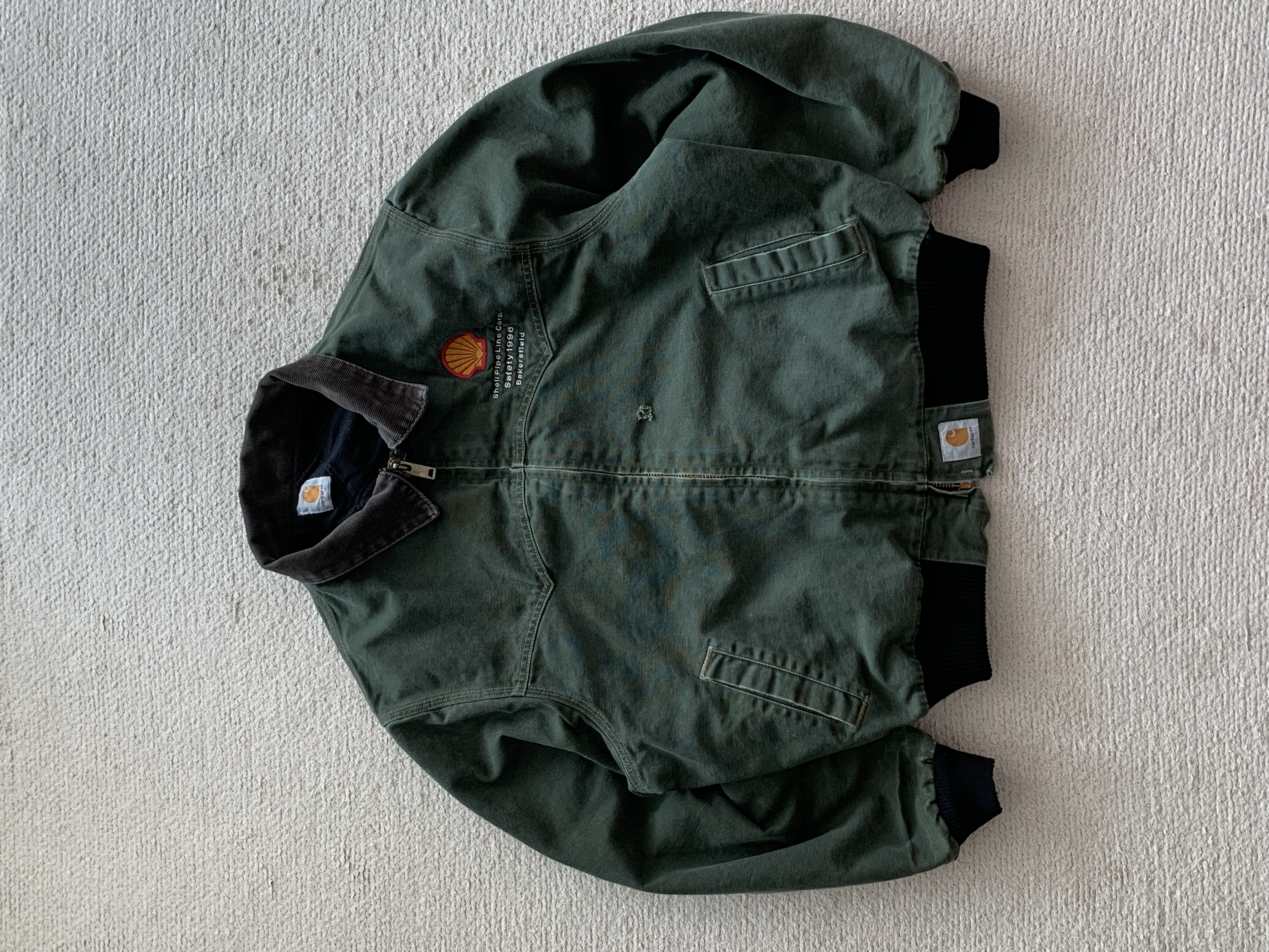 모스 그린에 비해 조금 더 짙은 녹색의 스프루스(Spruce) 컬러에 가까운 독특한 색상이 돋보이며, 퀼트 라이닝이 붙어 블랭킷 라이닝이 붙은 제품에 비해 가볍게 착용할 수 있으며 미국 캘리포니아 주 베이커스필드에 위치한 정유회사 쉘(Shell) 파이프라인 안전부서 자수가 올려져 워크웨어로서 당위성을 부여하는 디테일도 돋보입니다. 택이 유실되어 표기는 없으니 실측상 105-110호 사이로 착용하는 분들에게 권장드립니다.
