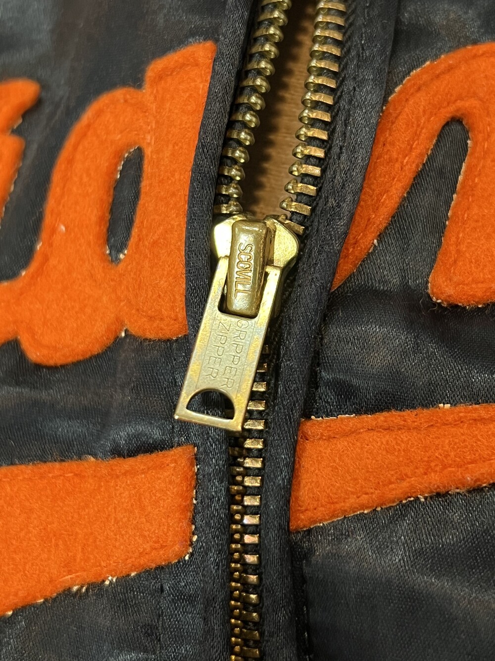 🚩Detail 1950년대에서 1970년대 초반까지 생산된 스코빌 그리퍼 지퍼(SCOVILL GRIPPER ZIPPER)가 적용되었으며 자연스러운 사용감의 원단과 소매 립, 그리고 얇은 플리스 라이닝 등의 구성요소를 고려했을 때 1960-70년대에 생산된 것으로 추정되는 팀 자켓. MLB 내셔널리그 서부지구 소속 샌프란시스코 자이언츠의 배색과 가운데 자이언츠 패치가 붙은 제품.