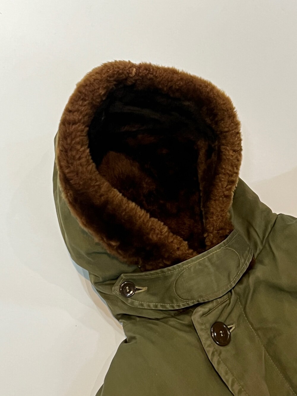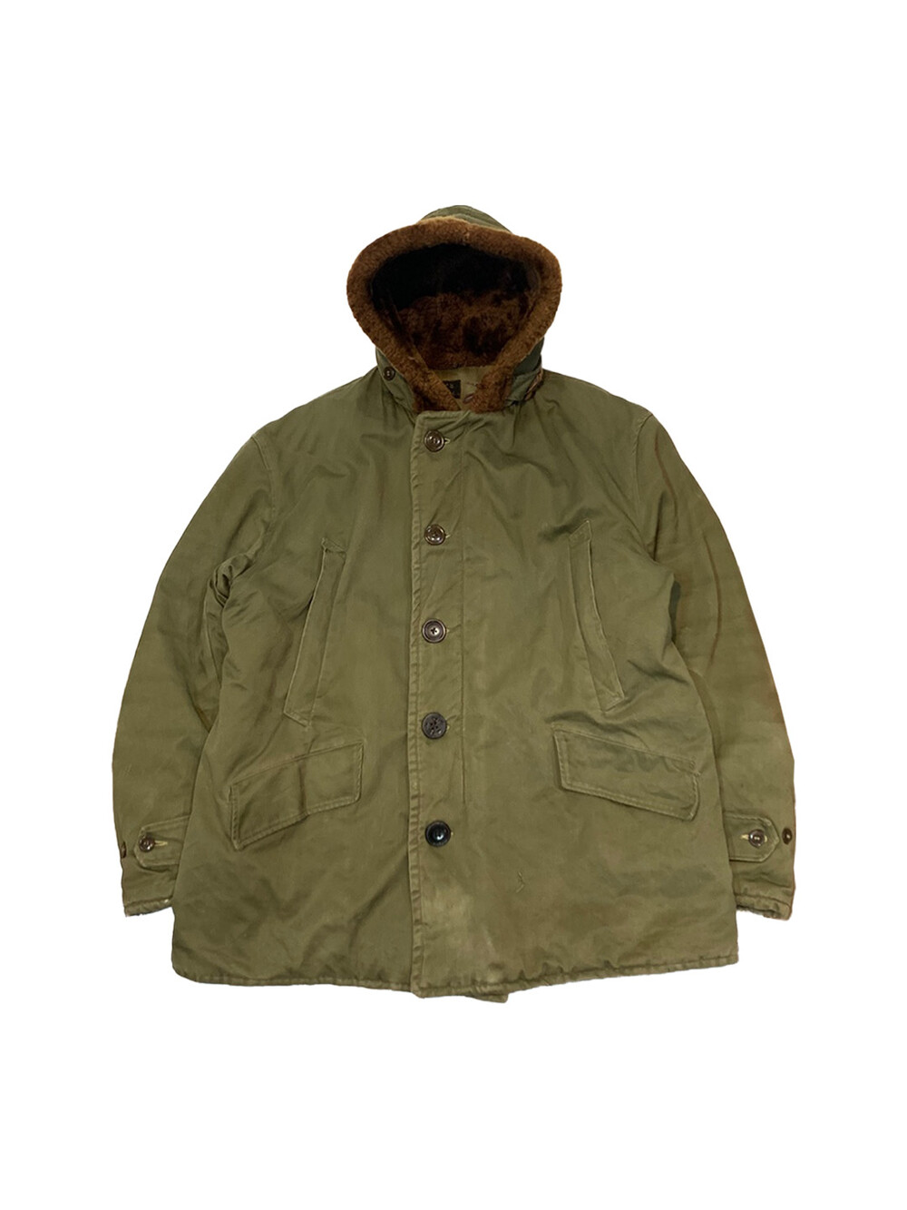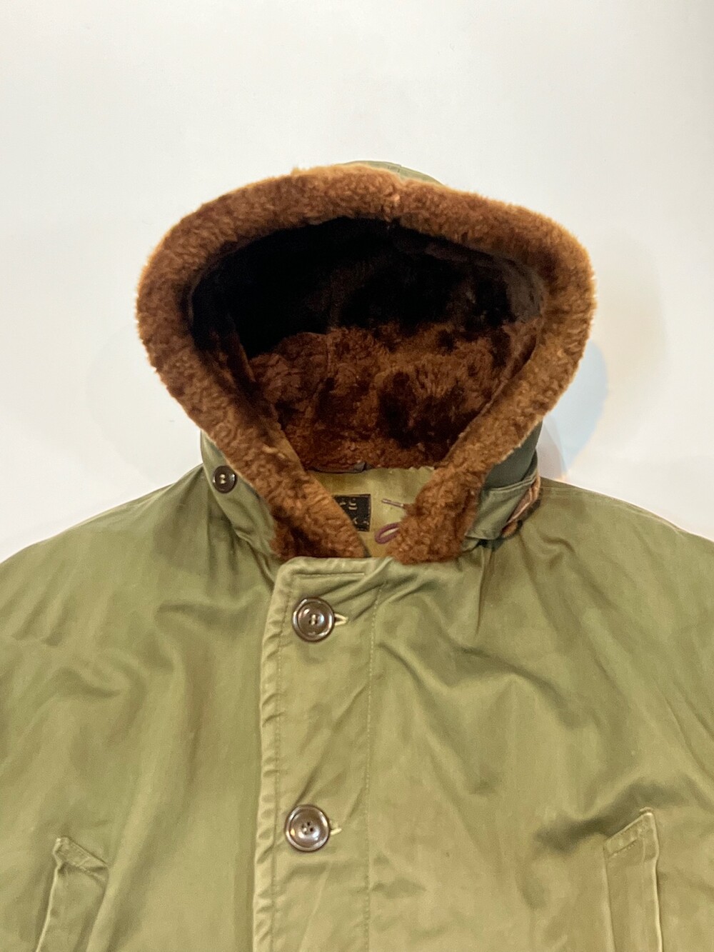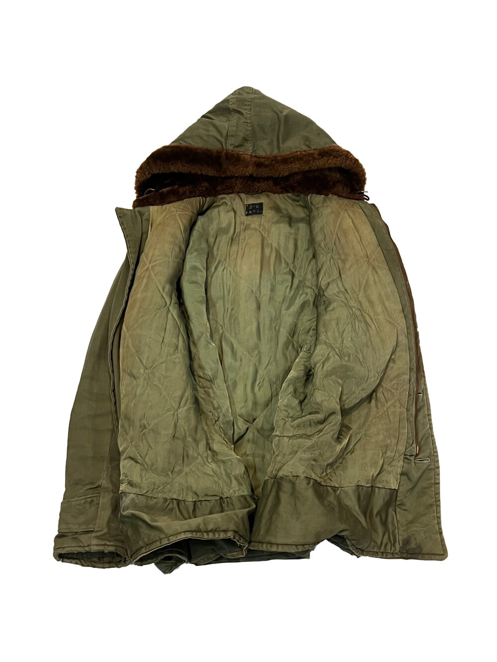 🚩Detail 1940-50년대 사이 민간업체 생산으로 추정되는 B-9 파카입니다. 미 공군 파일럿이 높은 고도에서 비행하는 동안 보온성을 확보하고자 후드에는 양가죽 무통 라이닝과 친스트랩, 몸판에는 퀼트 라이닝이 들어가는 사양의 제품입니다. 충전재 상태가 온전치 못함에도 일상 생활에서도 부족함 없을 보온성을 보장할만한 제품입니다.