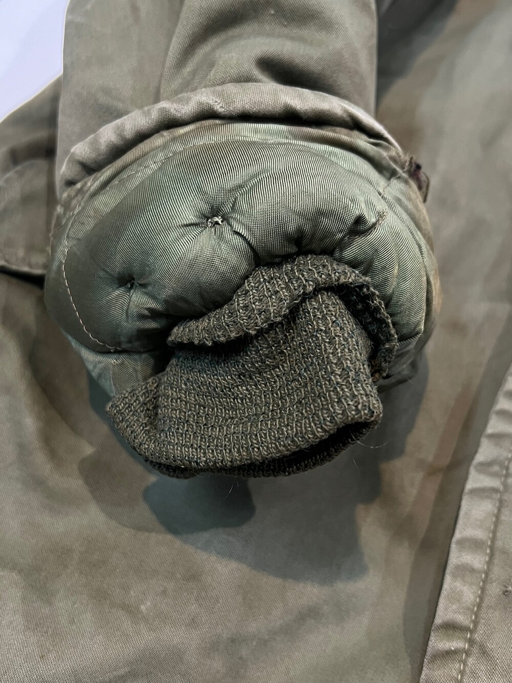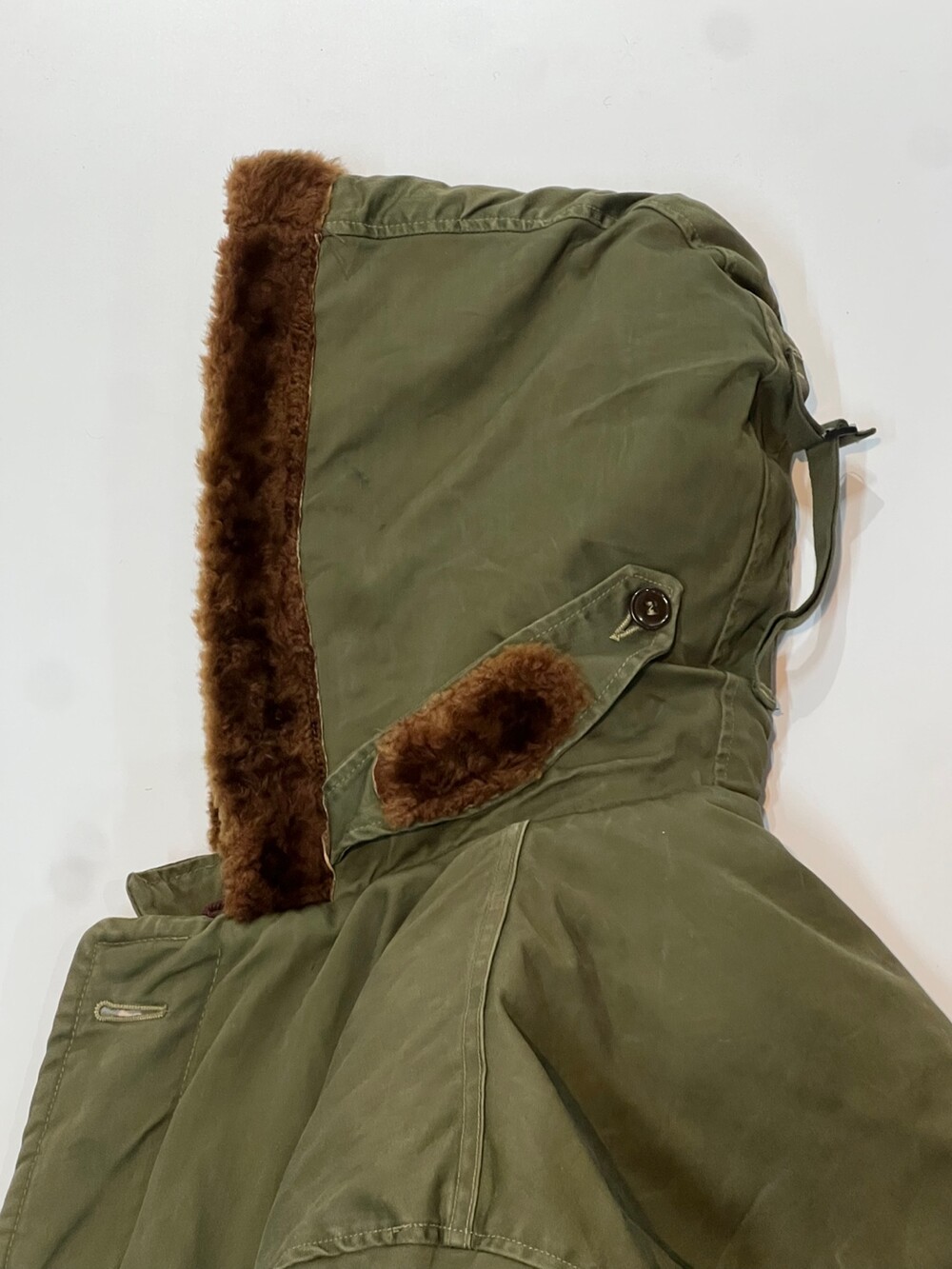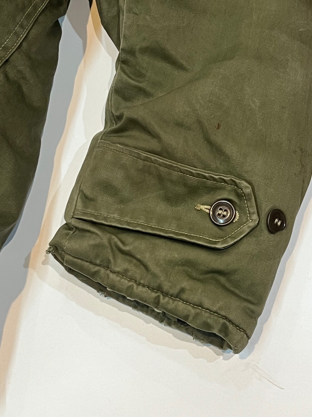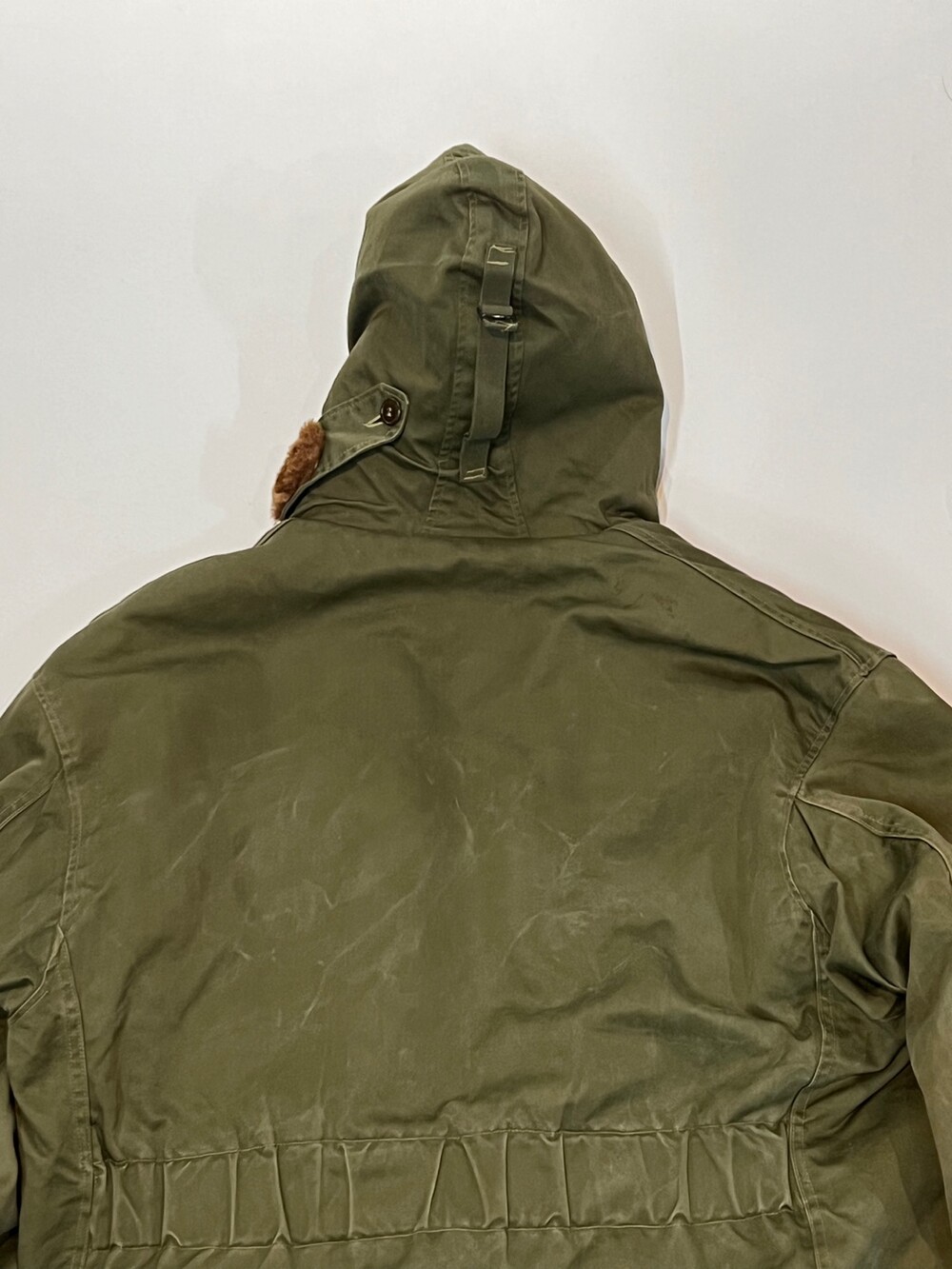 🚩Detail 1940-50년대 사이 민간업체 생산으로 추정되는 B-9 파카입니다. 미 공군 파일럿이 높은 고도에서 비행하는 동안 보온성을 확보하고자 후드에는 양가죽 무통 라이닝과 친스트랩, 몸판에는 퀼트 라이닝이 들어가는 사양의 제품입니다. 충전재 상태가 온전치 못함에도 일상 생활에서도 부족함 없을 보온성을 보장할만한 제품입니다.