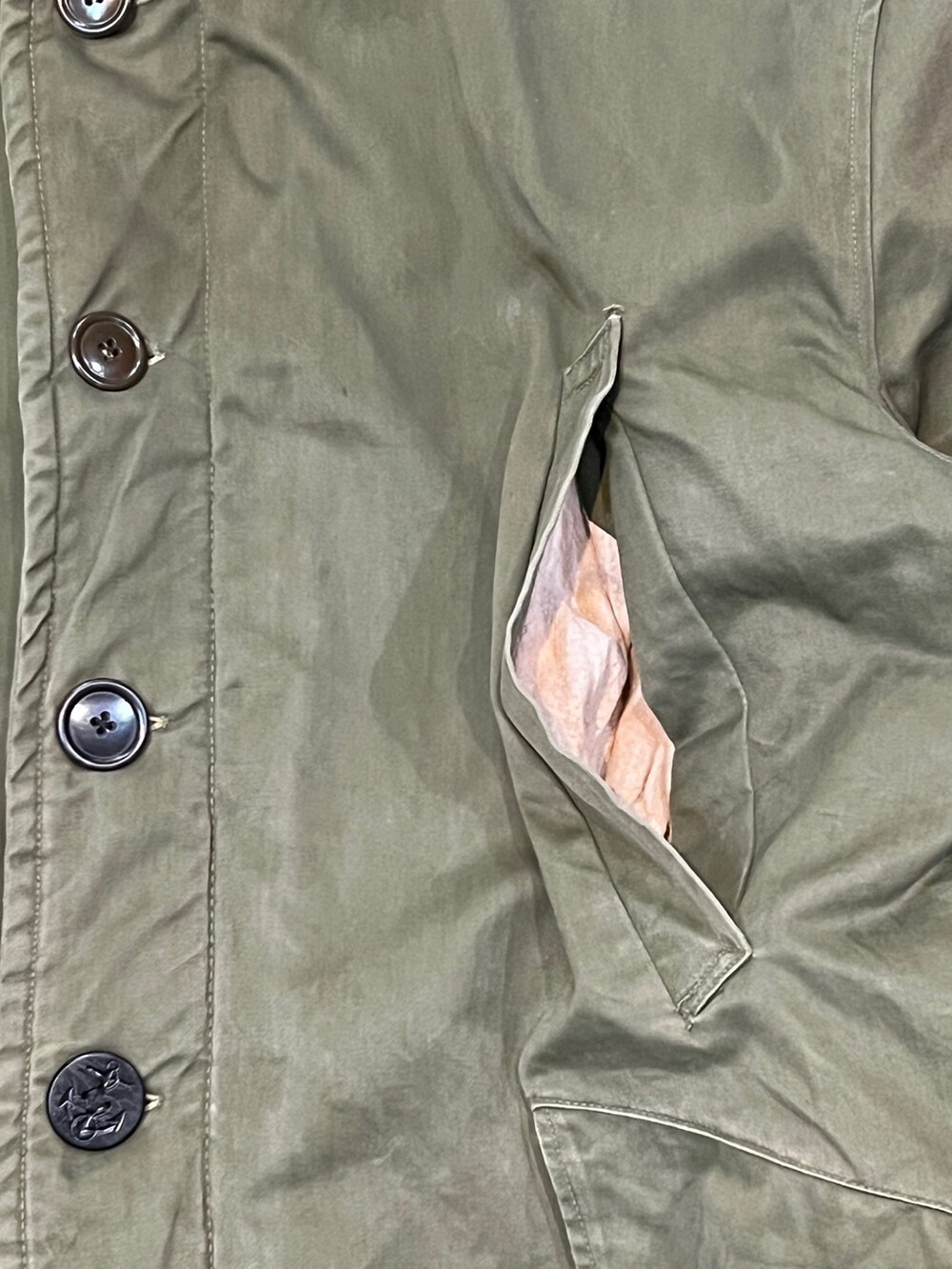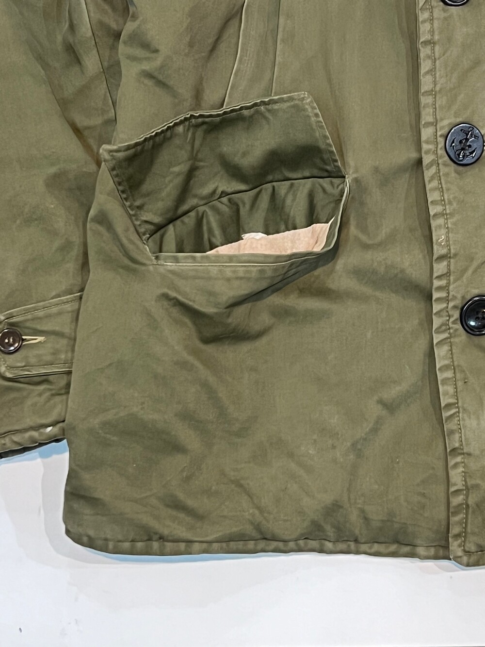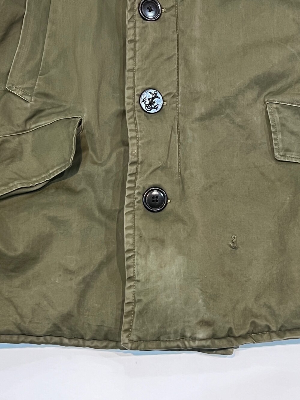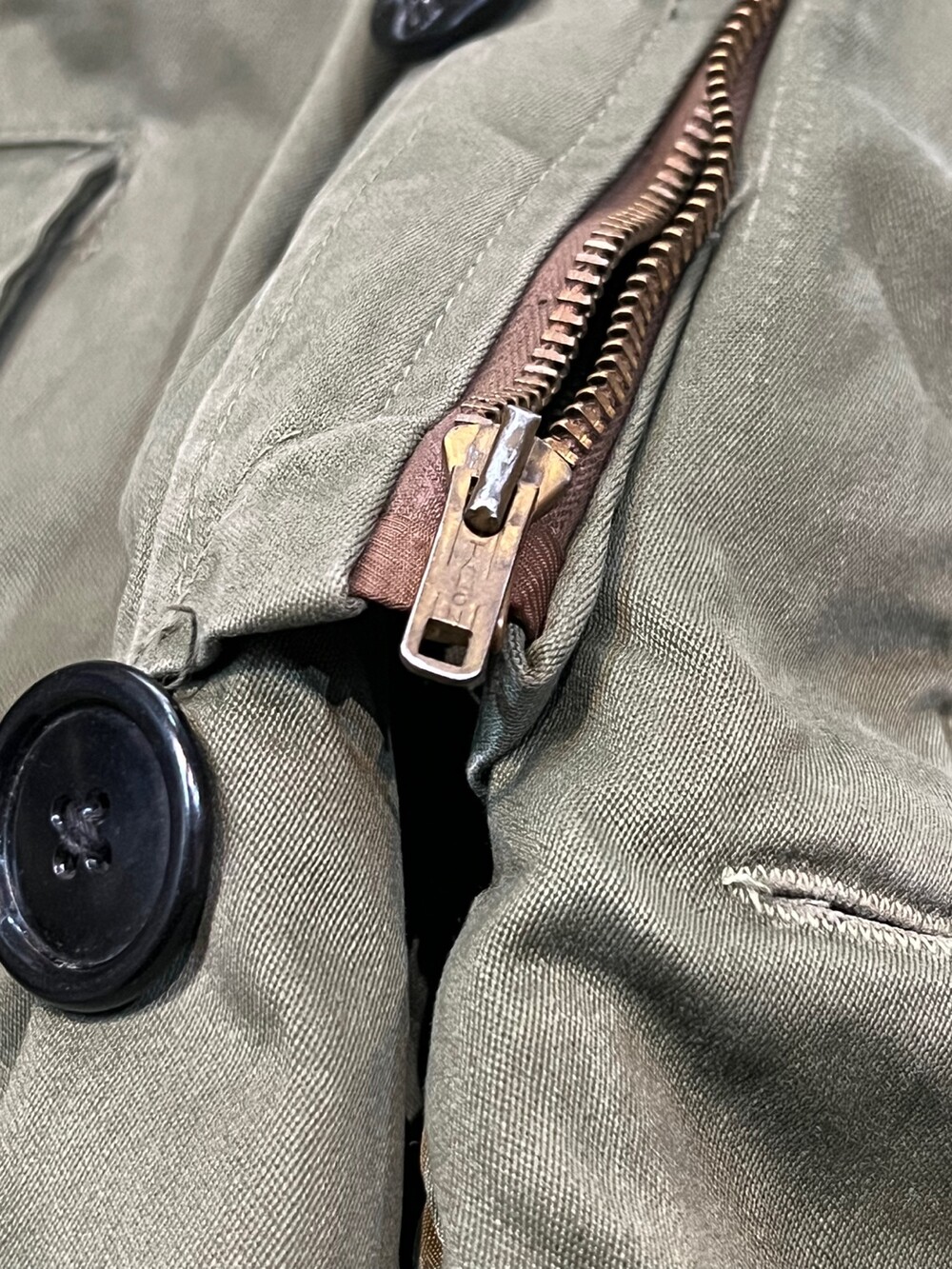 🚩Detail 1940-50년대 사이 민간업체 생산으로 추정되는 B-9 파카입니다. 미 공군 파일럿이 높은 고도에서 비행하는 동안 보온성을 확보하고자 후드에는 양가죽 무통 라이닝과 친스트랩, 몸판에는 퀼트 라이닝이 들어가는 사양의 제품입니다. 충전재 상태가 온전치 못함에도 일상 생활에서도 부족함 없을 보온성을 보장할만한 제품입니다.