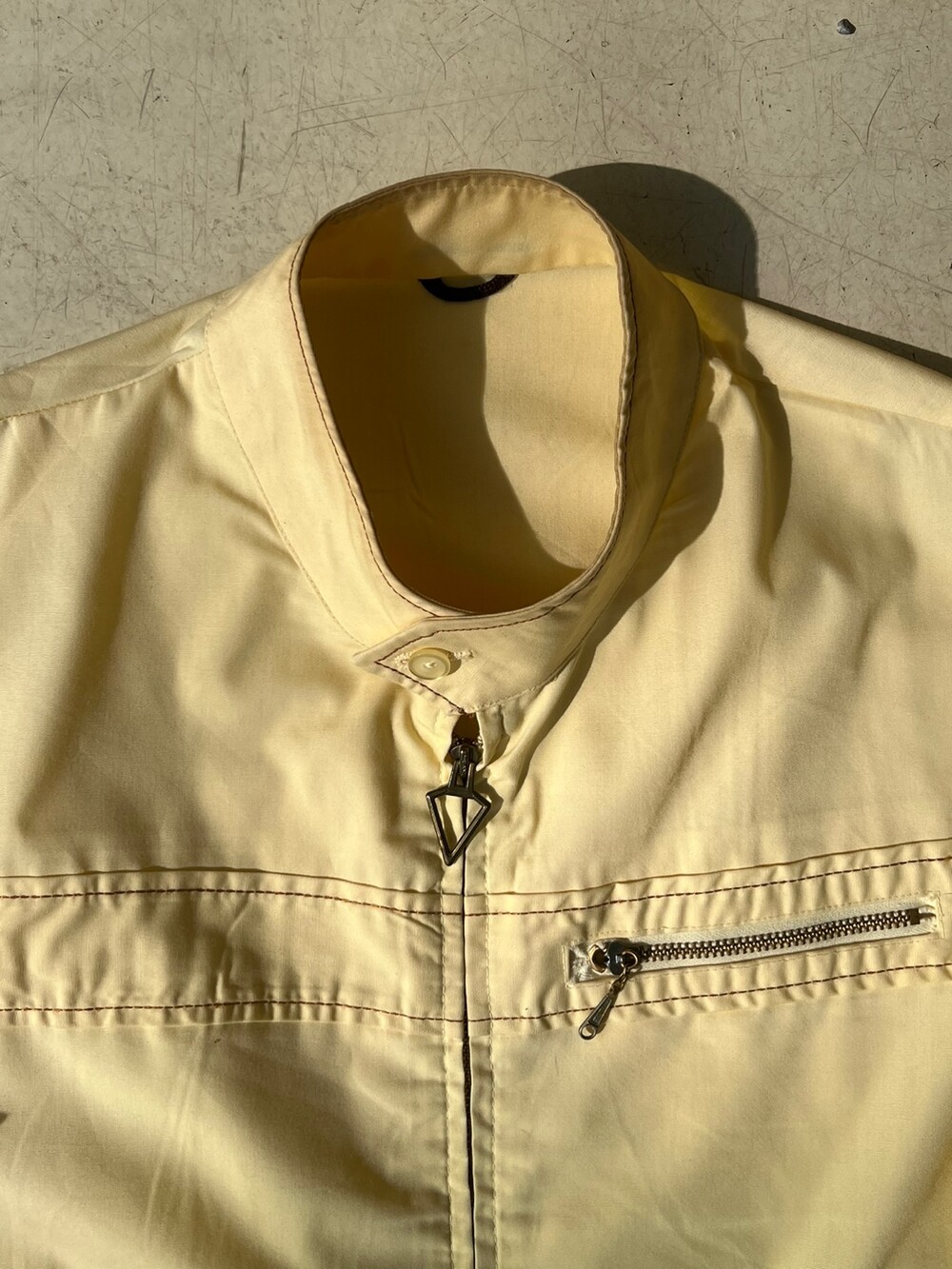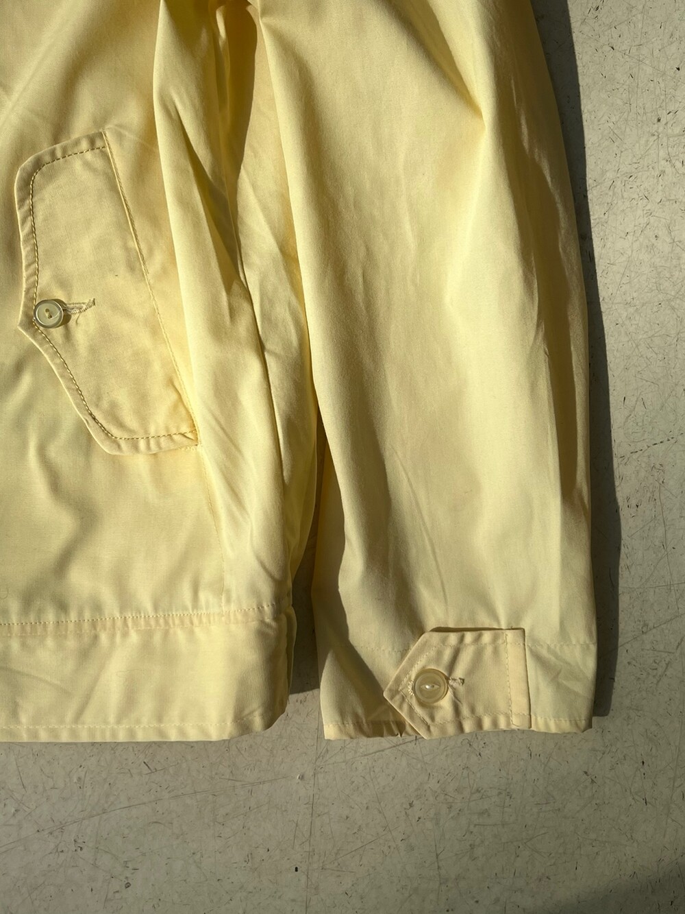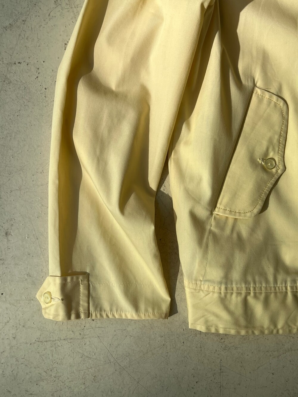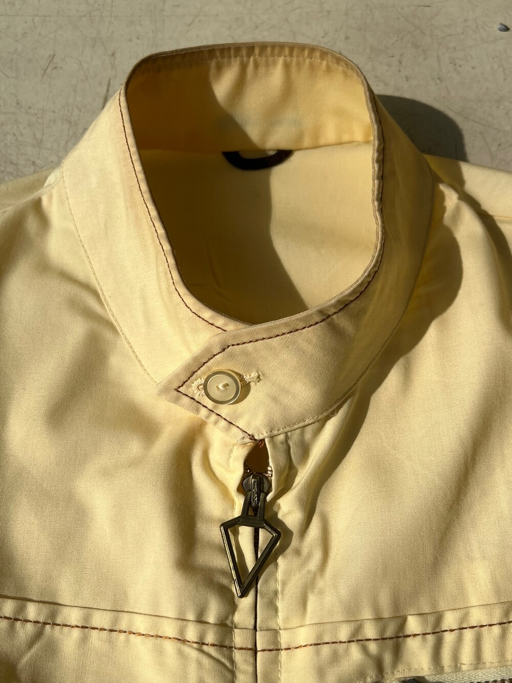 흔치 않은 역삼각형 그립의 탈론 지퍼, 그리고 수선 흔적이 없음에도 손목 스트랩이 둘 다 왼쪽 방향으로 되어있는 독특한 디테일이 매력적인 VAN HEUSEN의 나일론 스윙 자켓입니다. 밑단에는 양쪽에 밴딩이 있어 밑단은 살짝 조여지는듯한 실루엣에 소매는 스트랩이 널널해서 여유있는 제품입니다.