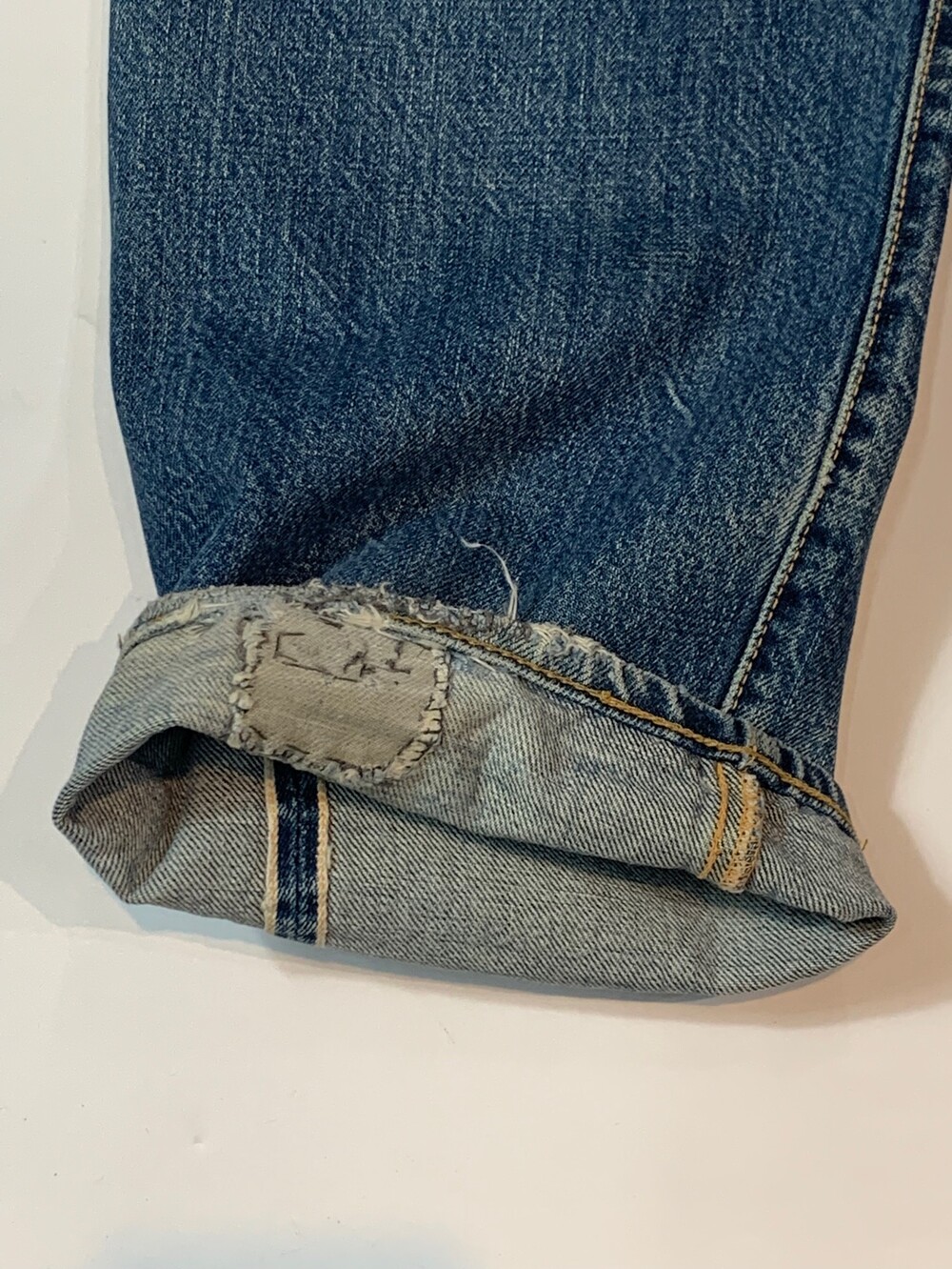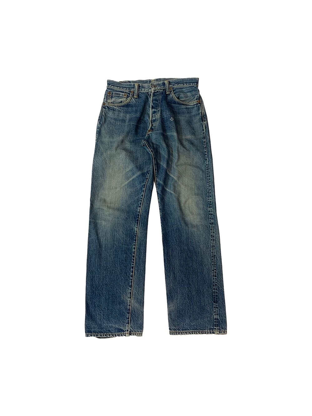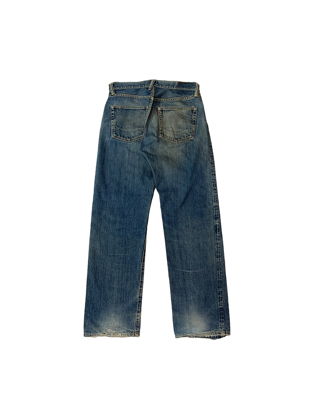 뒷면 패치가 떨어져 정확한 넘버링은 알 수 없으나 1950년대 생산된 히든버튼 사양 리바이스 501을 모티브로 삼은 에비수의 초창기 에비스(EVIS) 레드탭이 붙던 시절의 셀비지 데님팬츠. 빈티지 리바이스 데님팬츠를 연상케하는 페이딩과 질감이 돋보이는 제품입니다.