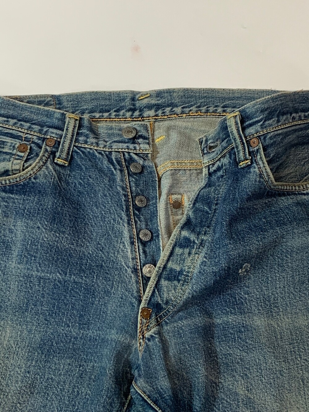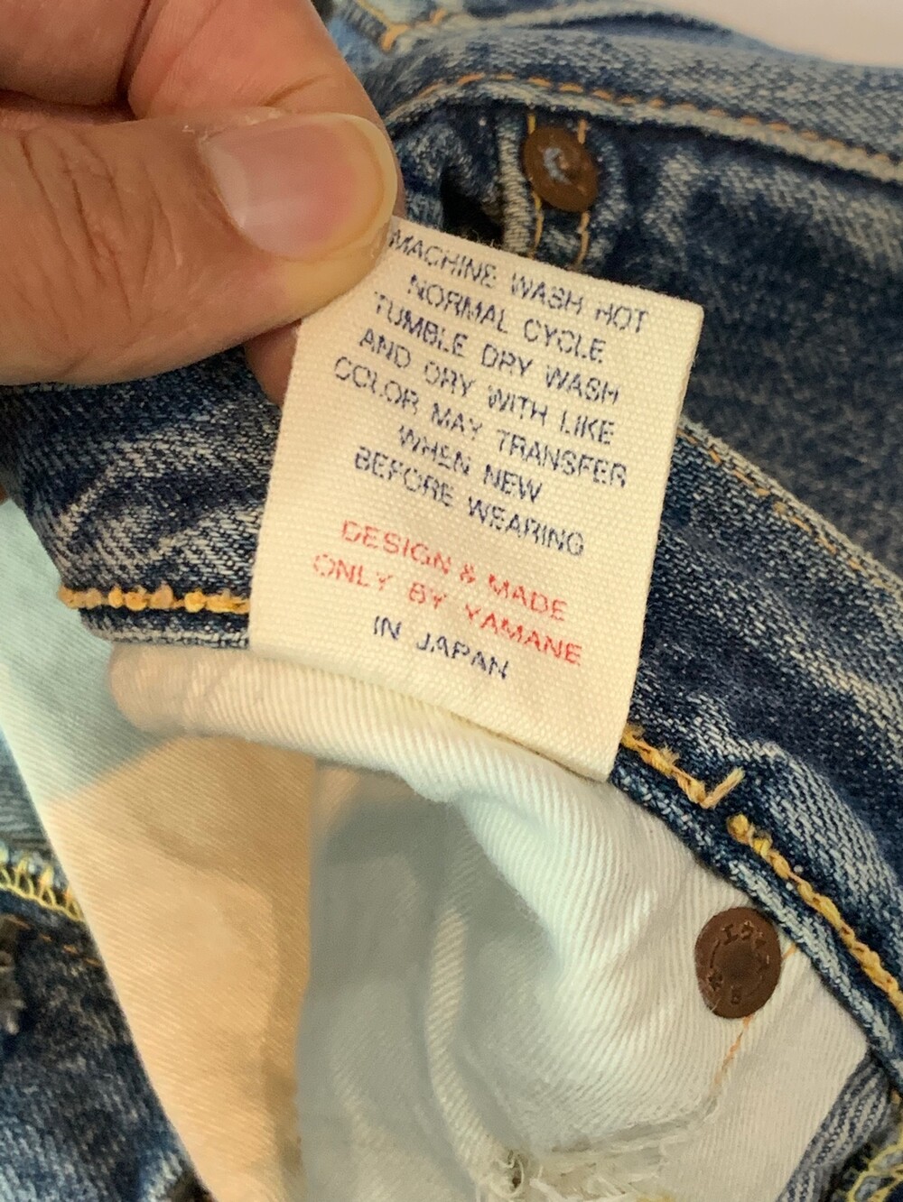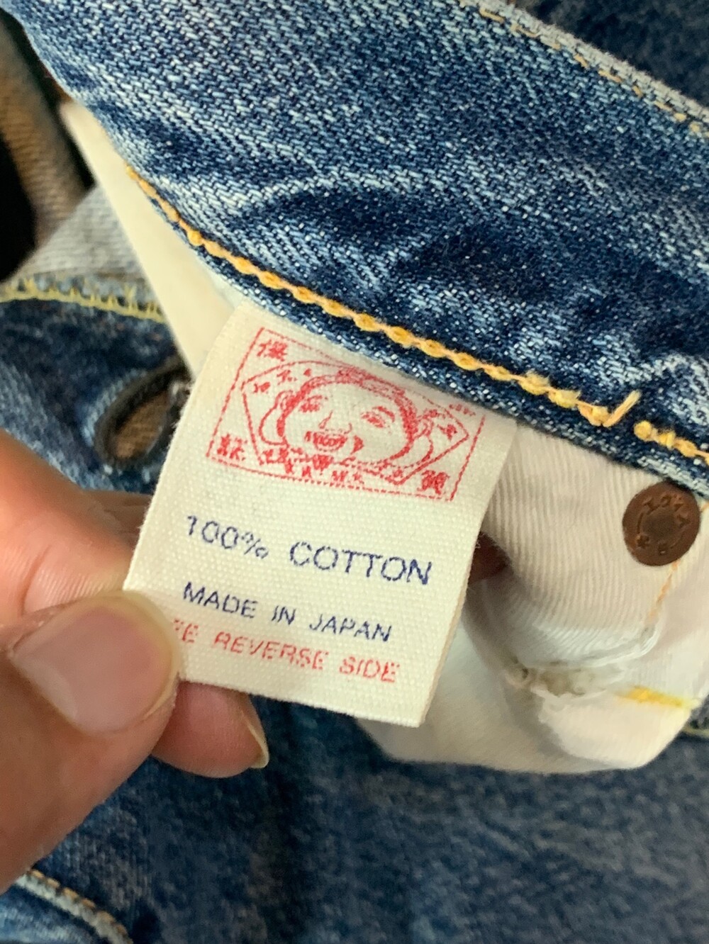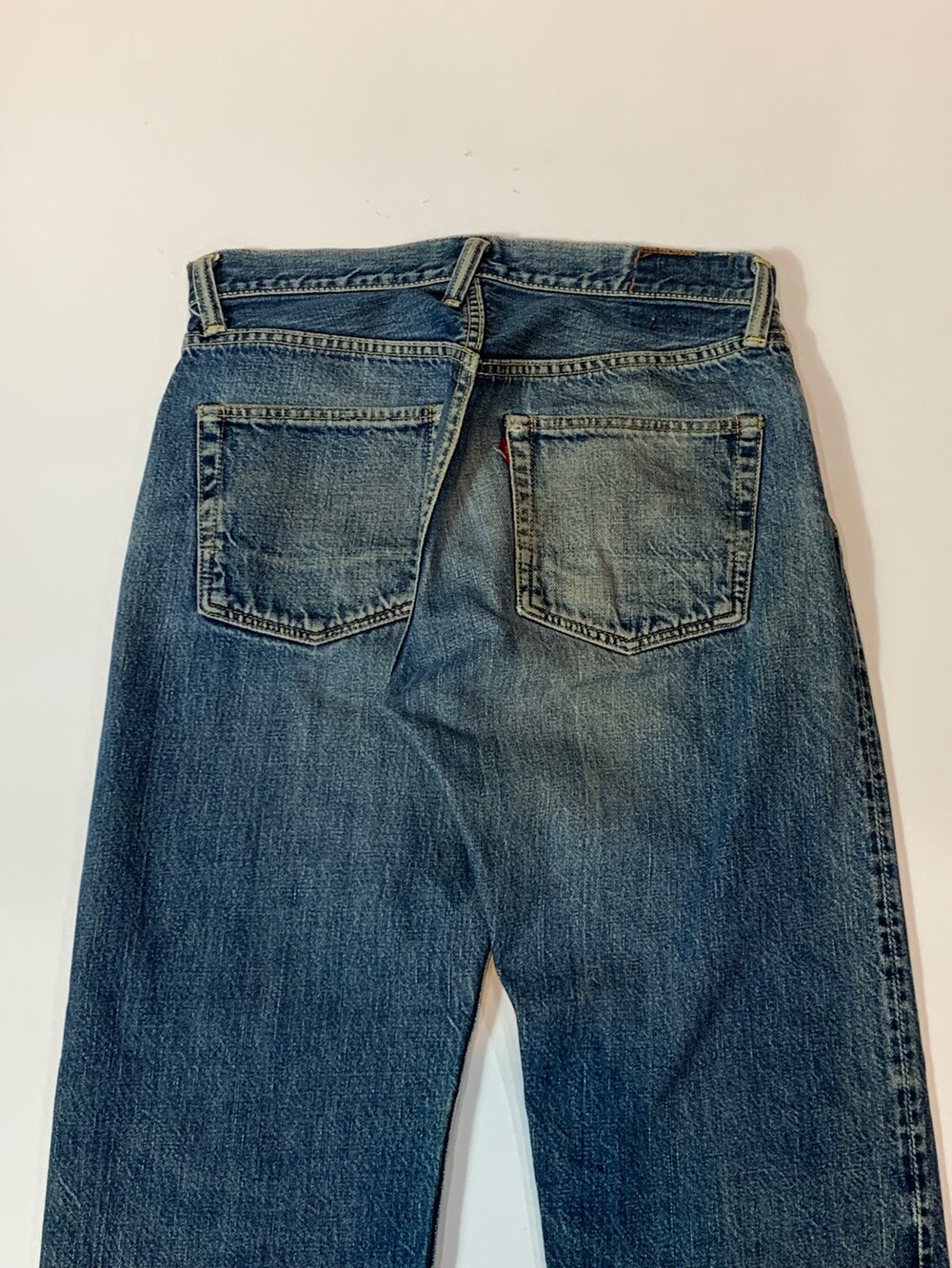 뒷면 패치가 떨어져 정확한 넘버링은 알 수 없으나 1950년대 생산된 히든버튼 사양 리바이스 501을 모티브로 삼은 에비수의 초창기 에비스(EVIS) 레드탭이 붙던 시절의 셀비지 데님팬츠. 빈티지 리바이스 데님팬츠를 연상케하는 페이딩과 질감이 돋보이는 제품입니다.