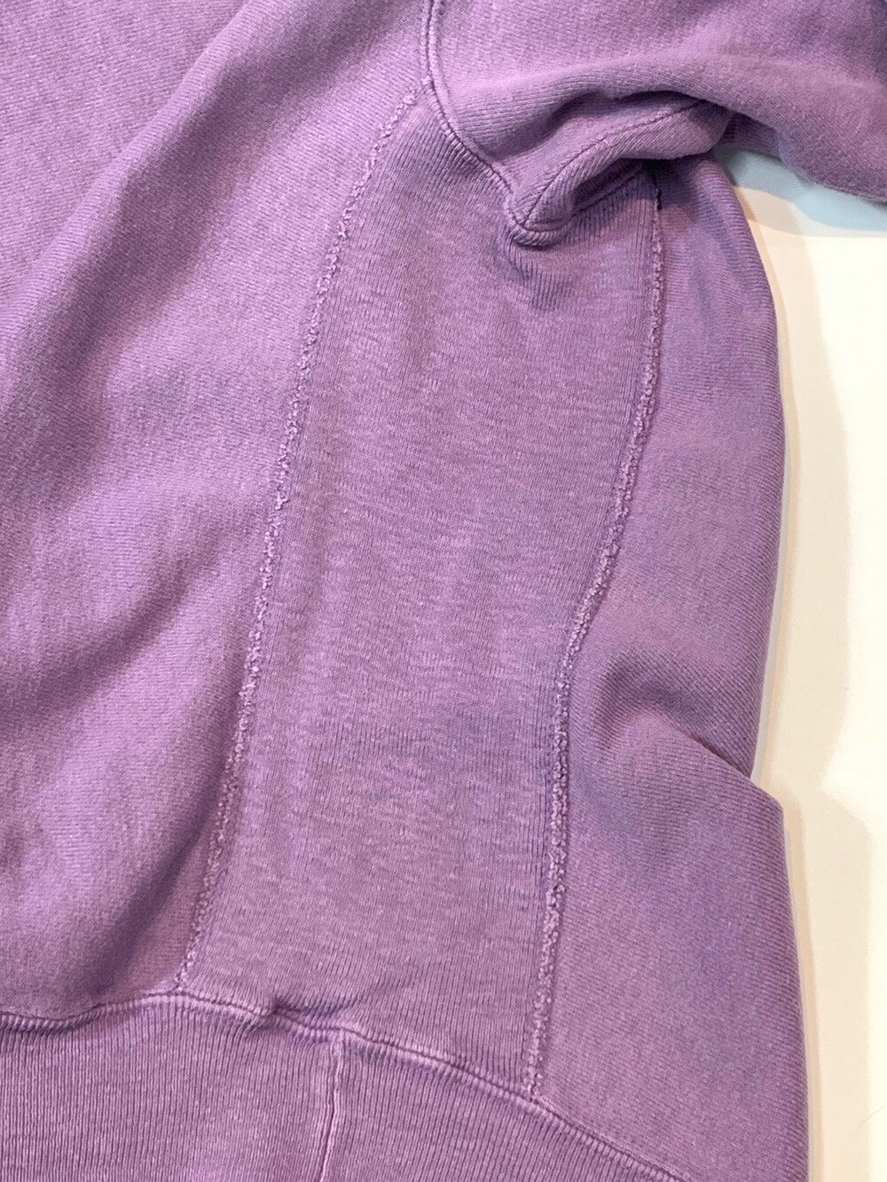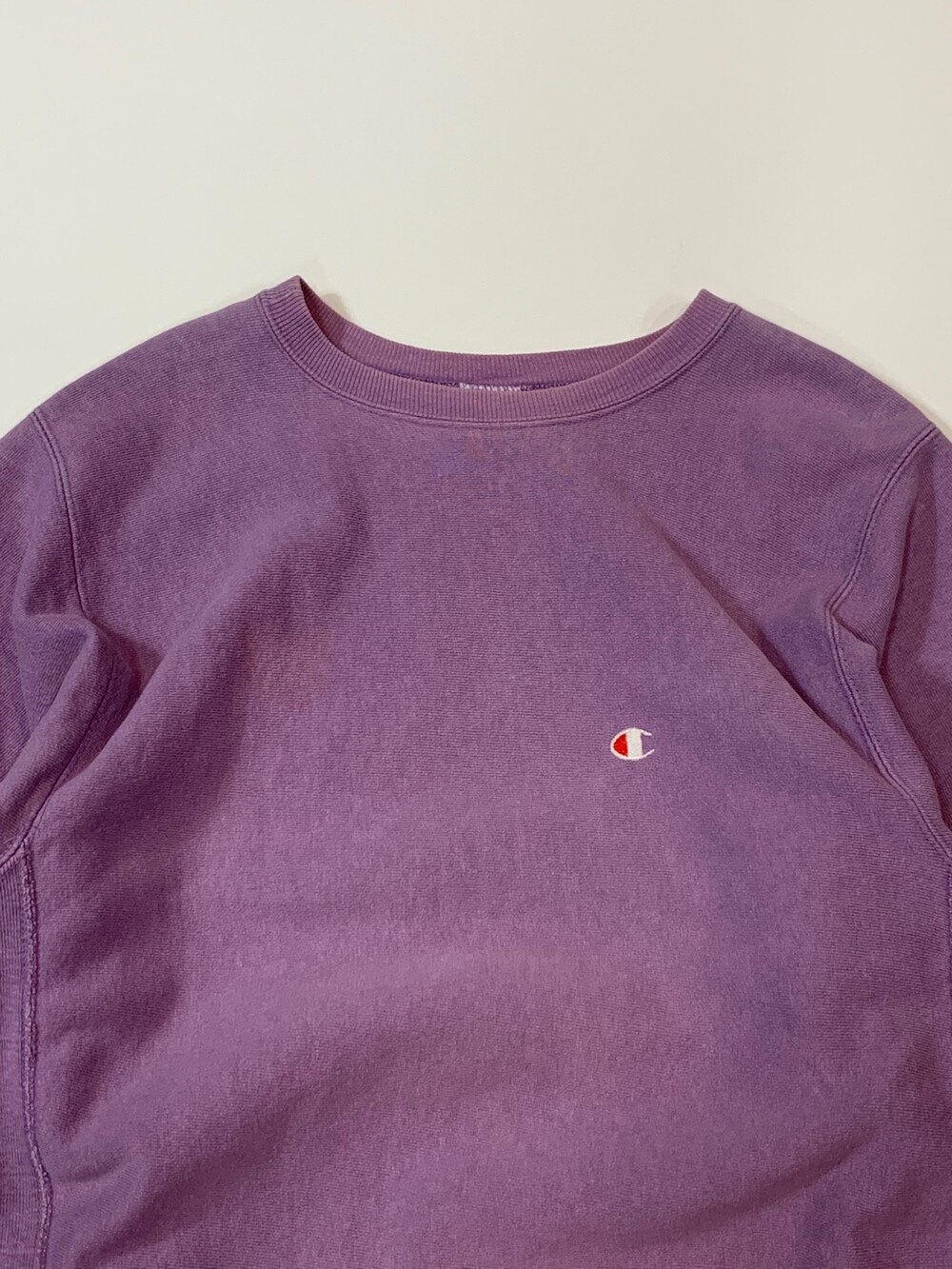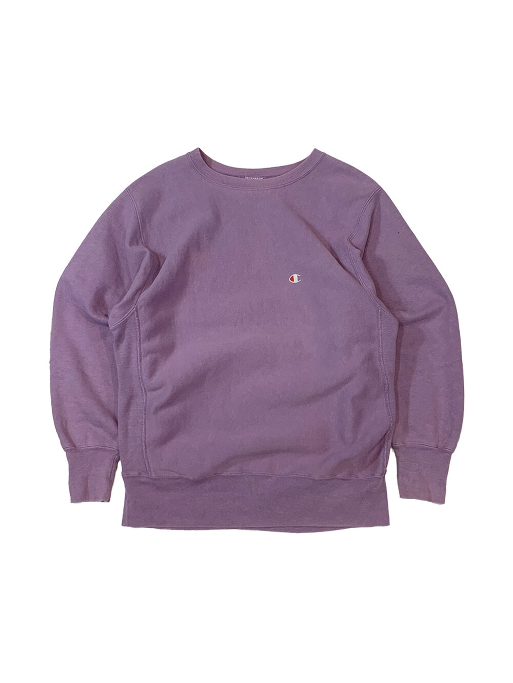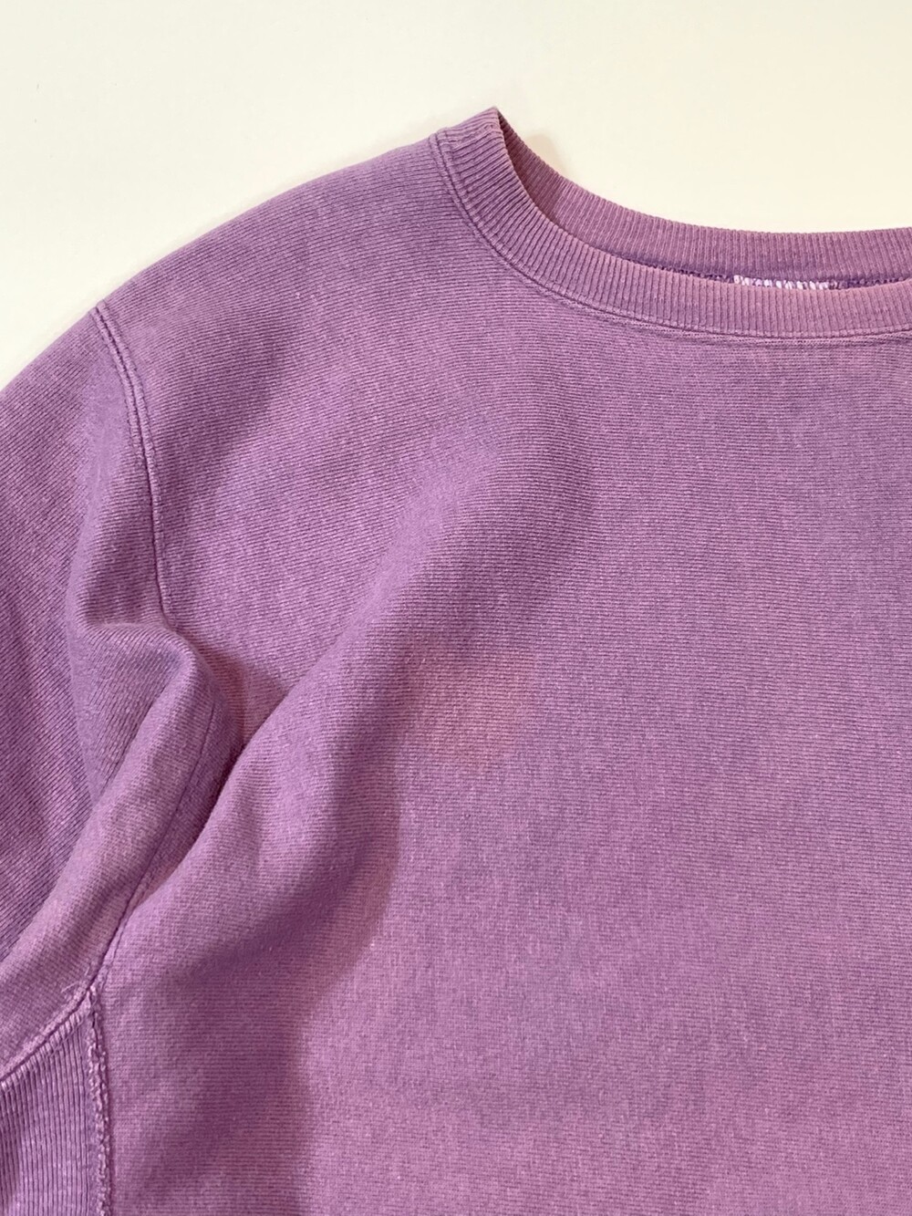몸판 원단 결이 가로방향을 향하도록 원단 재단방향을 90도로 돌려 재단하는 호리즌탈 위브 타입 중에서도 가장 대표적인 메이커인 챔피온의 리버스위브 스웻셔츠입니다. 옅은 라벤더 컬러가 돋보이는 제품입니다. (사진에 비해 실제로는 보다 옅은 색감을 가진 제품입니다.)