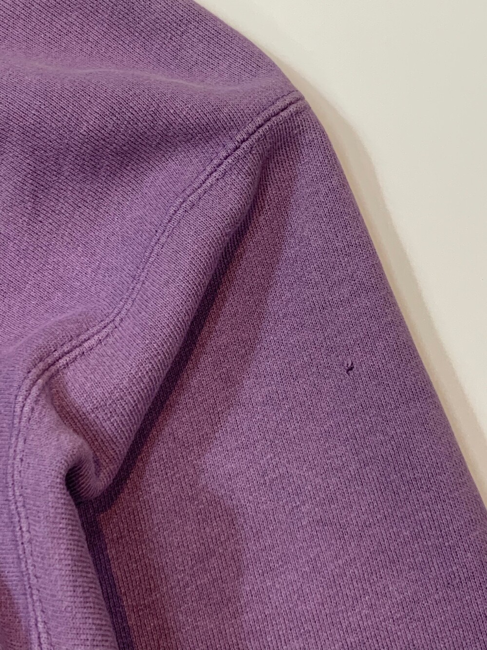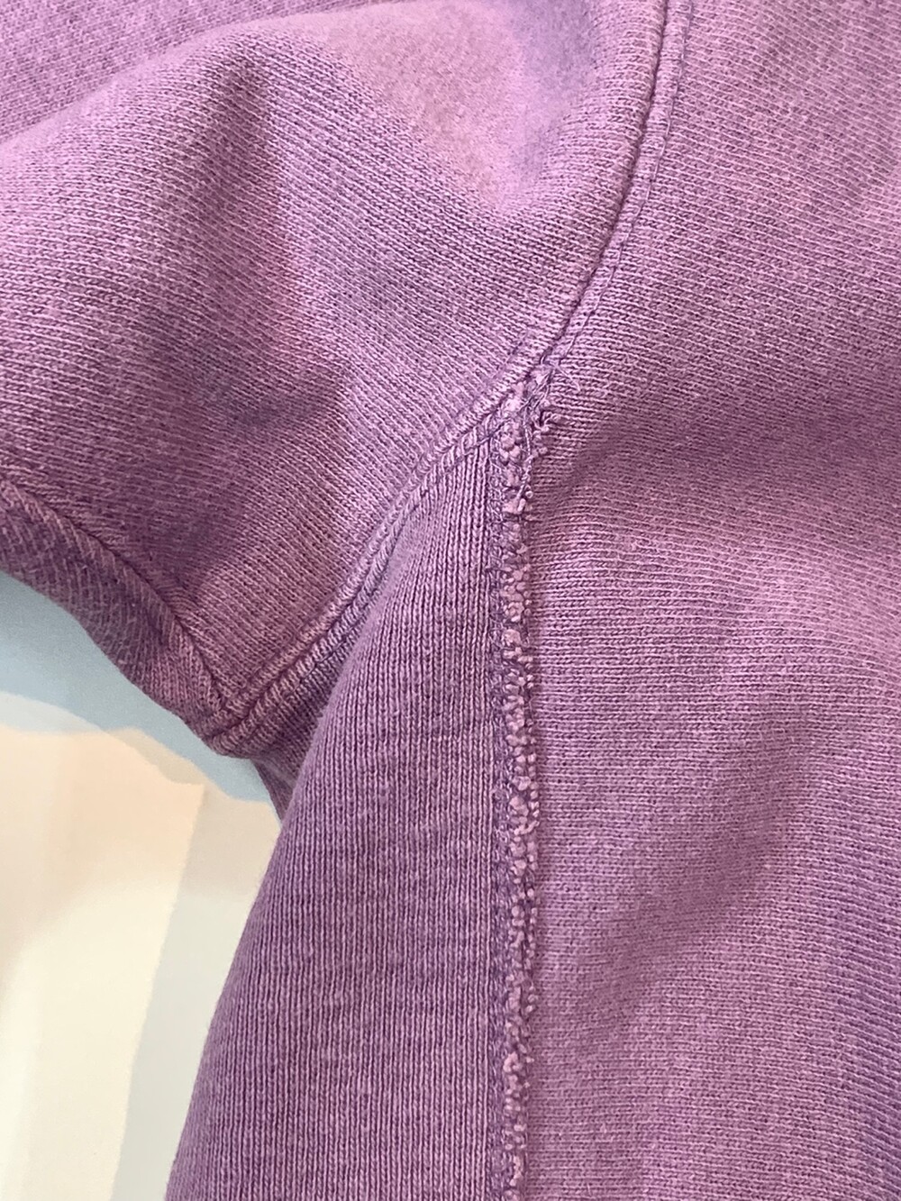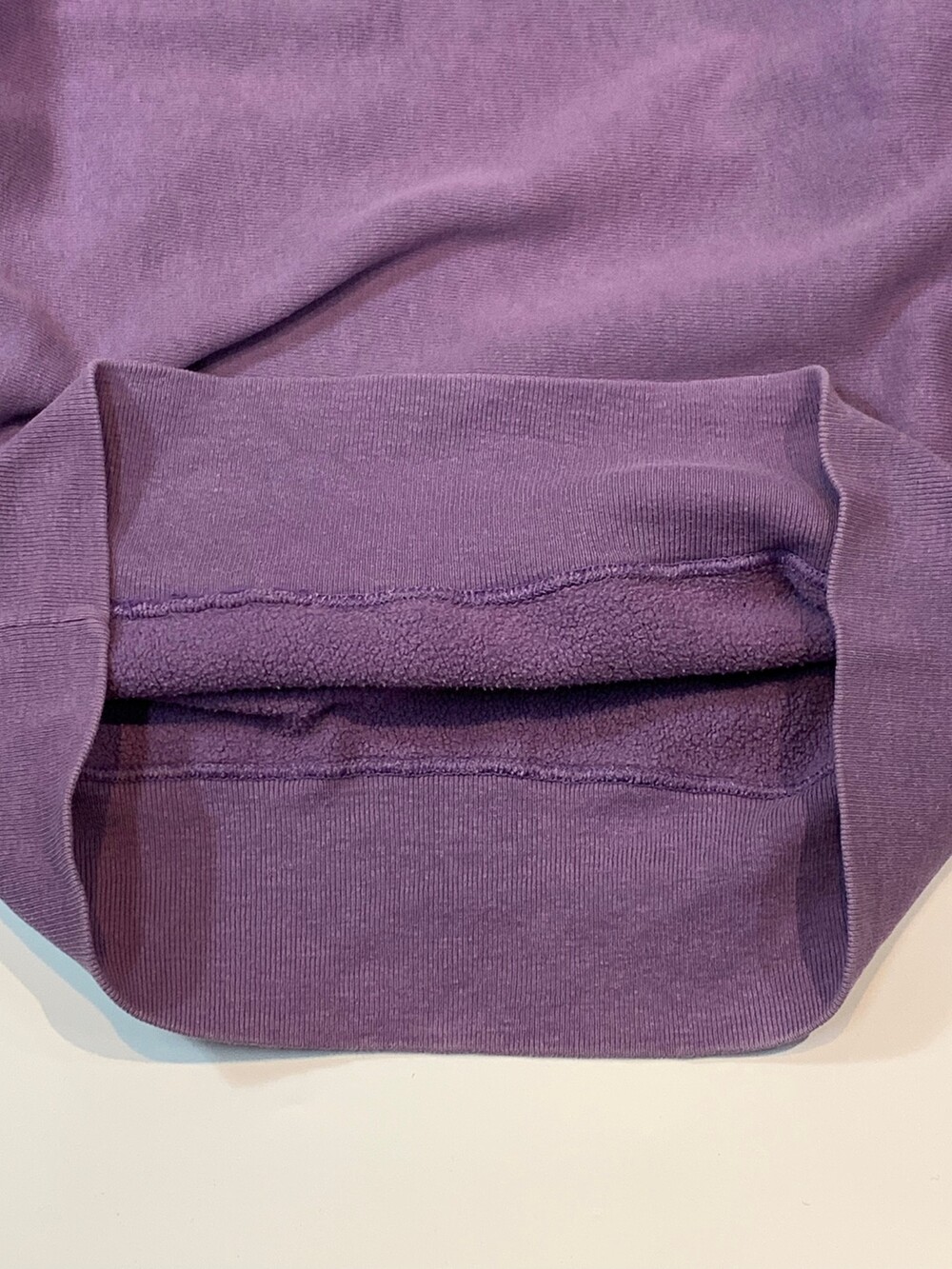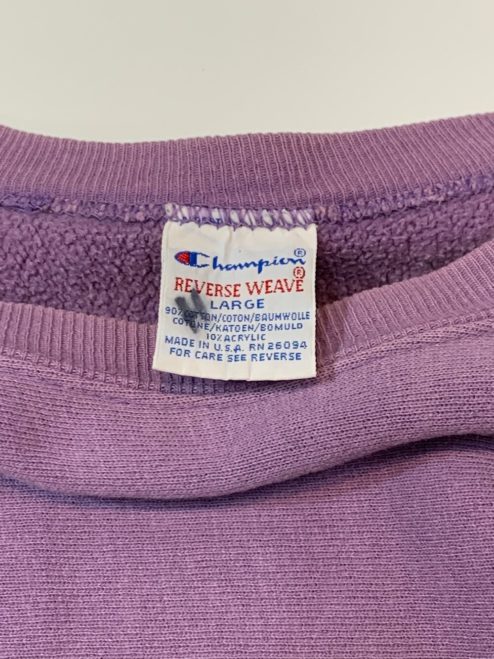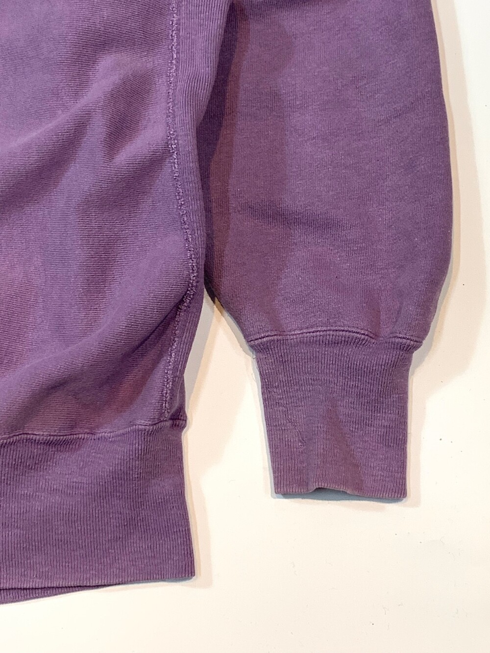 몸판 원단 결이 가로방향을 향하도록 원단 재단방향을 90도로 돌려 재단하는 호리즌탈 위브 타입 중에서도 가장 대표적인 메이커인 챔피온의 리버스위브 스웻셔츠입니다. 옅은 라벤더 컬러가 돋보이는 제품입니다. (사진에 비해 실제로는 보다 옅은 색감을 가진 제품입니다.)